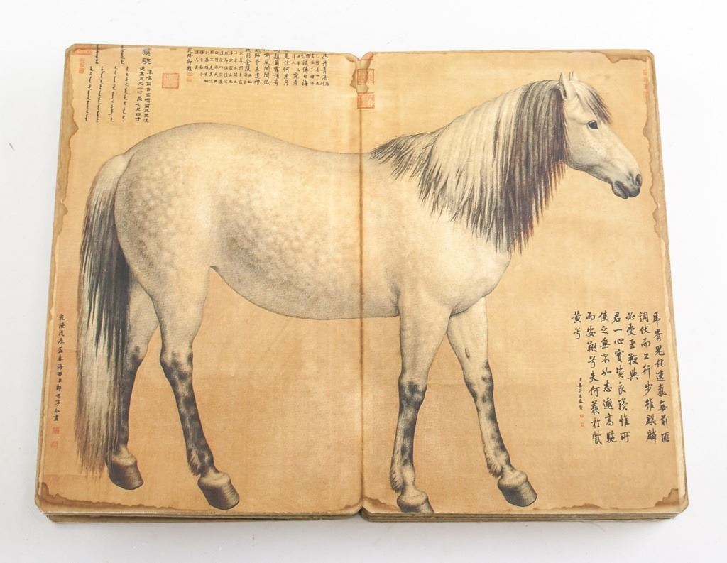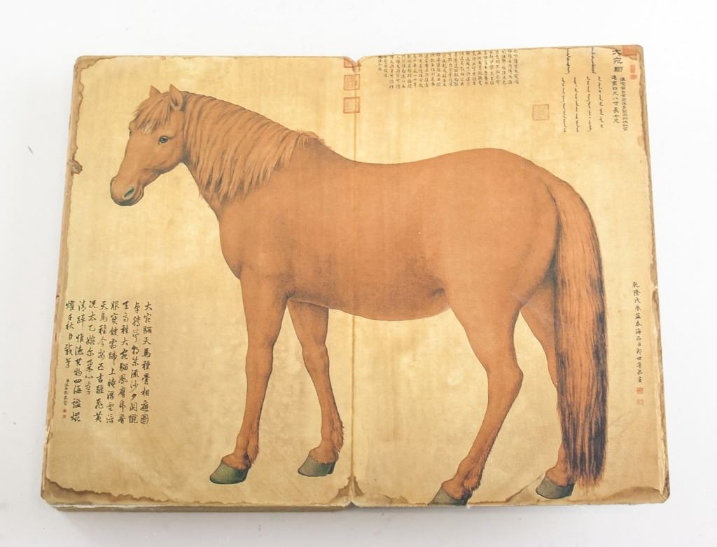 Chinese lithograph print on paper booklet. Featuring portrait of 18 horses. With notes and seals. 28 x 18 cm, 982g .
