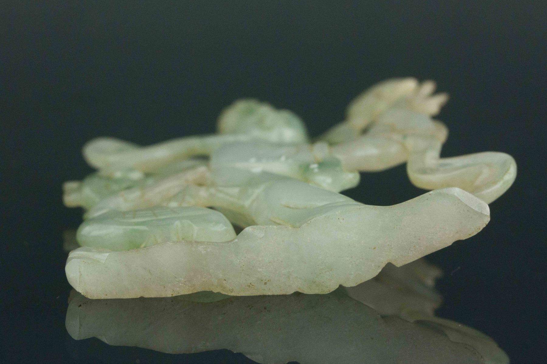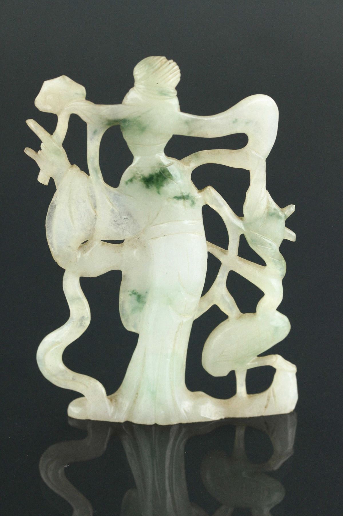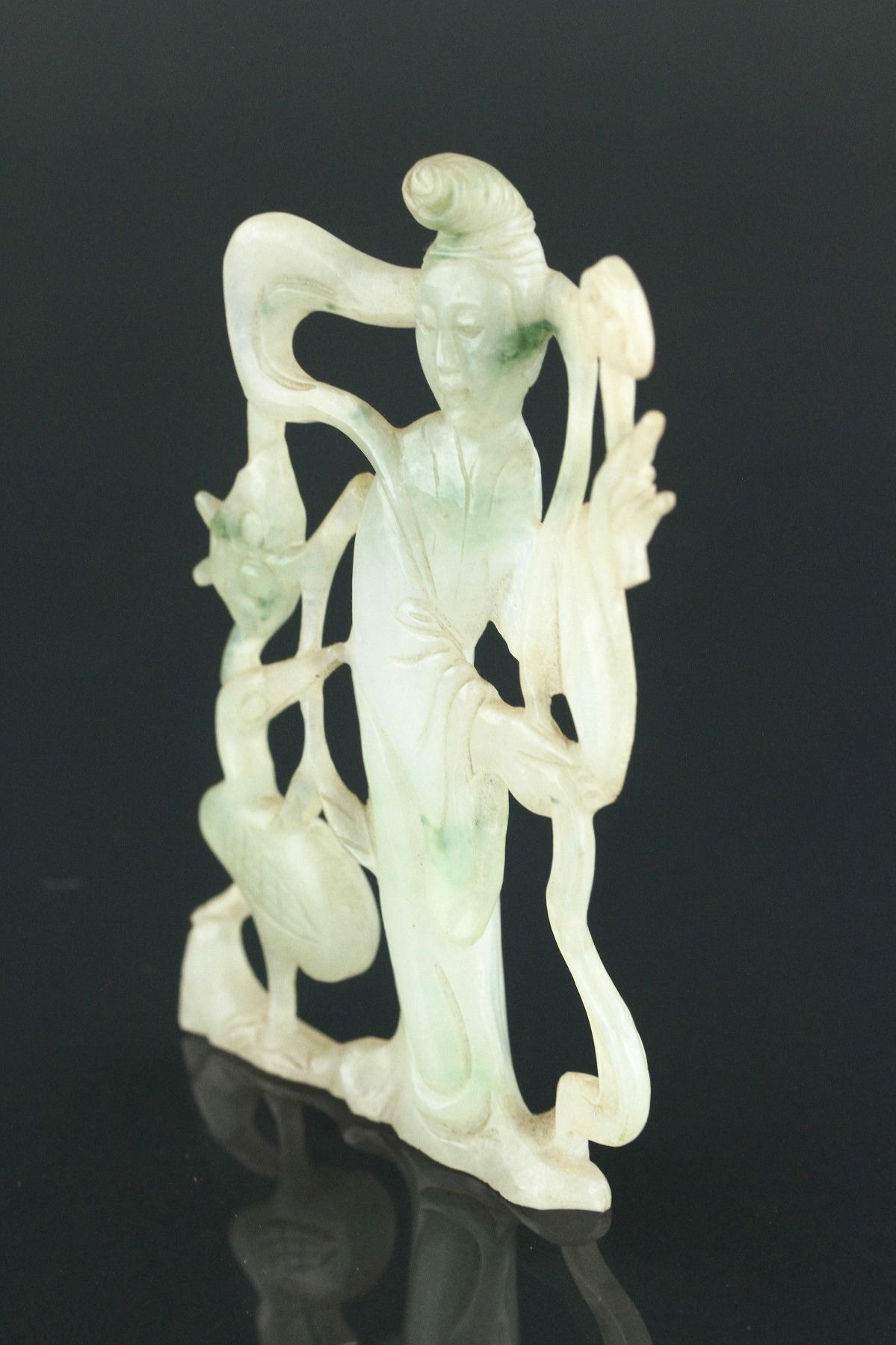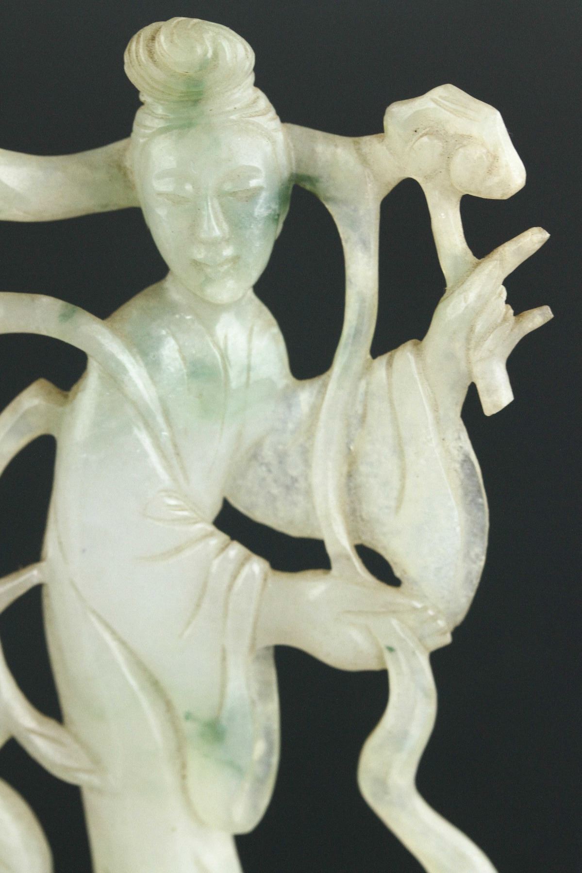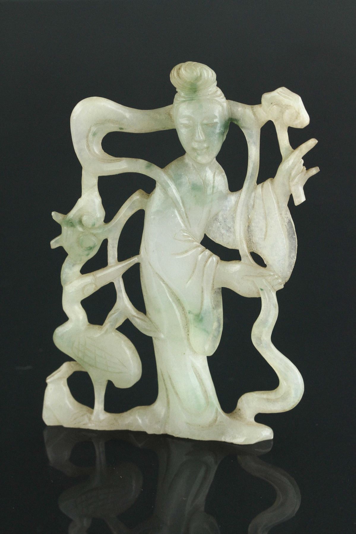 Chinese green jadeite carved pendant; 18th century; featuring openwork carved fairy with crane; of pale green tone with spinach green suffusions; H: 10 cm, W: 6 cm, 51 grams; Density: 3.31