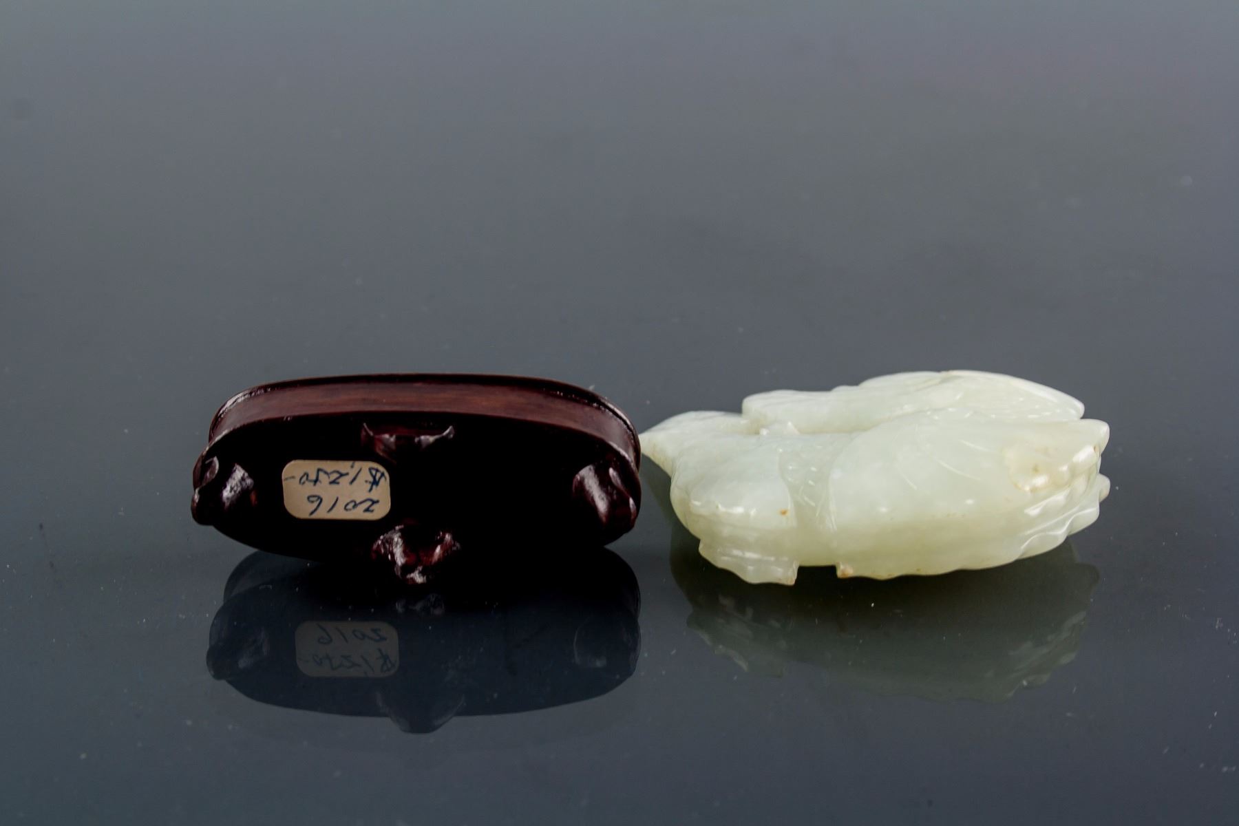 Chinese Hetian white jade carved statue; carved in a Makara in ocean; of white tone; with customized wood stand; 18th century; 6 cm x 5.5 cm, 61 grams
