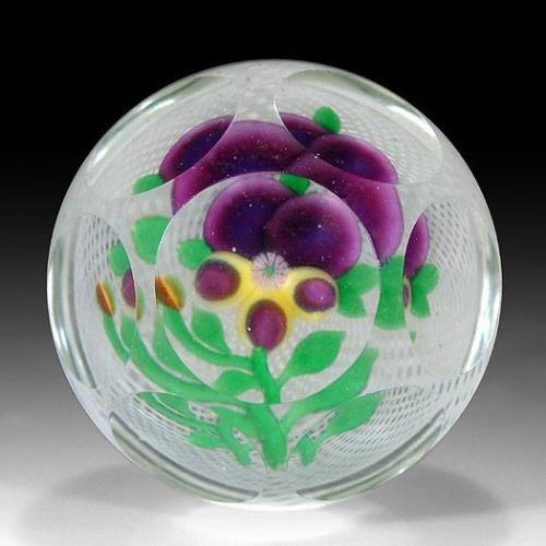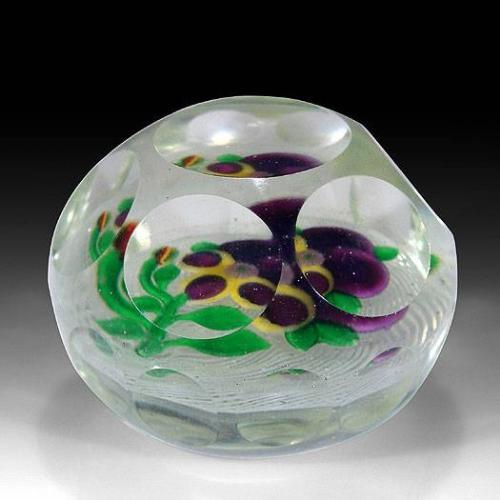 Chinese faceted pansy paperweight, circa 1940's, with a purple and yellow pansy, a red and yellow bud, green leaves, and stem, on a double-swirl white latticinio cushion. Top facet and two rows of side facets. Diameter 2 3/4".