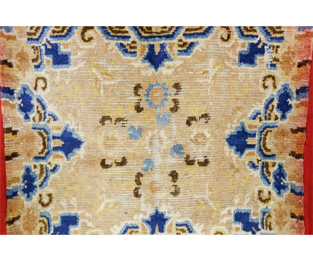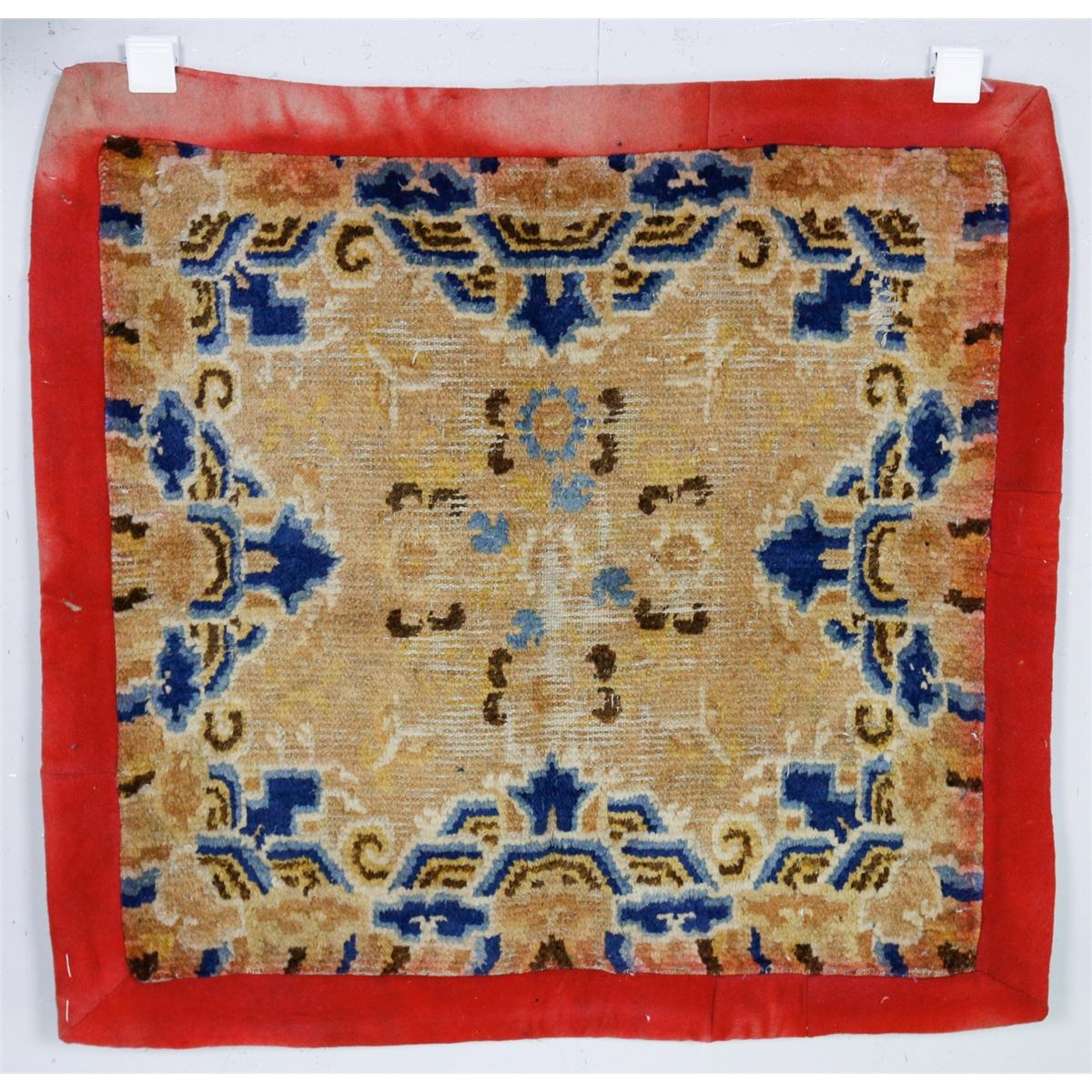 Chinese area seating rug; featuring geometrical flower patterns; with red border; 19th century; 75 cm x 78 cm, 1 kg