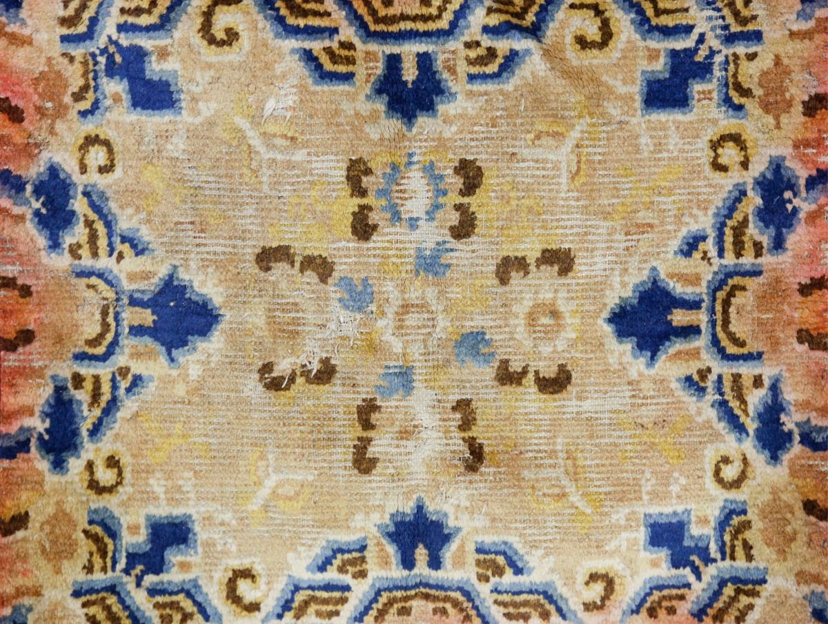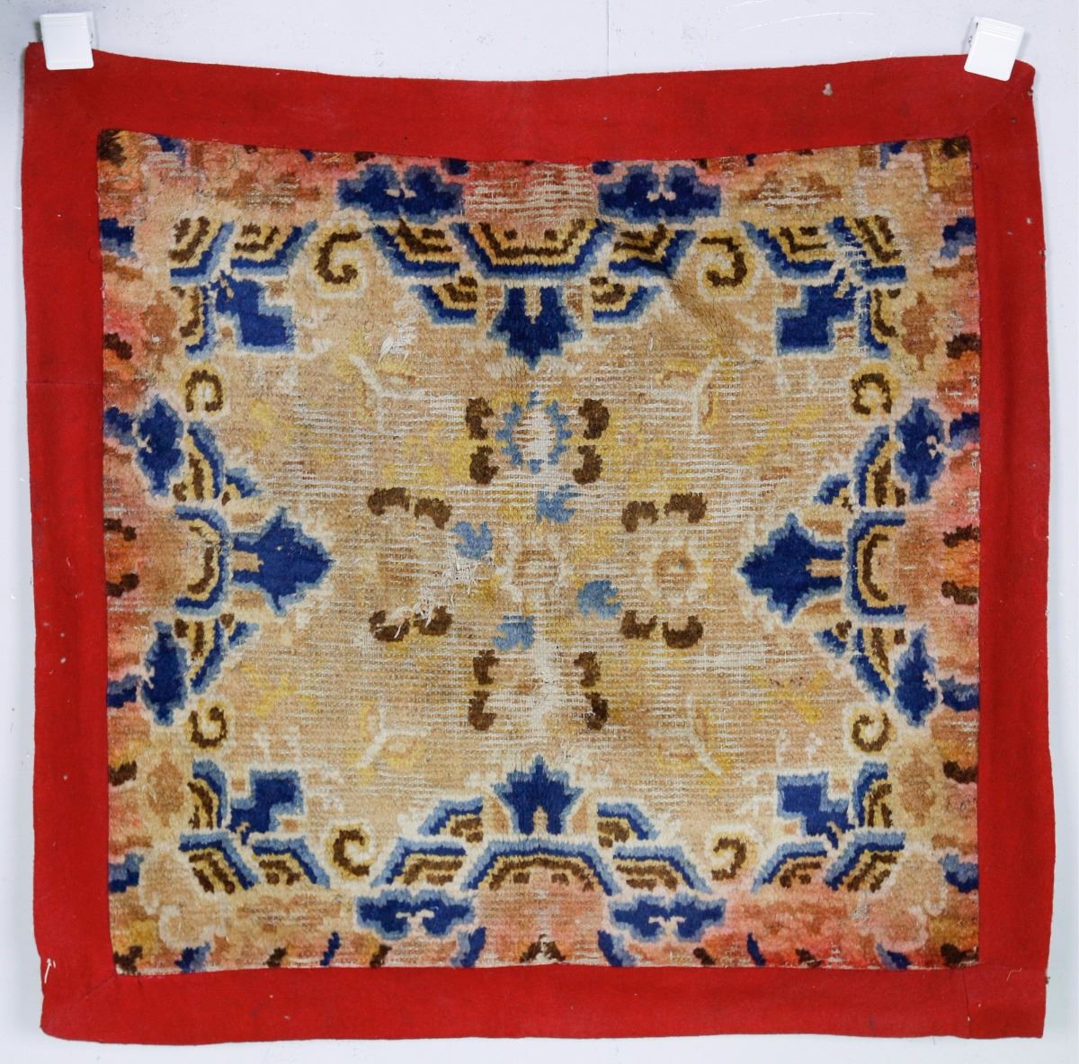 Chinese area seating rug; featuring geometrical flower patterns; with red border; 19th century; 76 cm x 79 cm, 2 kg