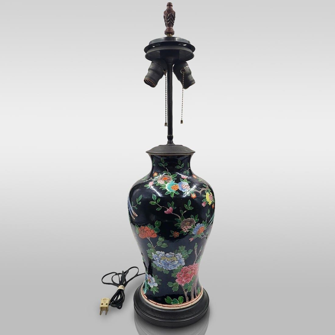 ***RE-LISTED DUE TO BUYER FORFEITING THE ITEM*** Chinese 19th C Famille Noire Vase Converted To Table Lamp. Ornately decorated with peacocks and floral motif. Measures approximately 29" tall x 9" wide.