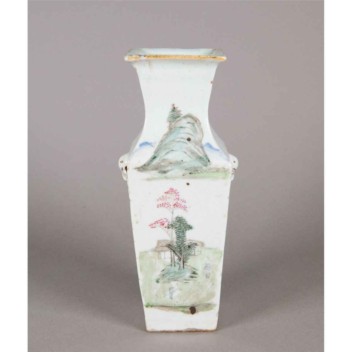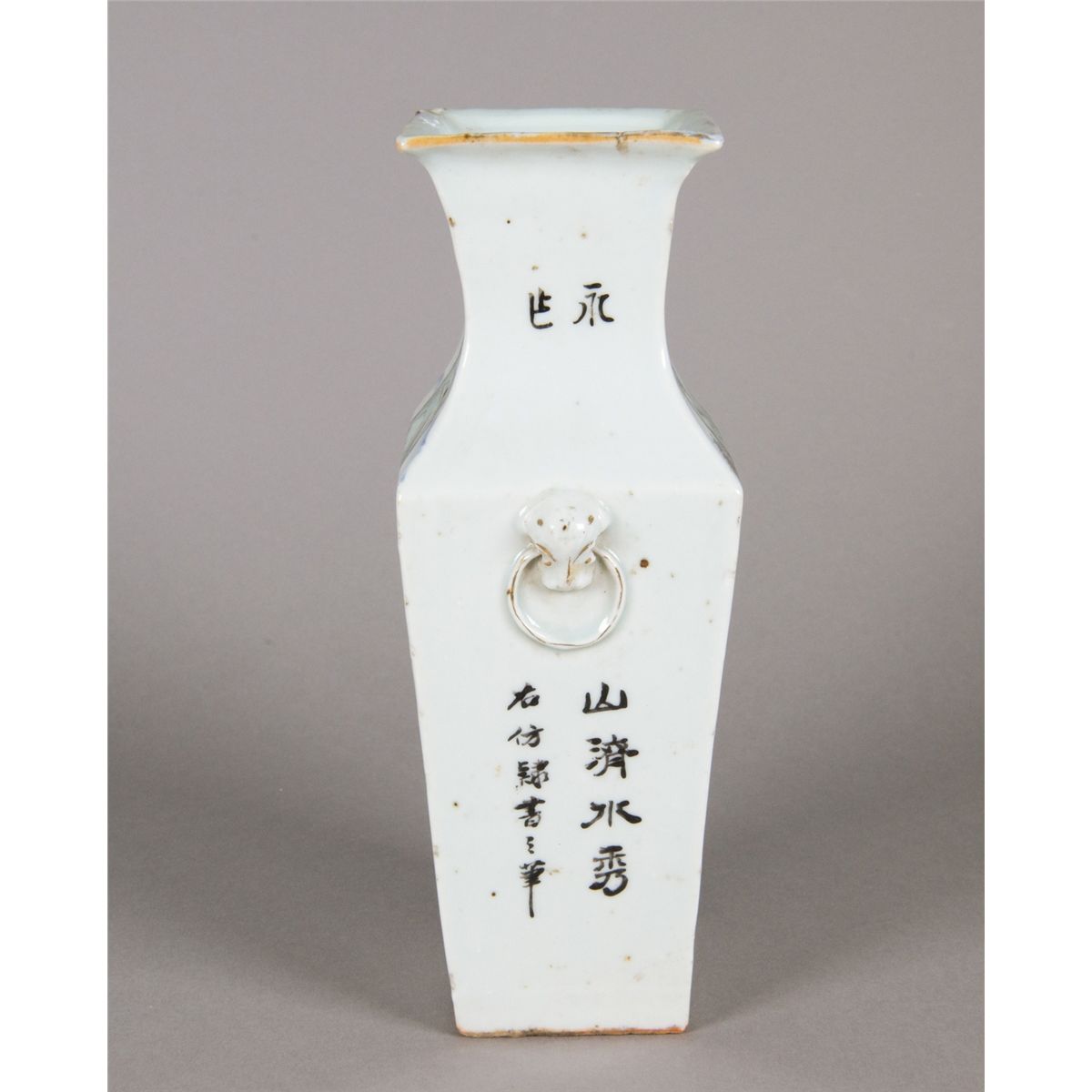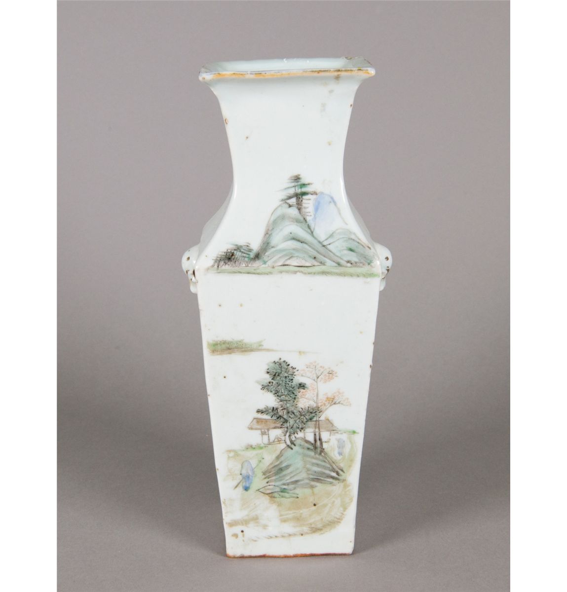 Chinese 19th century Famille Rose porcelain square vase; double Chilong handles on sides; featuring village scene on body; signed Yuan Binsheng on side; two red seals on base; H: 23.3 cm, W: 8.2 cm, L: 8.2 cm, 709 grams