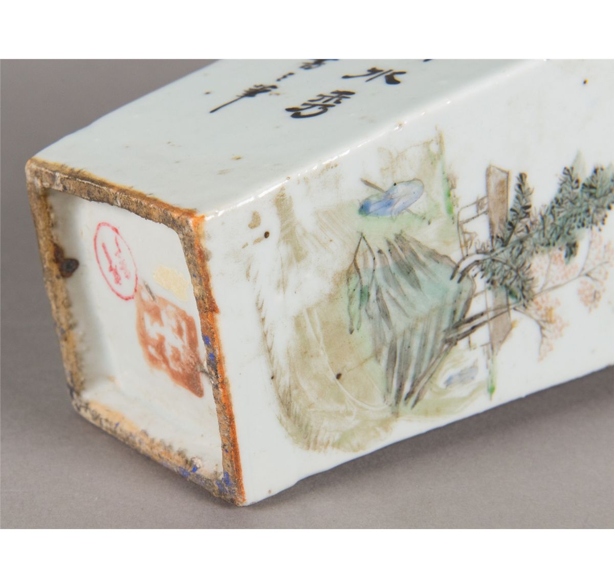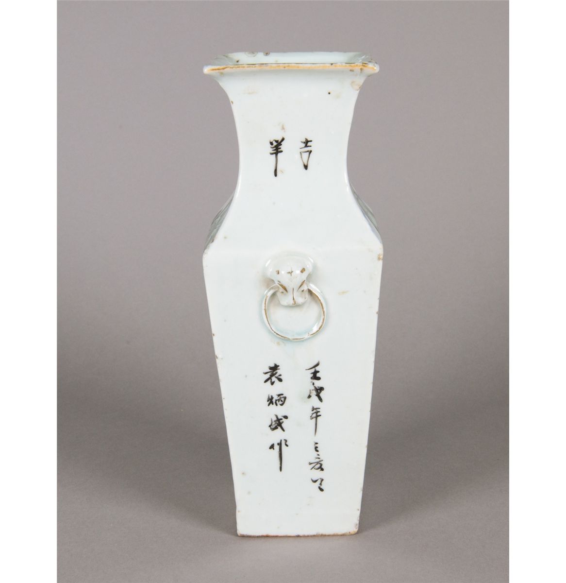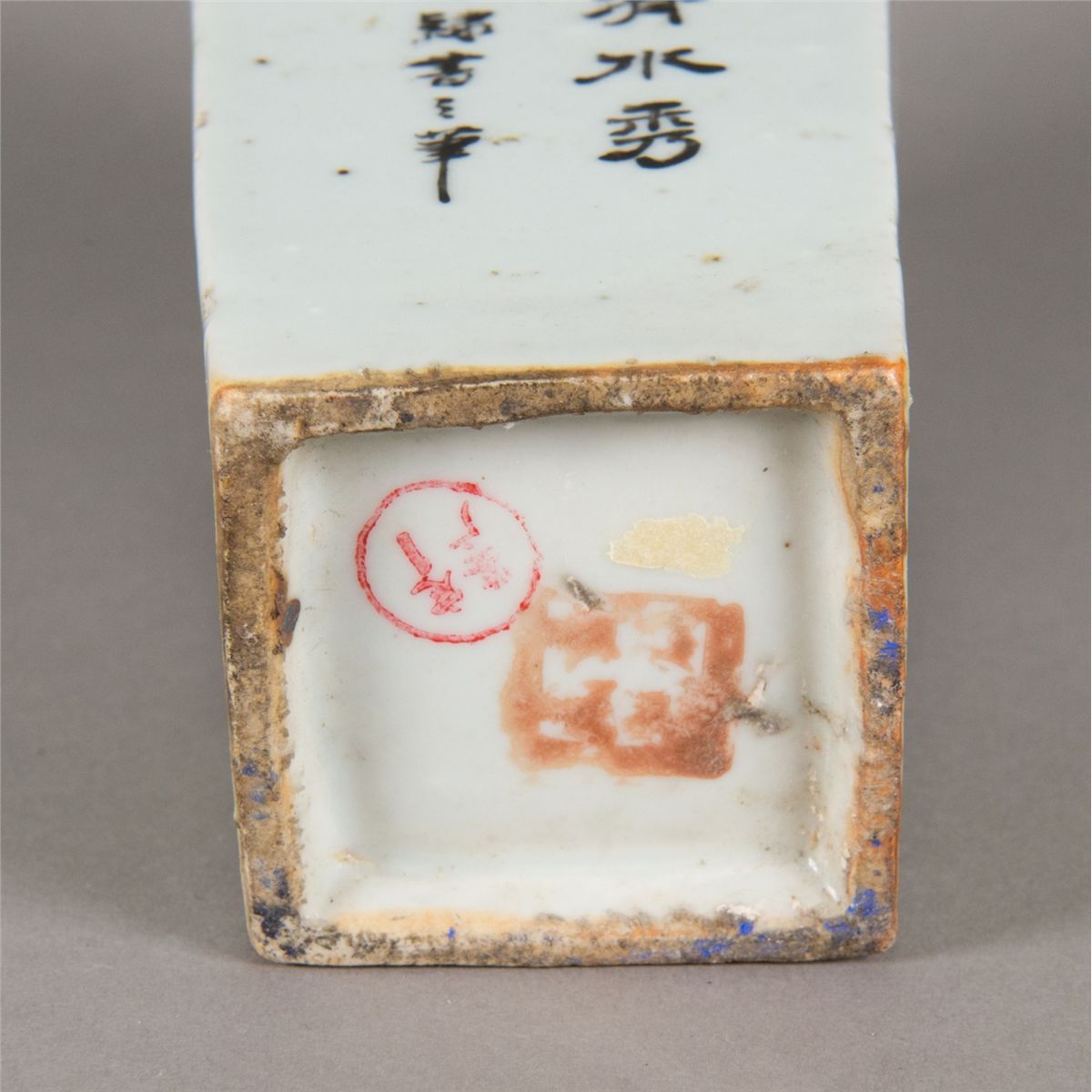 Chinese 19th century Famille Rose porcelain square vase; double Chilong handles on sides; featuring village scene on body; signed Yuan Binsheng on side; two red seals on base; H: 23.3 cm, W: 8.2 cm, L: 8.2 cm, 709 grams