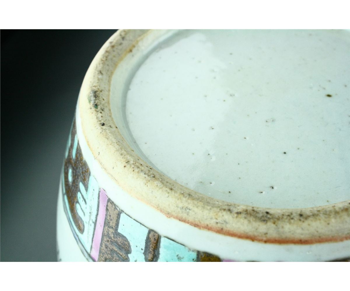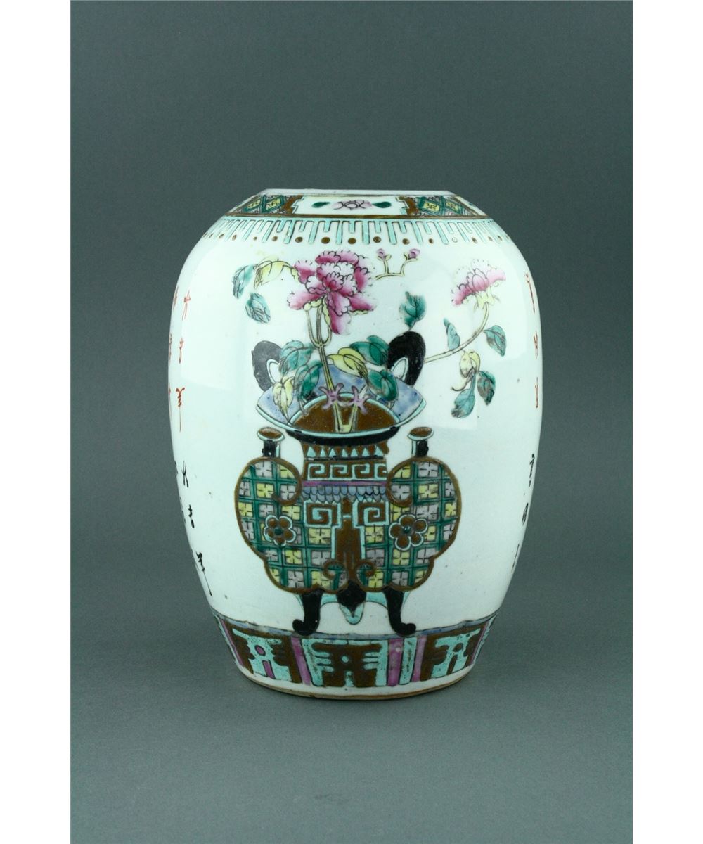Chinese 19th century Famille Verte porcelain jar; of oval form with high-raised shoulder; featuring Hundred Antiques Pattern (Bogu) on body; H: 42 cm, W: 28 cm, D: 21 cm, 2520 grams