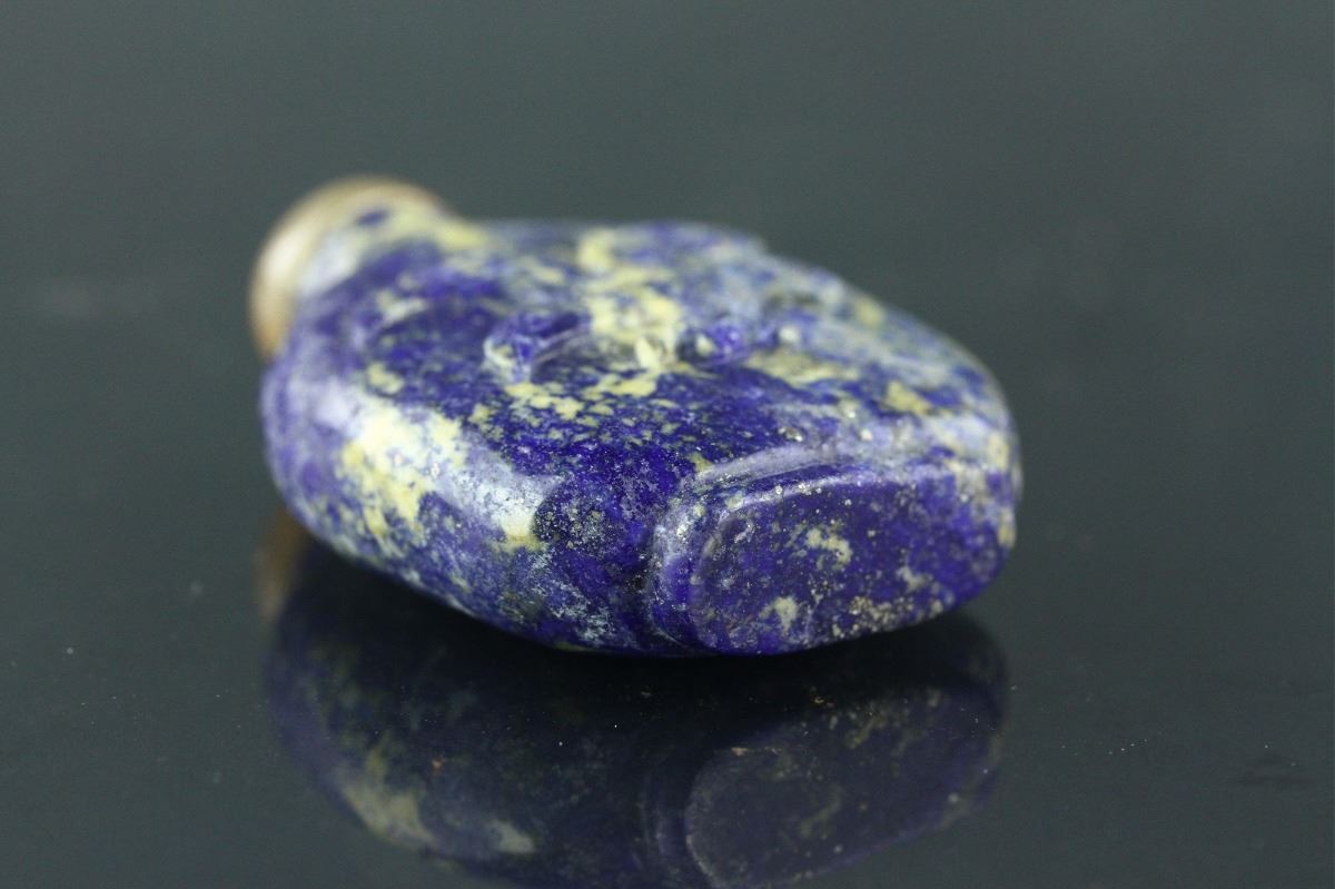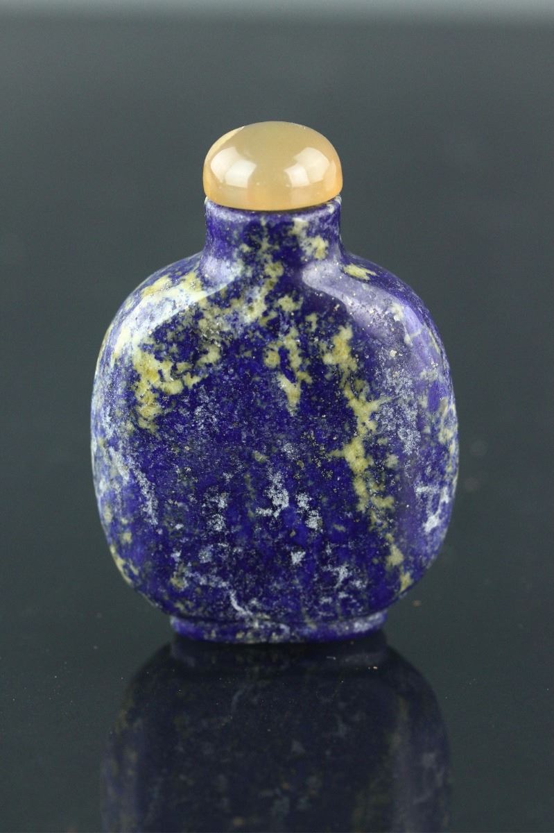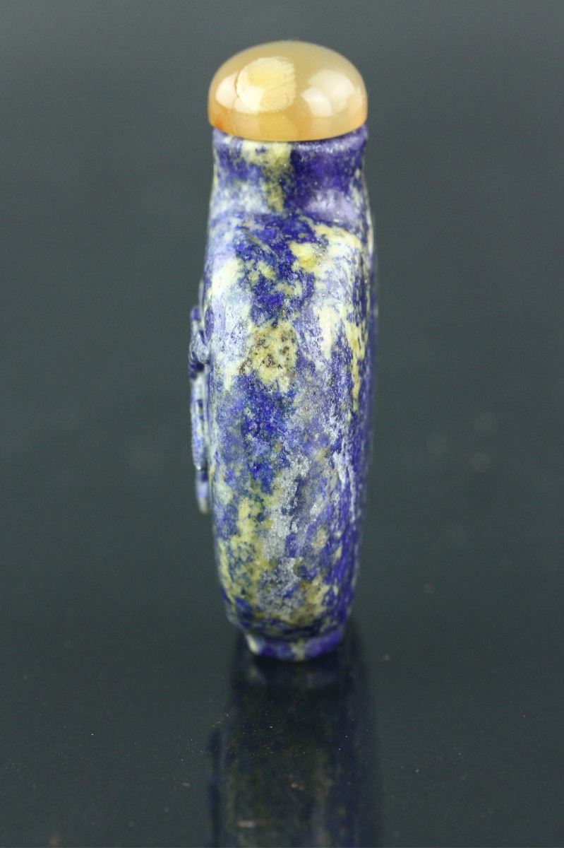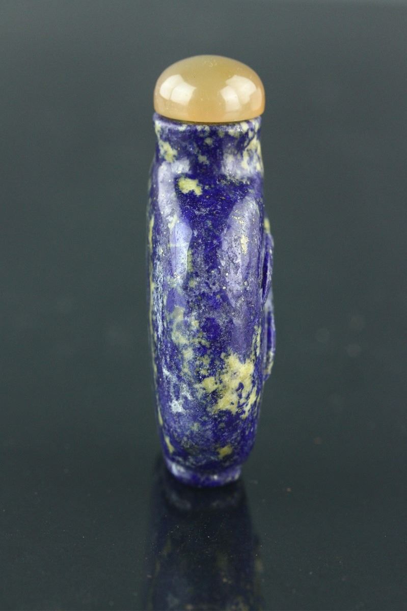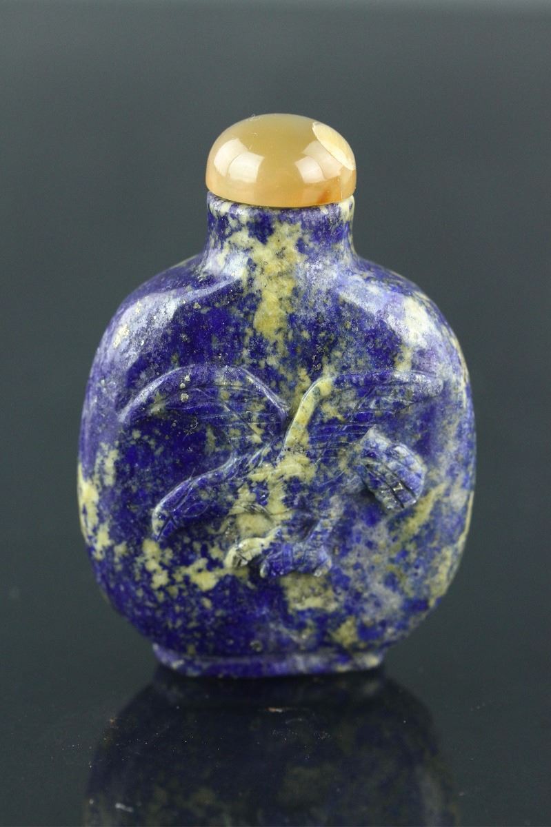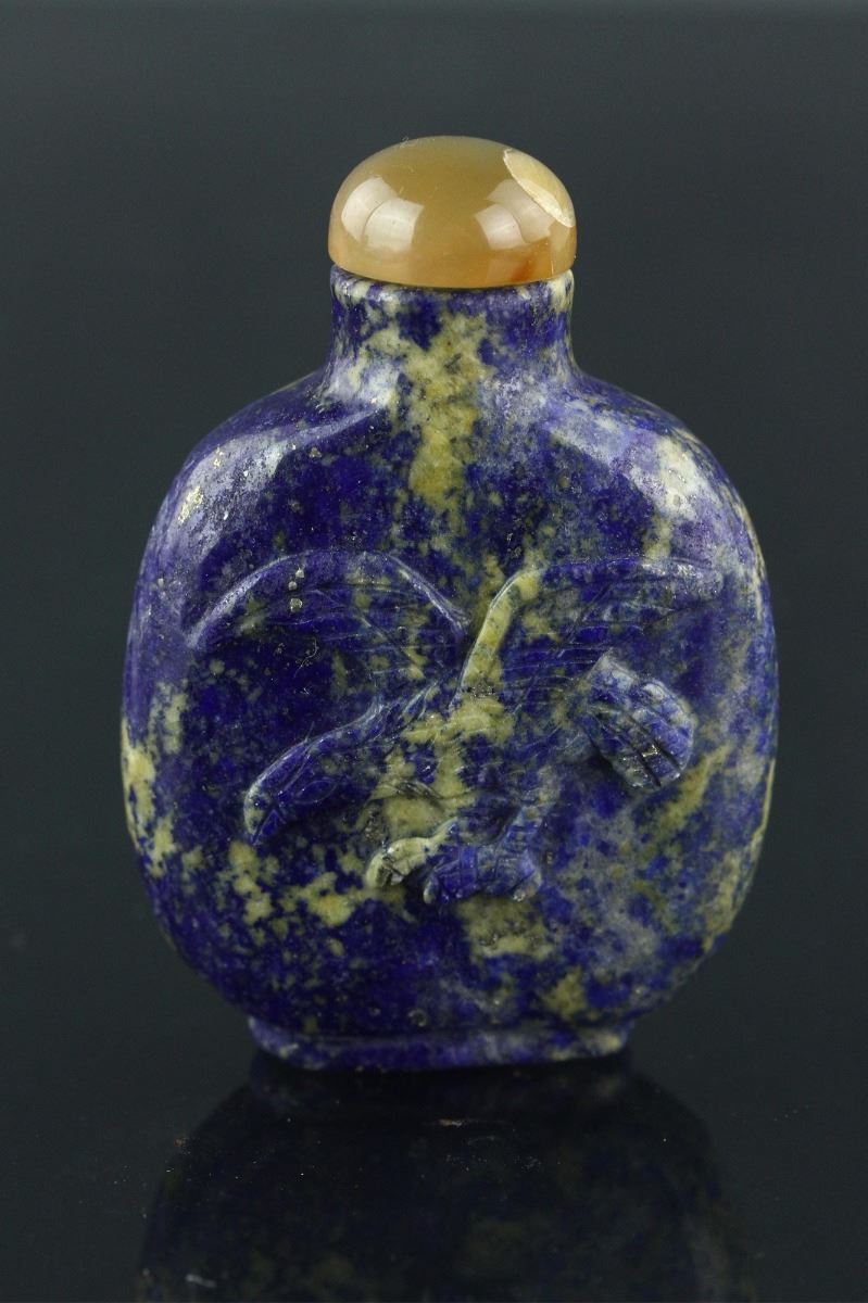 Chinese lapis lazuli snuff bottle; 19th century; of oval form; with carvings of eagle in low relief; H: 6 cm, W: 5 cm, 60 grams