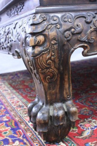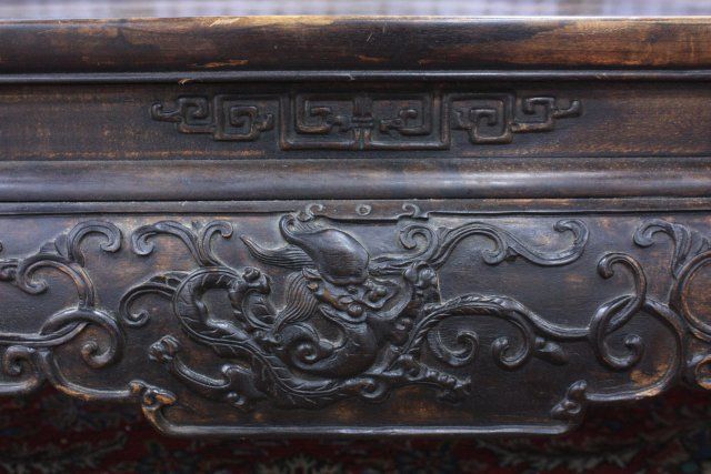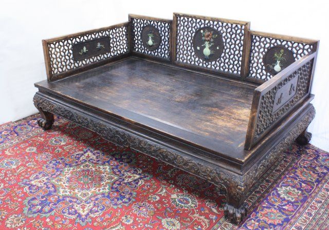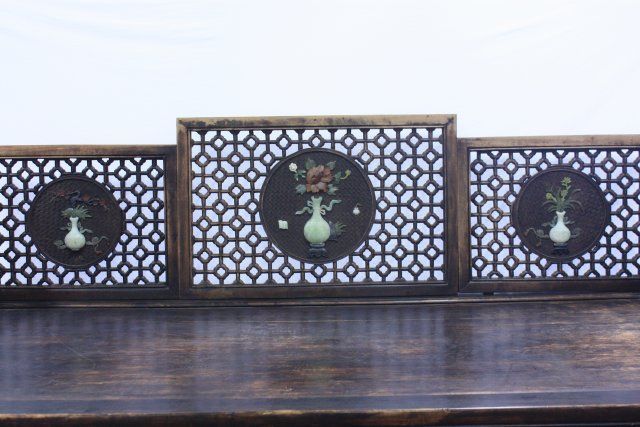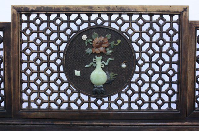 Heavily carved with vase & floral design. With jade & other precious stones, open pierced back, "Dragon" carved apron, pronounced ball & claw leg, finish commensurate with age. Approx. 53" D x 88" W x 41.5" H. Please read our terms of sale.