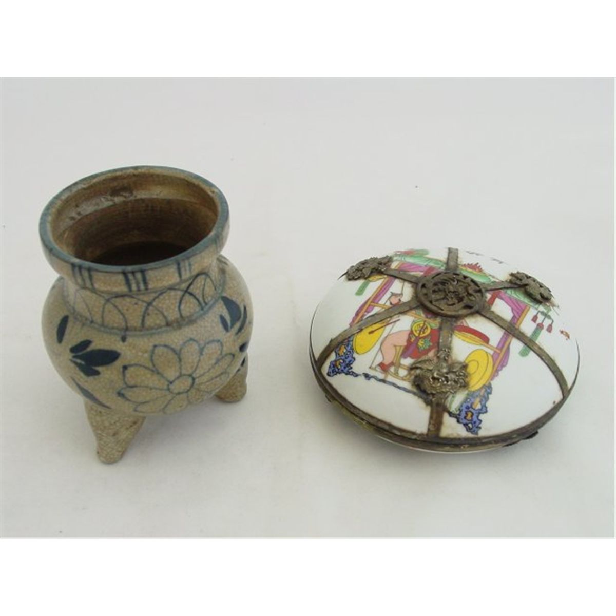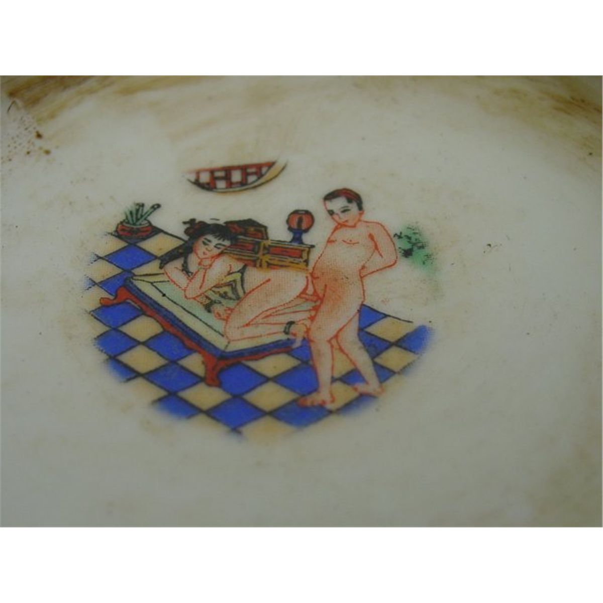 Jar has erotic scenes, approx. 4.75" Diam x 1.5" H. Vase approx. 3.75" H. Please read our terms of sale.