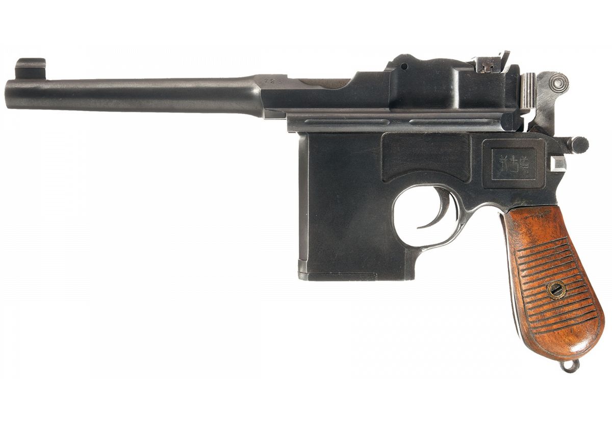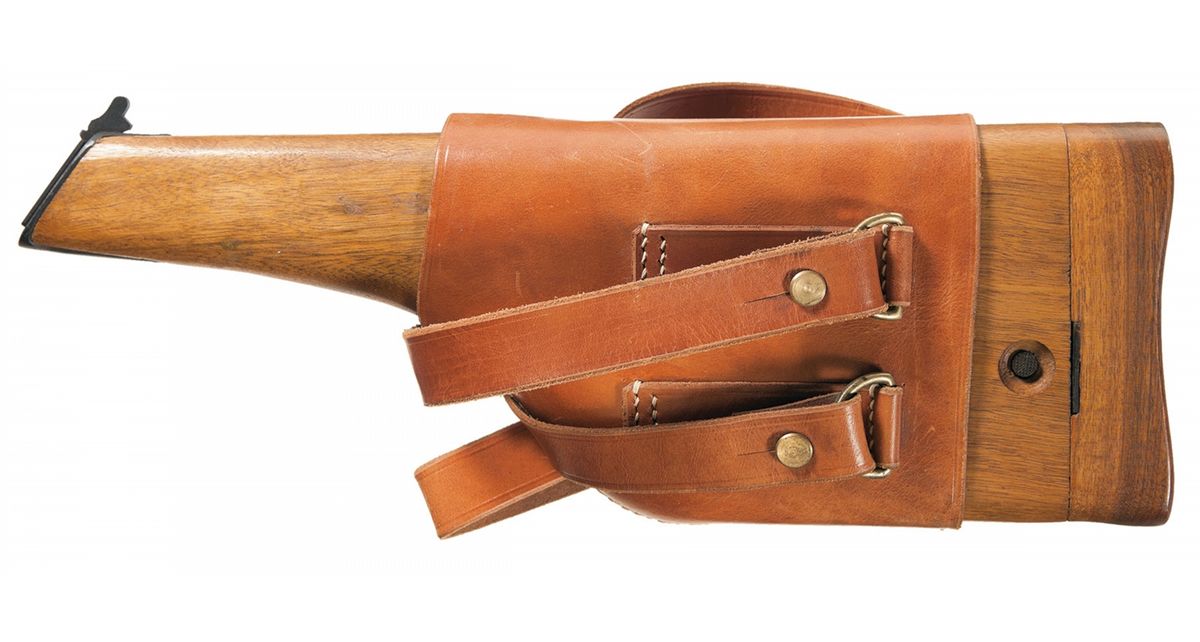 Condition: Excellent with 95% of the blue finish remaining overall with wear on the edges and high spots. The grips are also very fine with minimal handling marks overall. Mechanically excellent. The wooden shoulder stock and leather harness are also excellent with minimal handling marks.