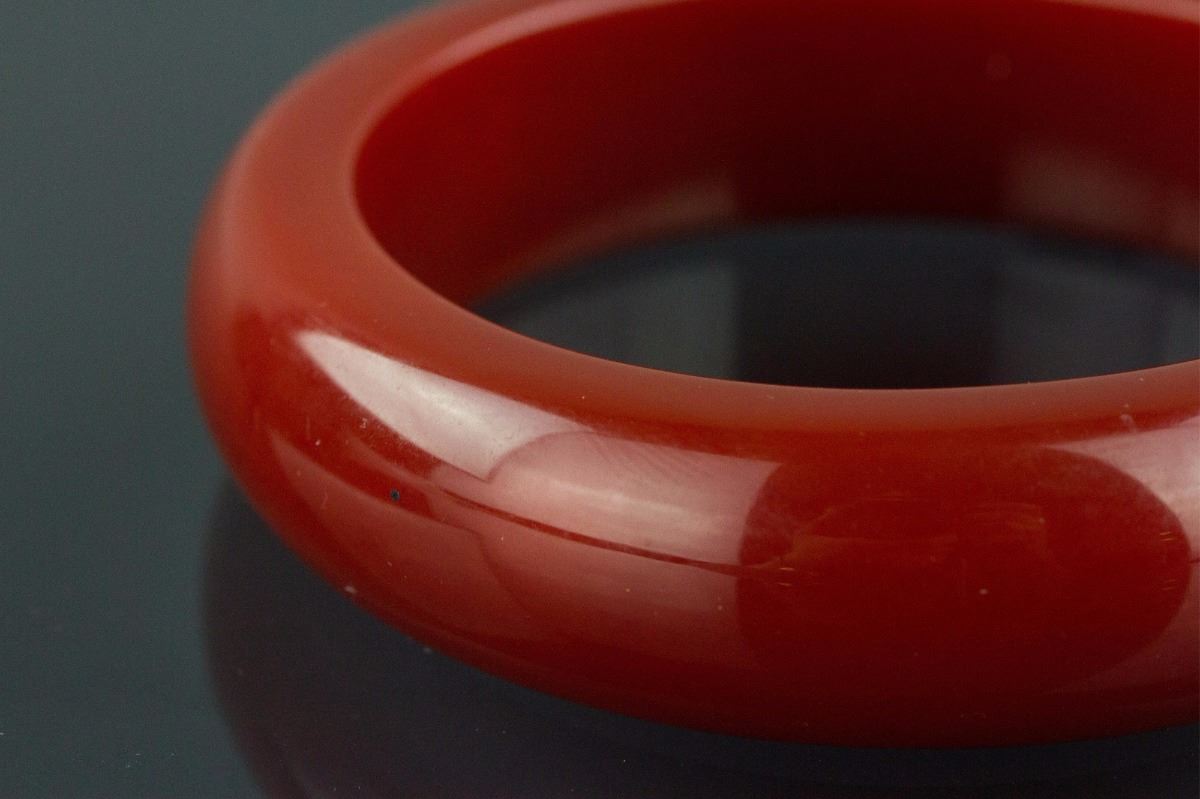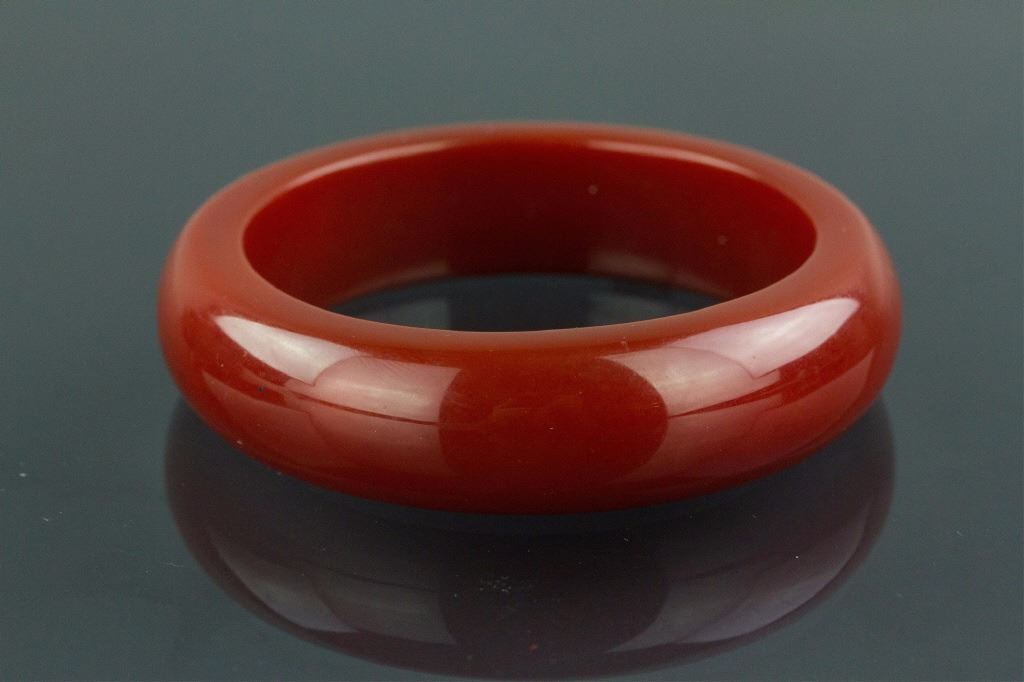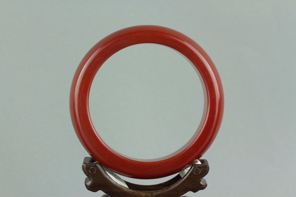 Chinese red agate bangle; rounded outside and flatten inside; Inner D: 7 cm, Outer D: 9.5 cm, 147 grams