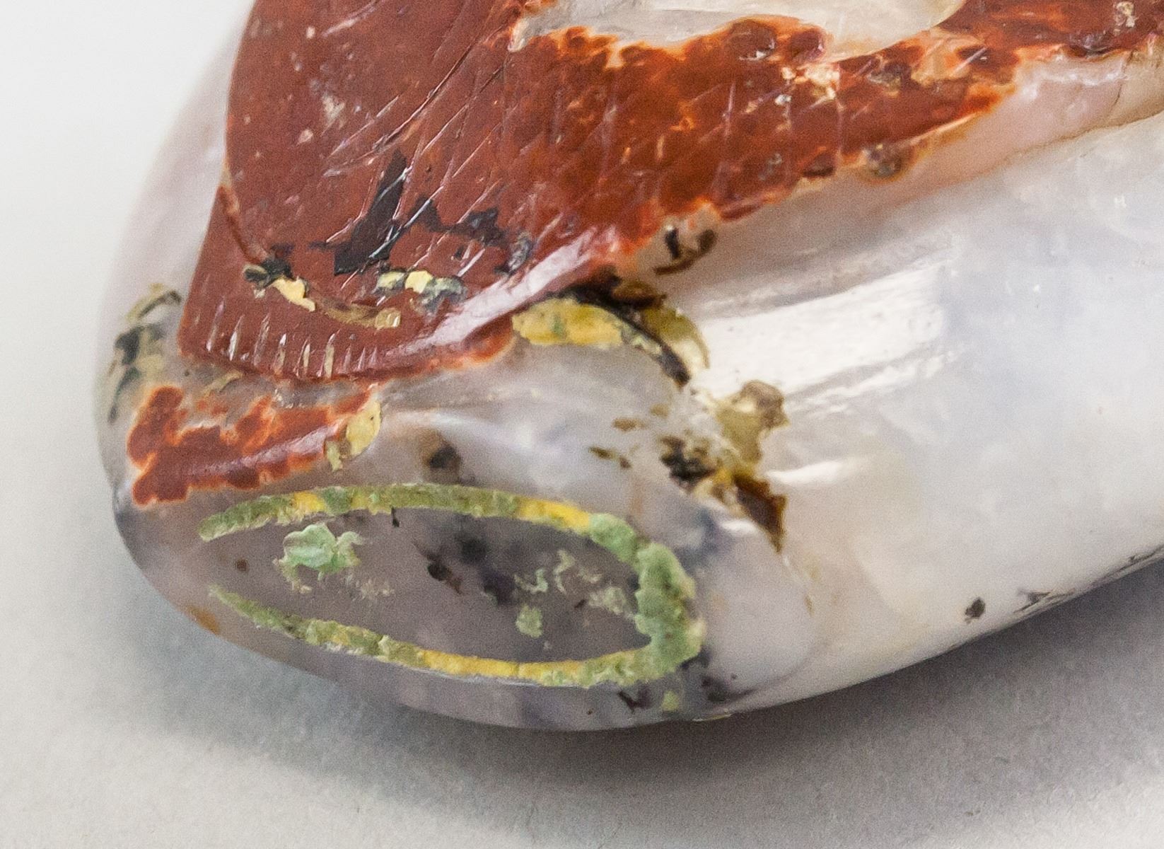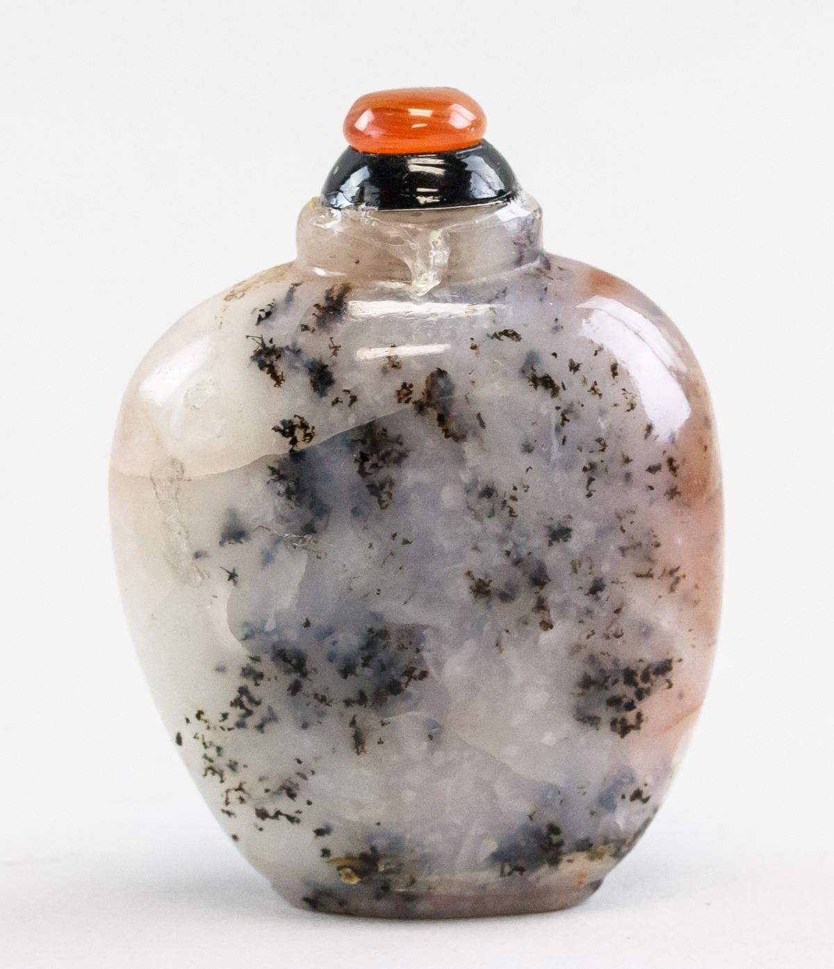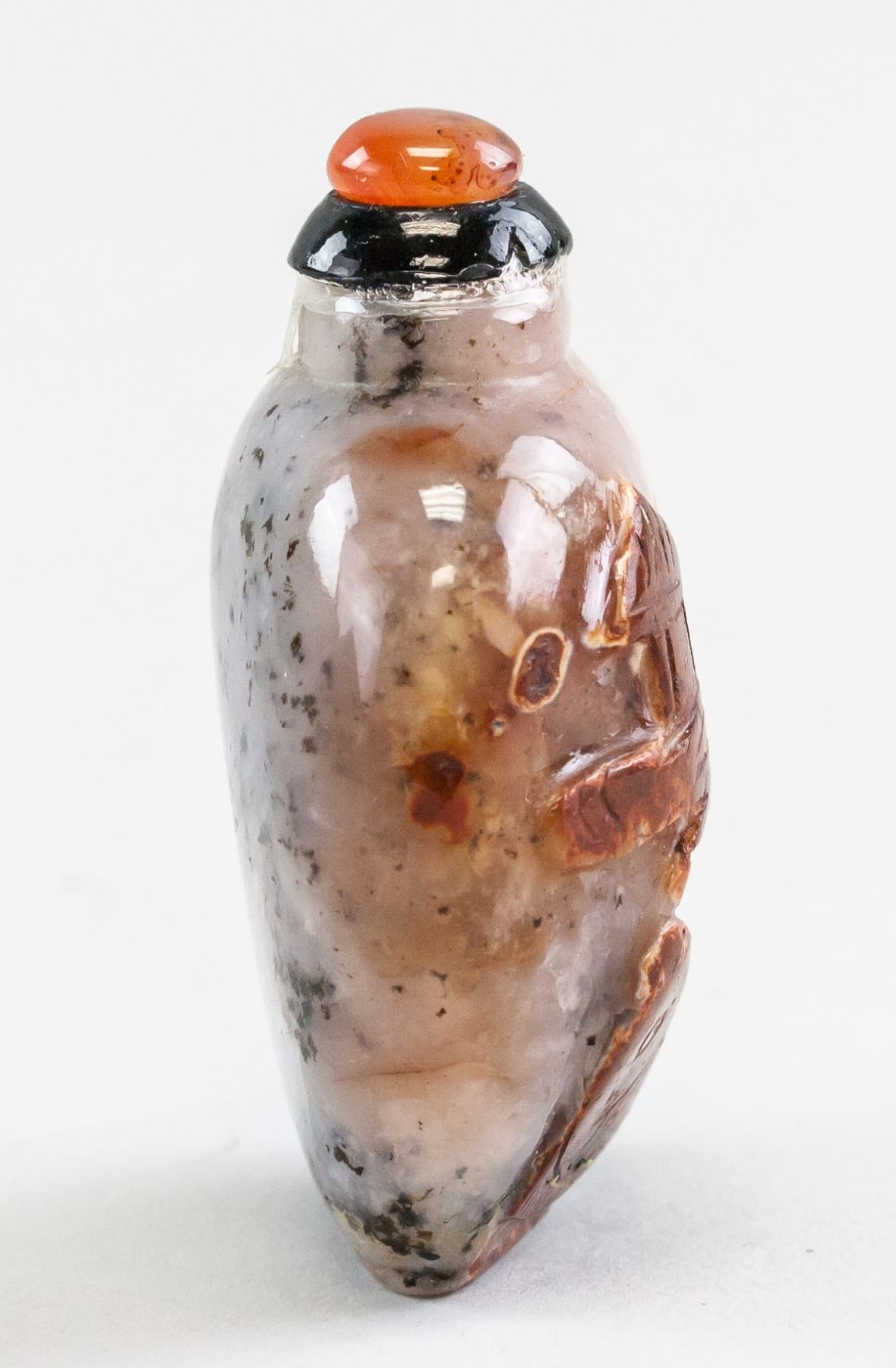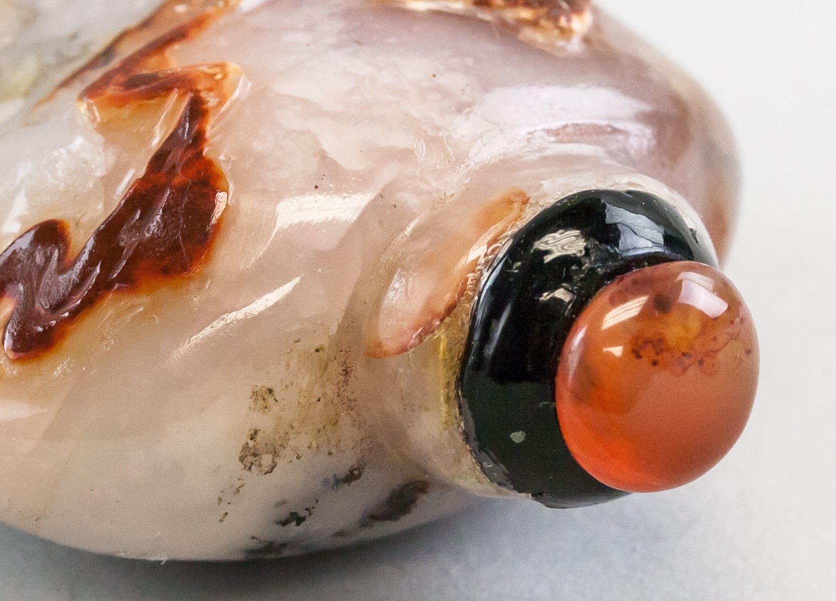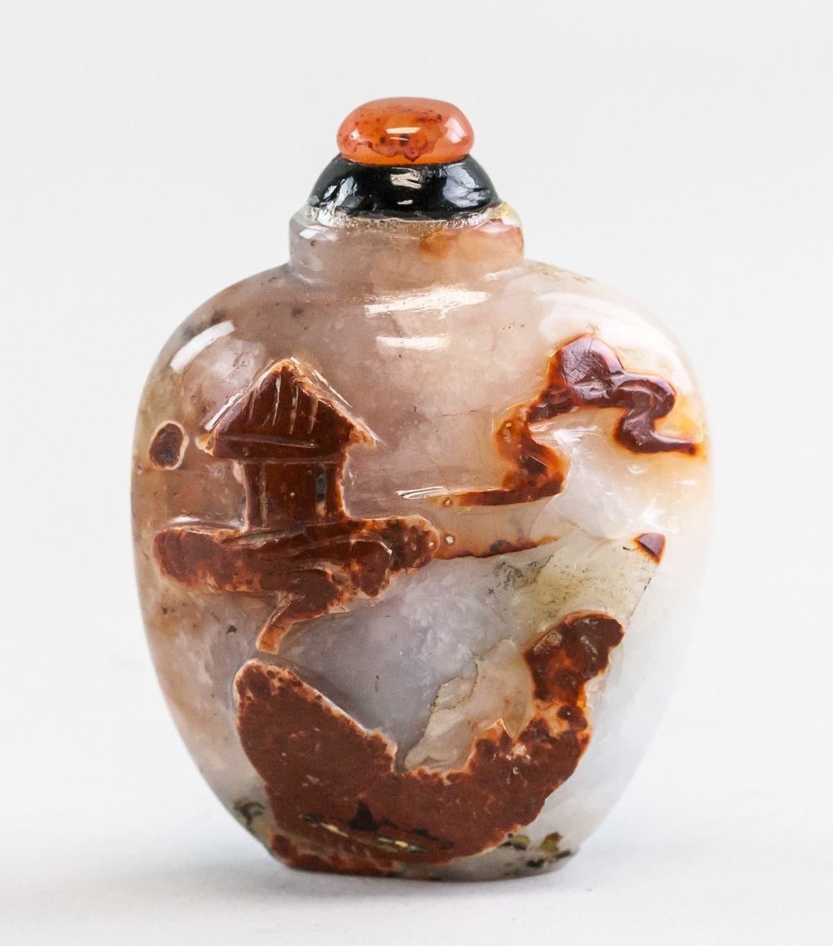 Chinese agate snuff bottle. Of pale red tone with dark brown highlights, with orange lid. Carved with misty pavilion and fish. 7 x 5 cm, 112 grams.