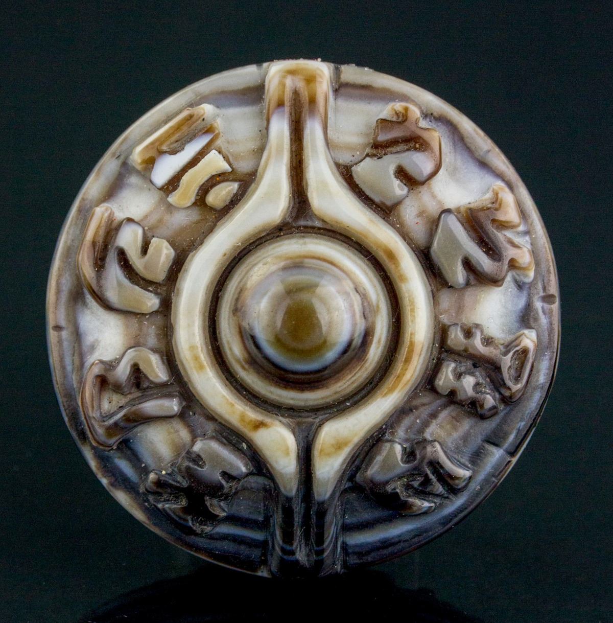 Chinese agate carved round pendant; of round shape; with low relief designed shape carving; W: 1.6 cm, L: 5.2 cm, 57 grams