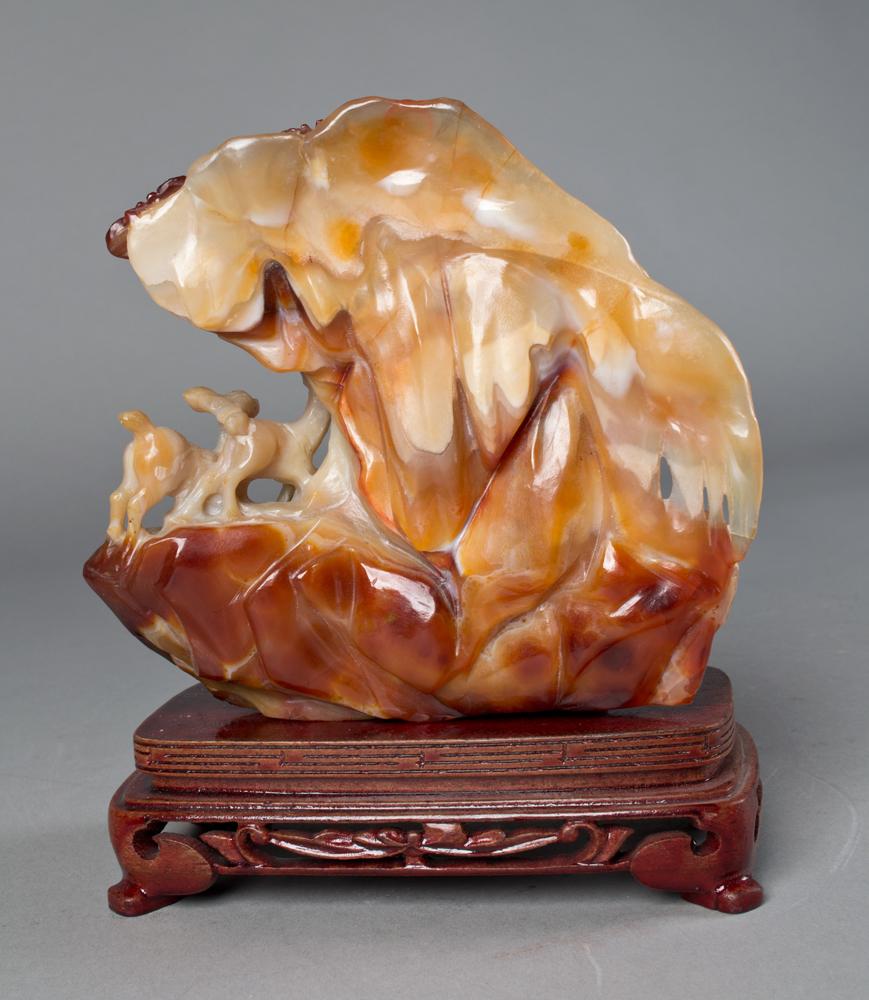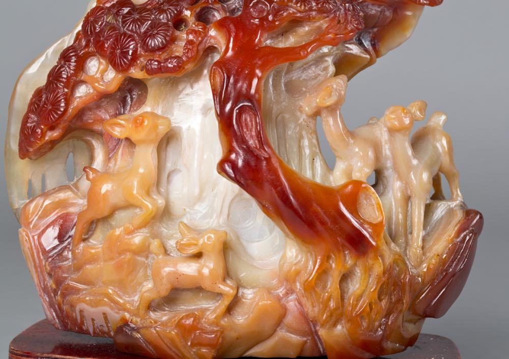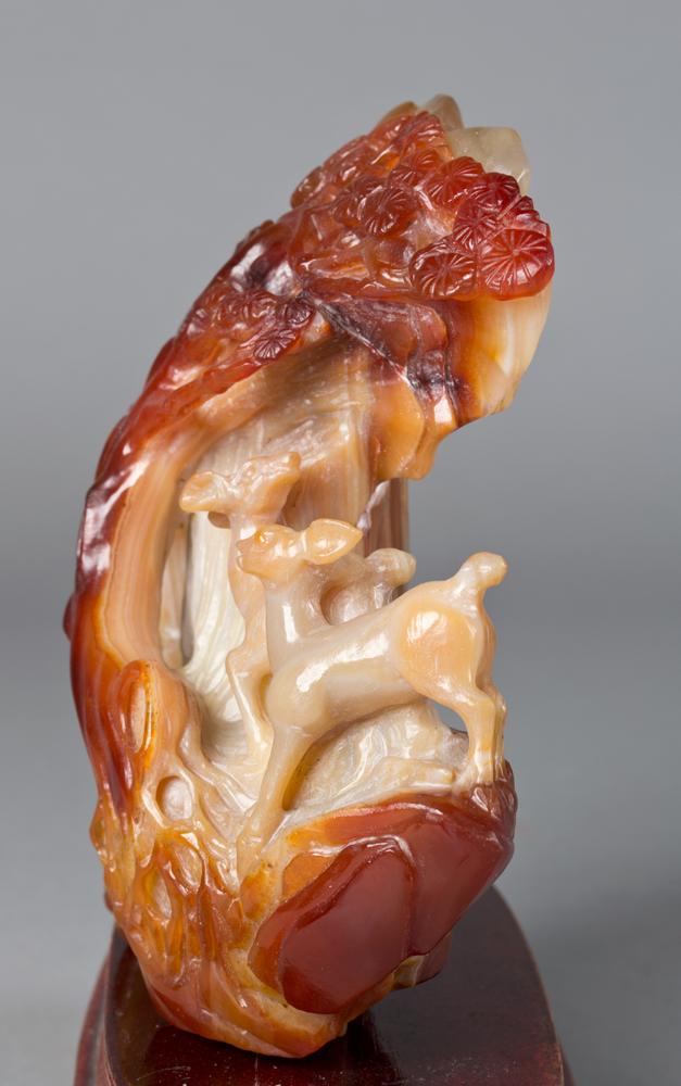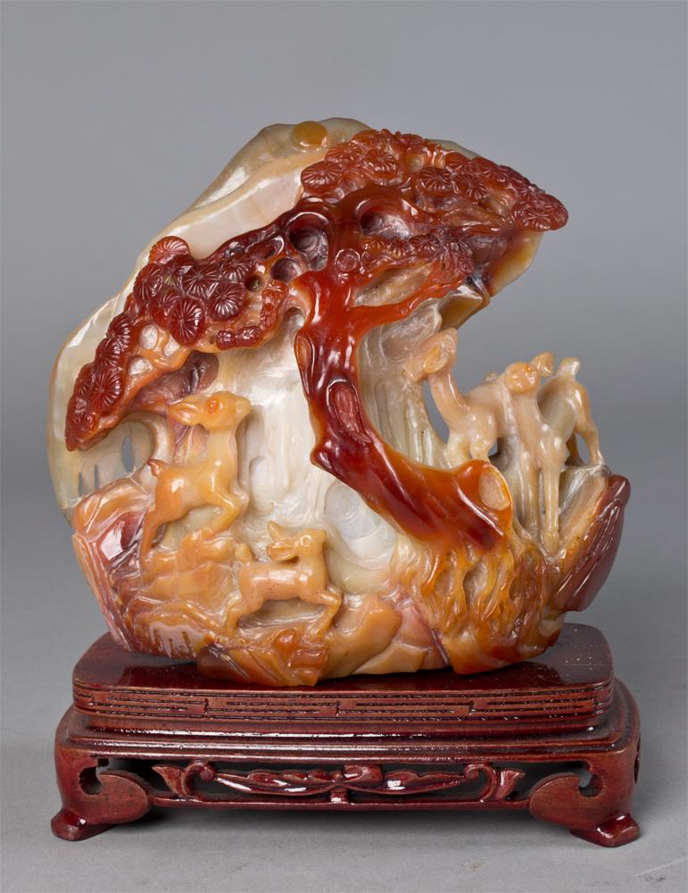Finely carved to depict four deer beneath a lingzi tree, wood stand 6"H X 6.25"W not including the stand circa 20th century.