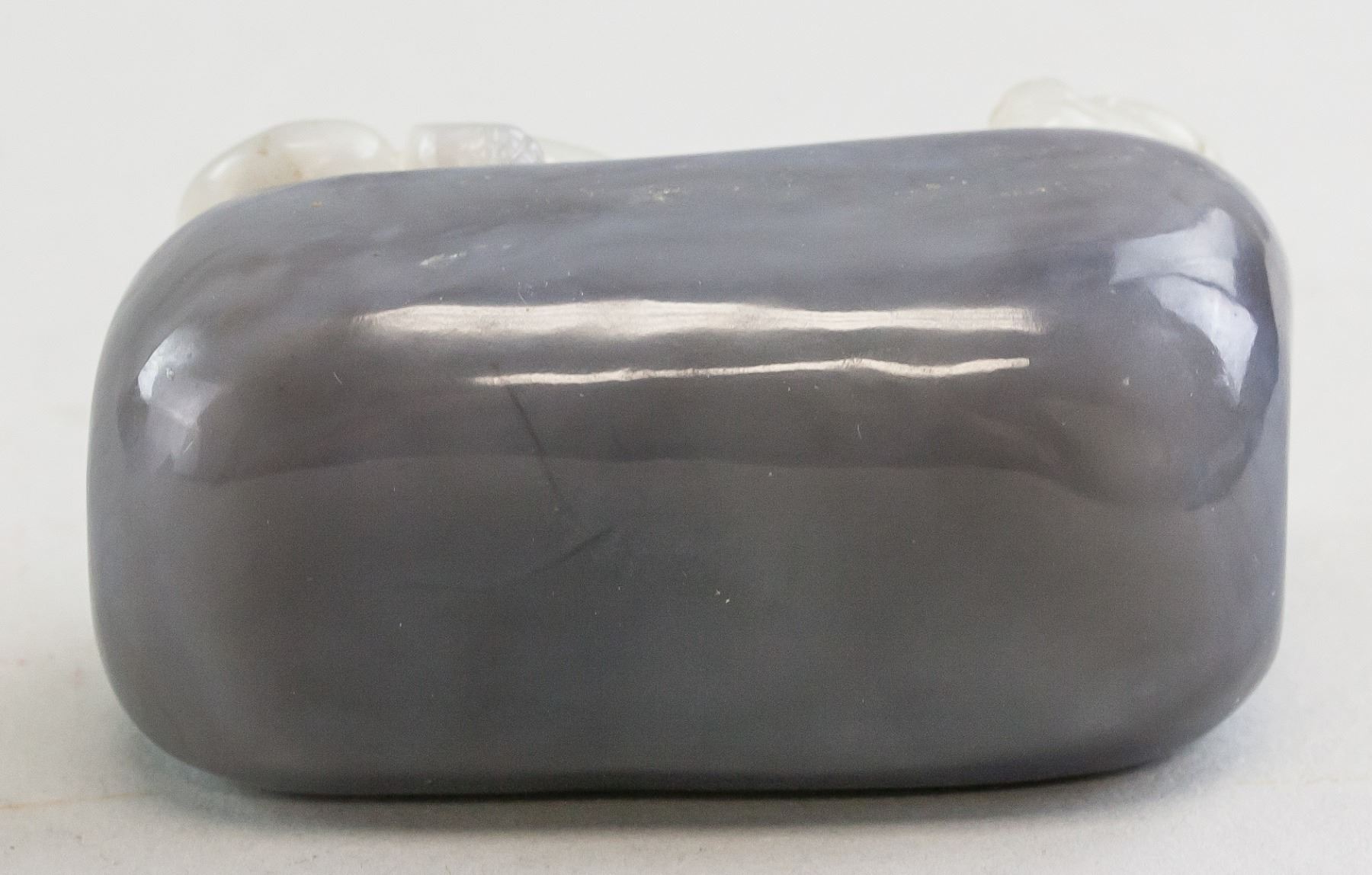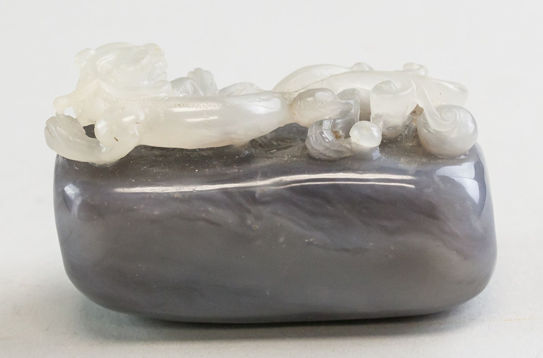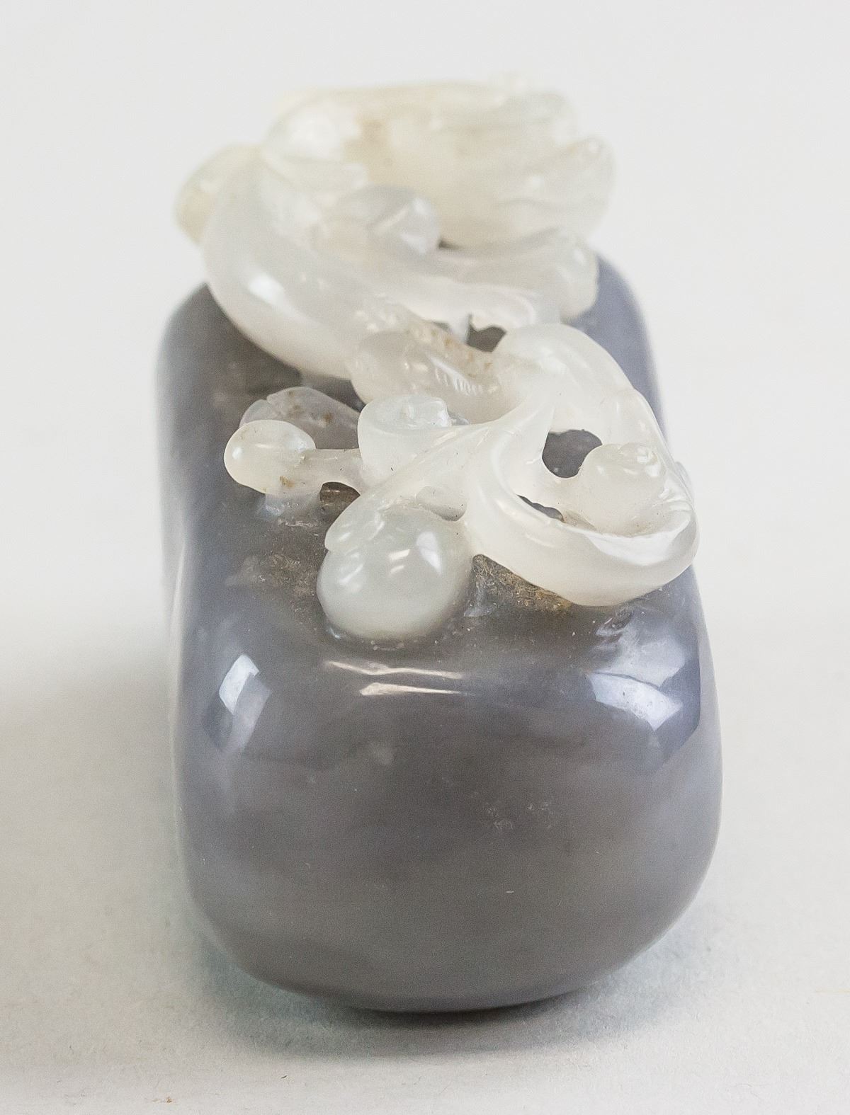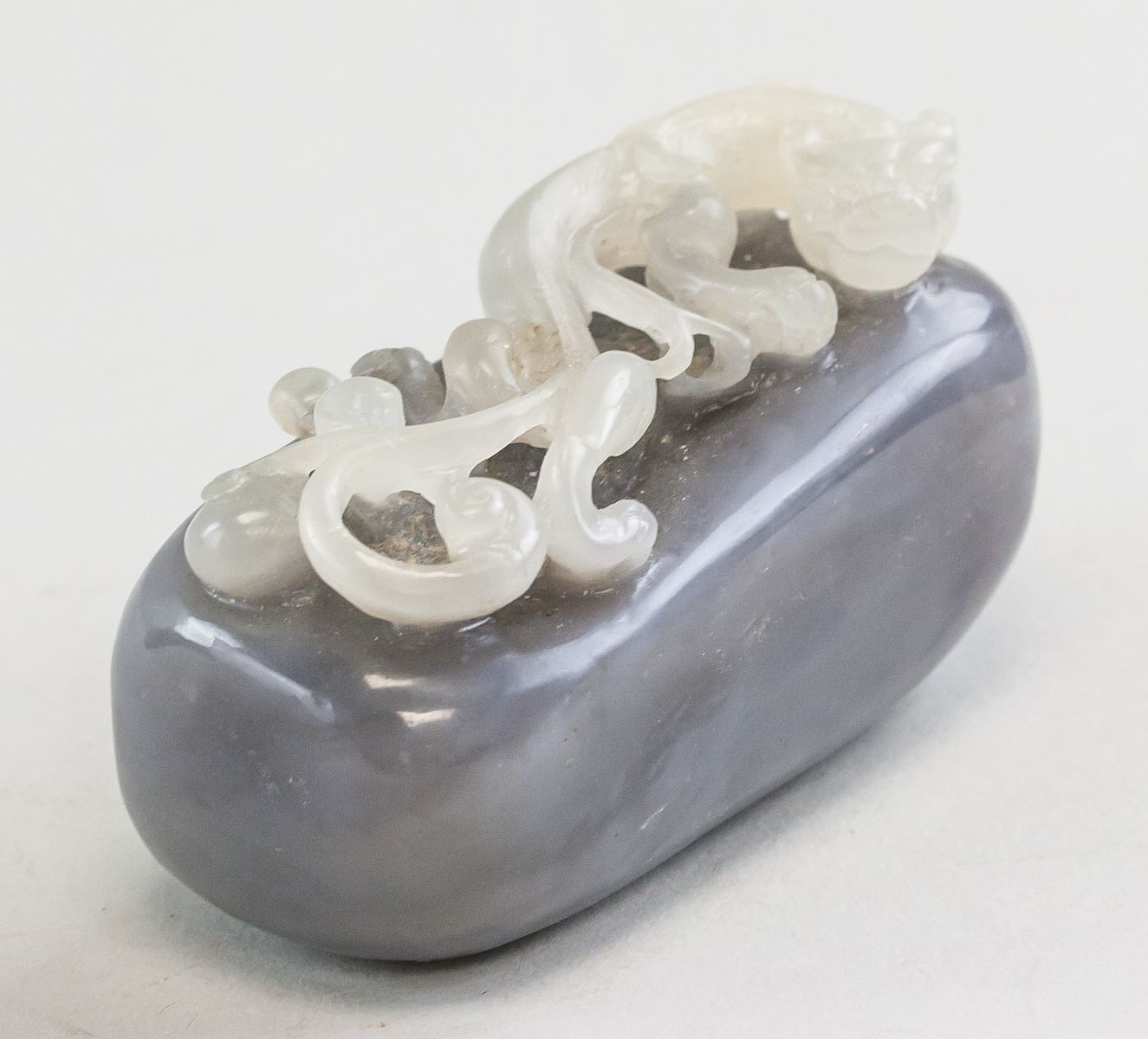 Chinese agate carved paperweight. Of grey and white tone. Of dragon shape. 5 x 8 cm, 317 grams.