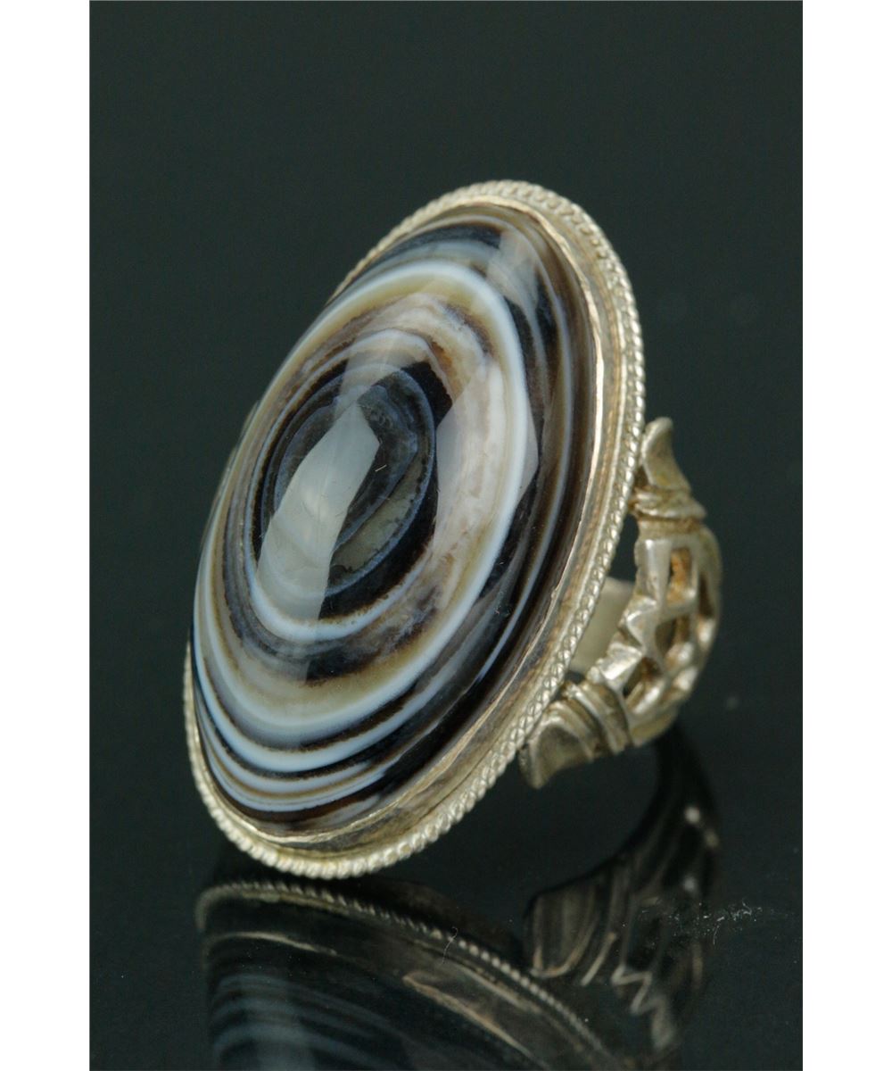Chinese agate silver ring; featuring cabochon-cut agate with natural black and white strips; Ring Size: 10, 20 grams