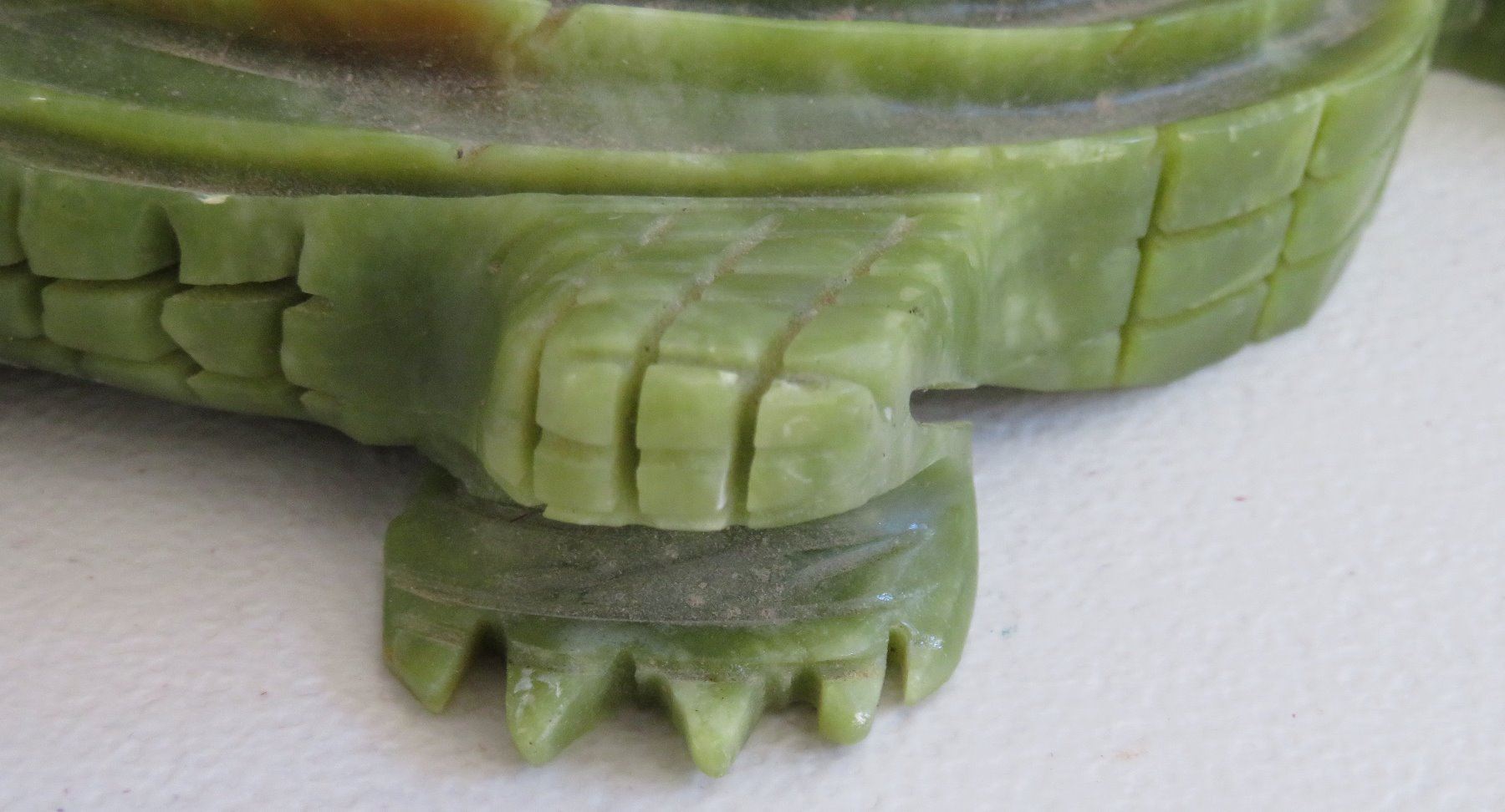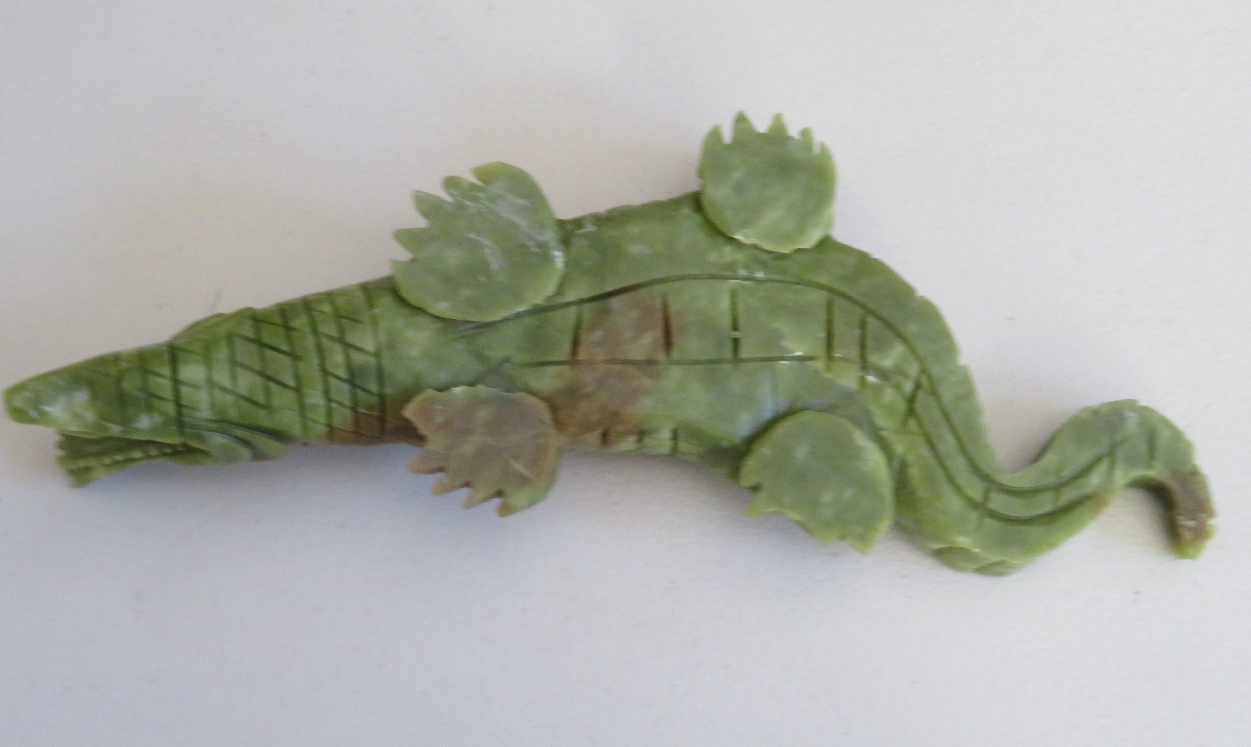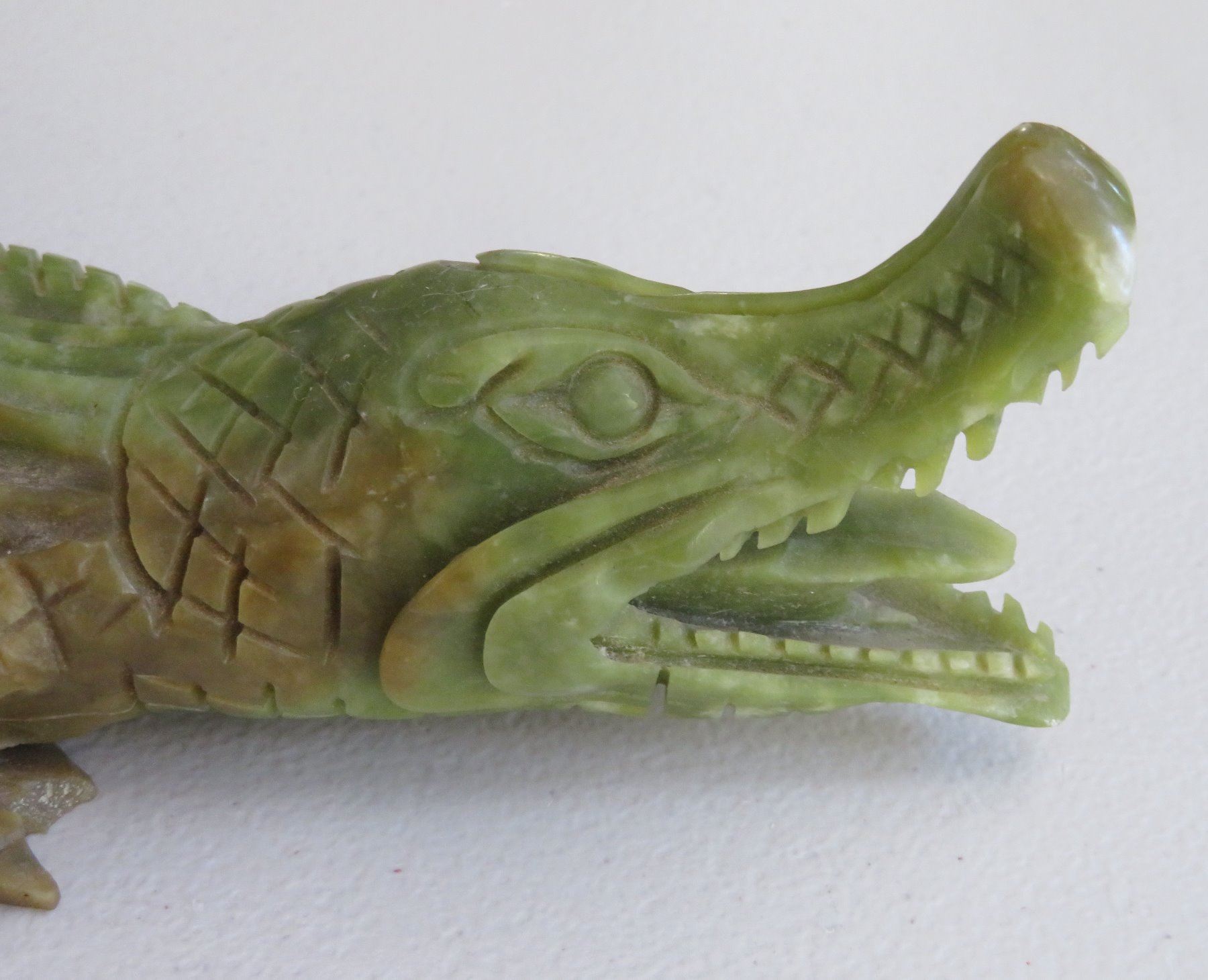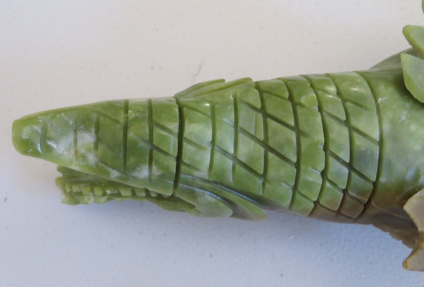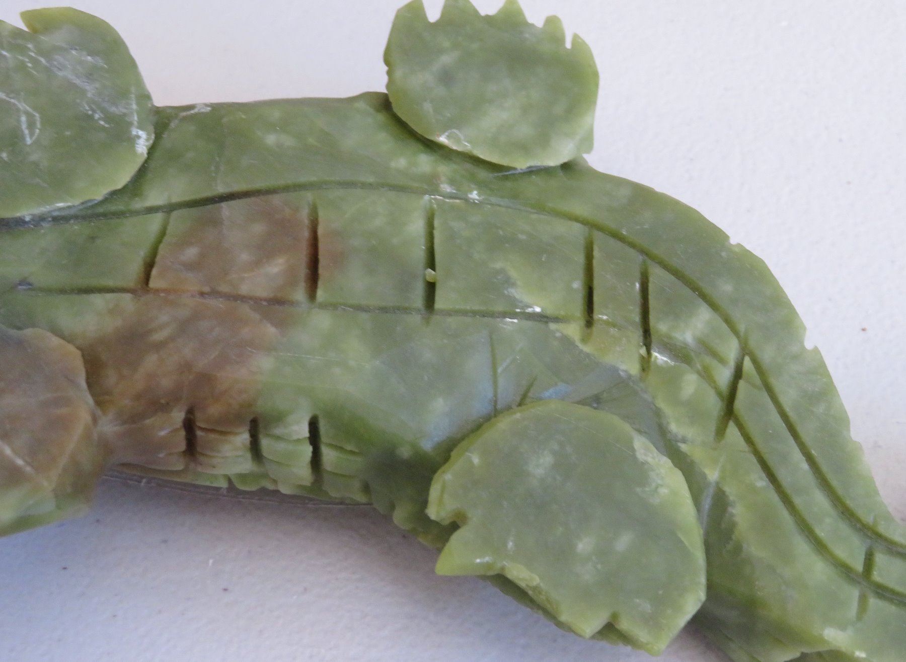 Chinese Alligator Carving, Ming dynasty. Made of serpentine, the item measures 13" x 4" x 2". China. Ex-Heritage of the Americas Museum. Condition: Nick on tail and foot, see images. Shipping: $30.00 w/insurance and signature, double-boxed, due to size.