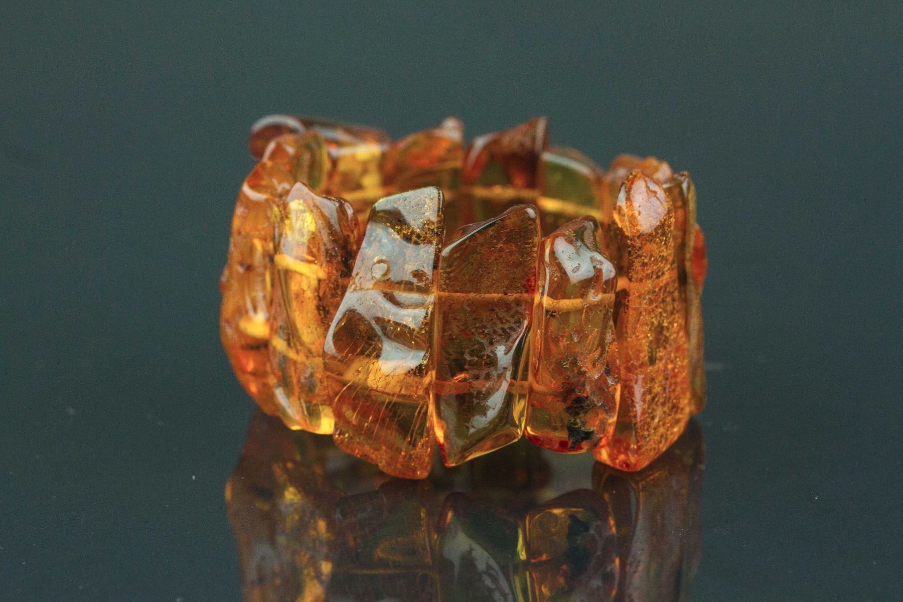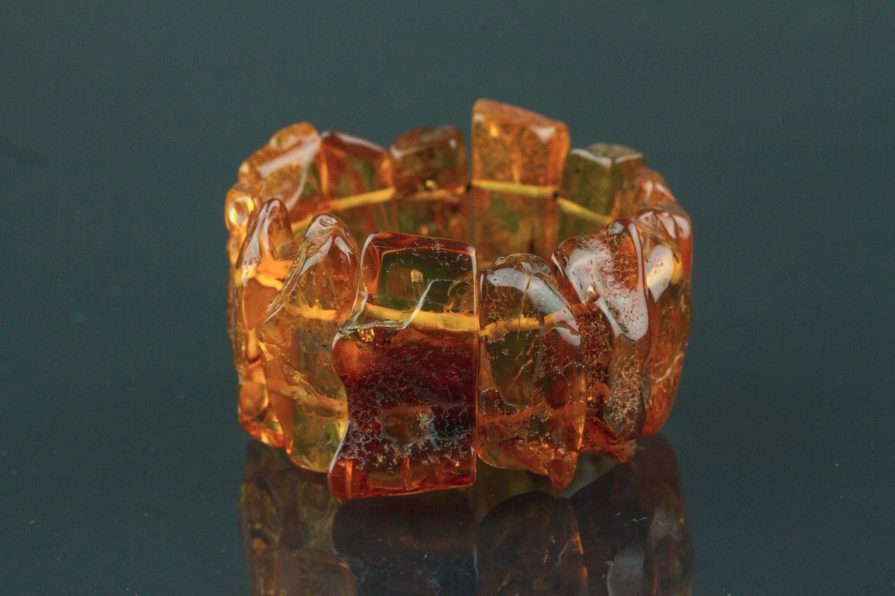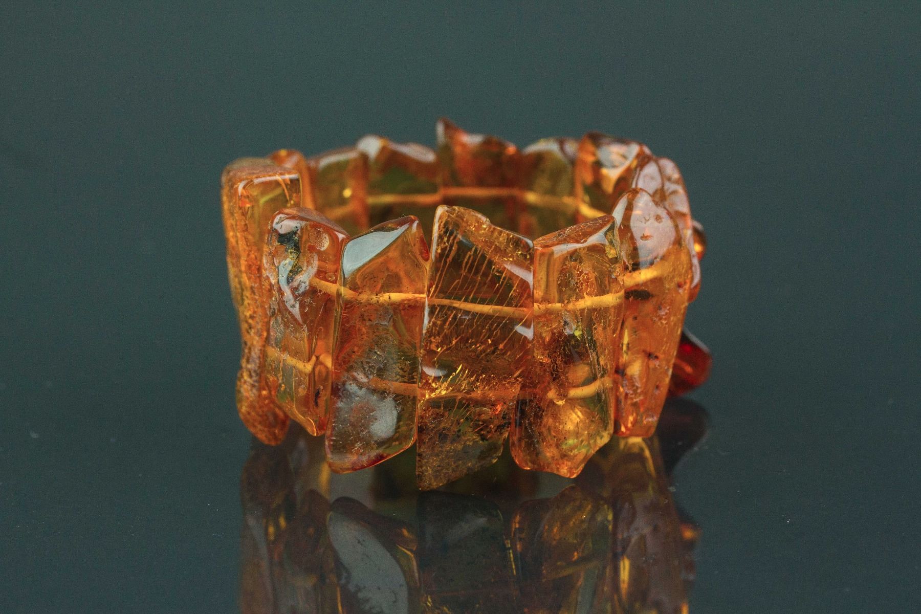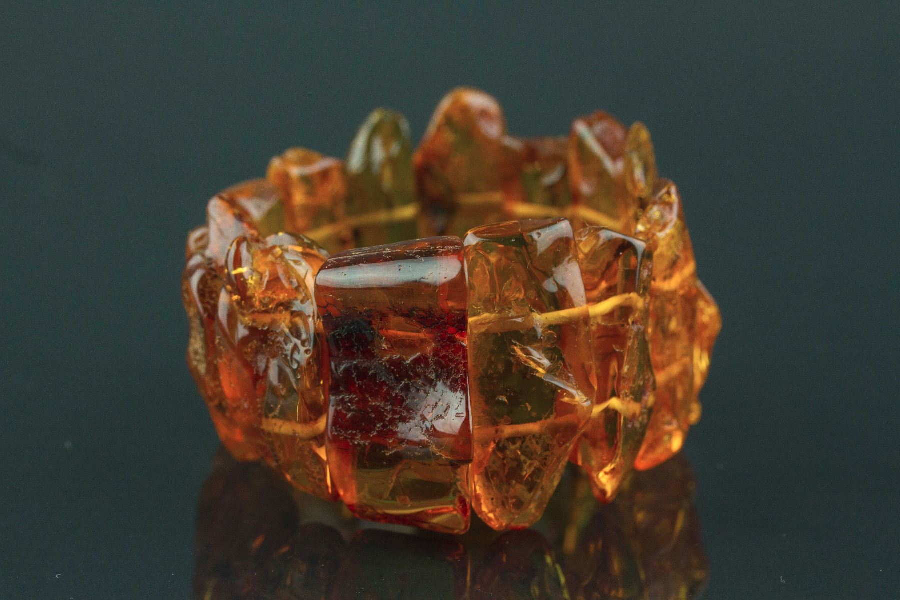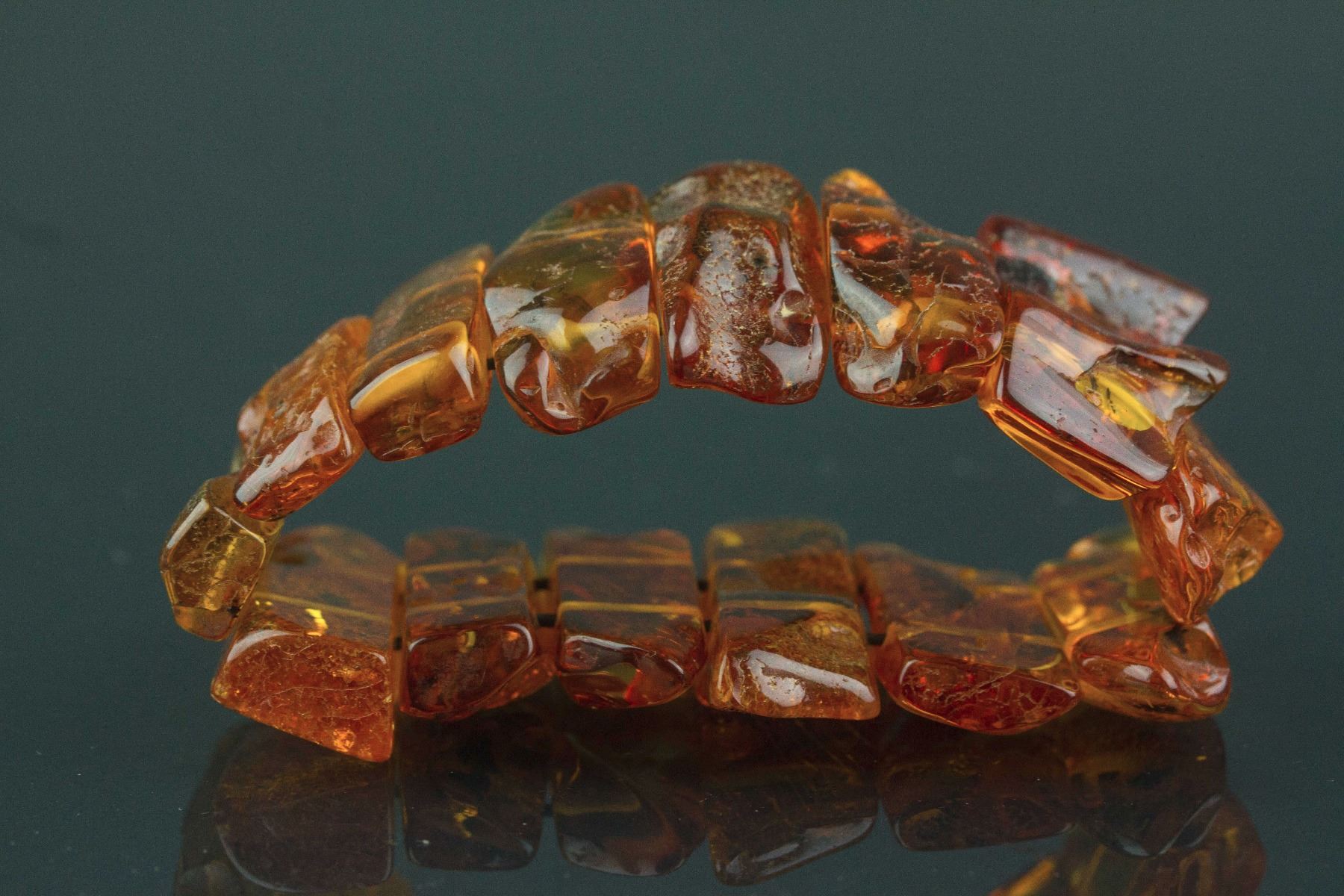 Chinese amber bracelet; comprised of numerous natural form amber beads; of translucent yellowish brown tone; H: 3.5 cm, D: 6.5 cm, 36 grams