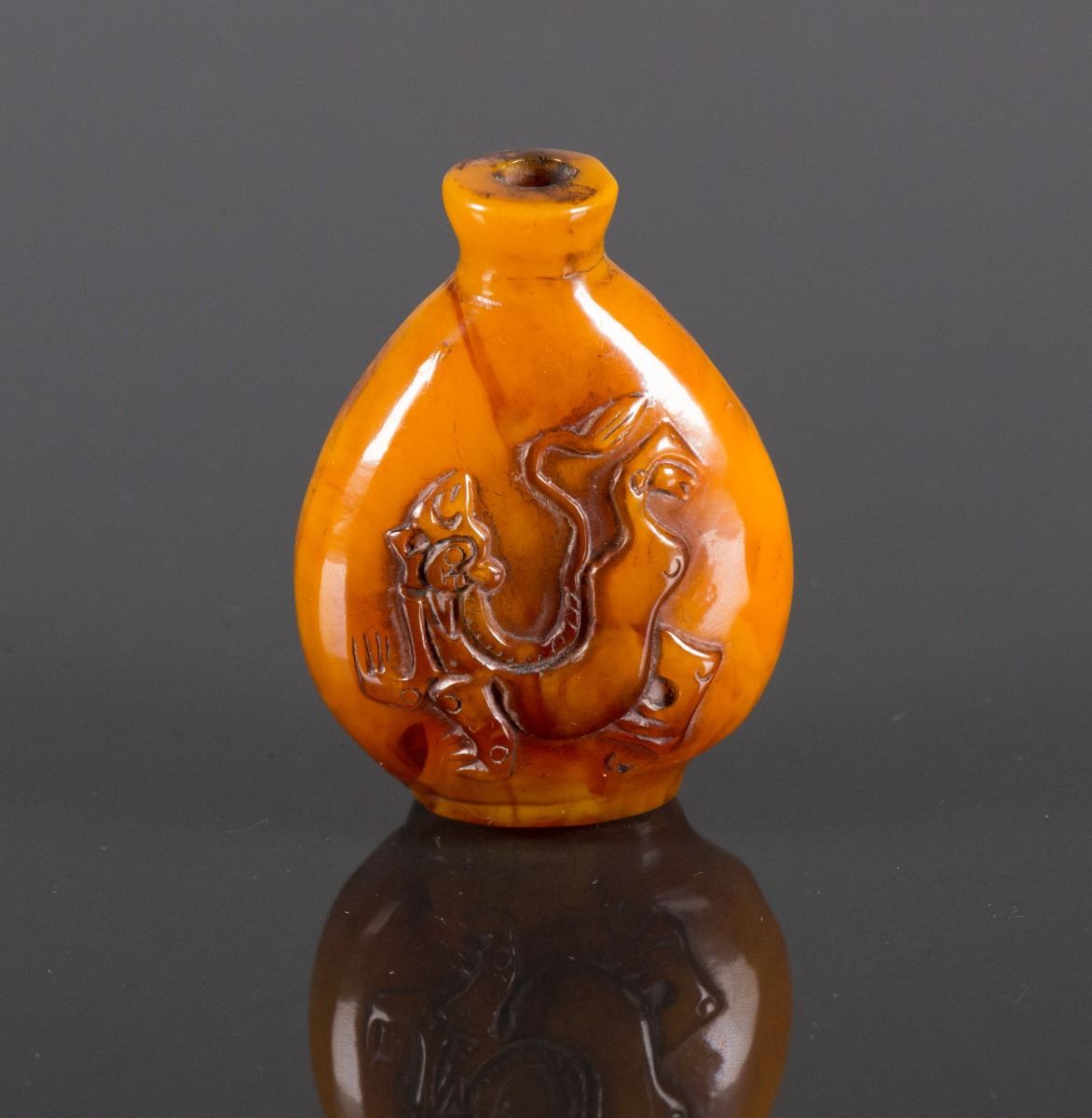 Chinese amber snuff bottle; featuring carved low-relief Chilong and deer; of deep honey tone; H: 6 cm, W: 5 cm, 45 grams