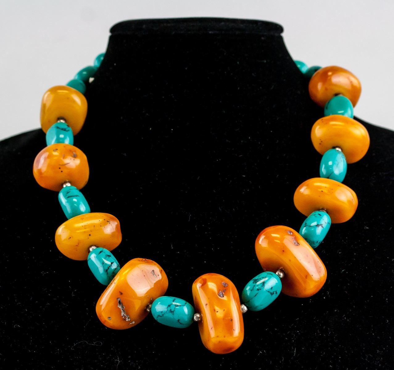 Chinese turquoise and amber necklace. Of natural shape beads. 28.5 cm (when clasped), 200 grams