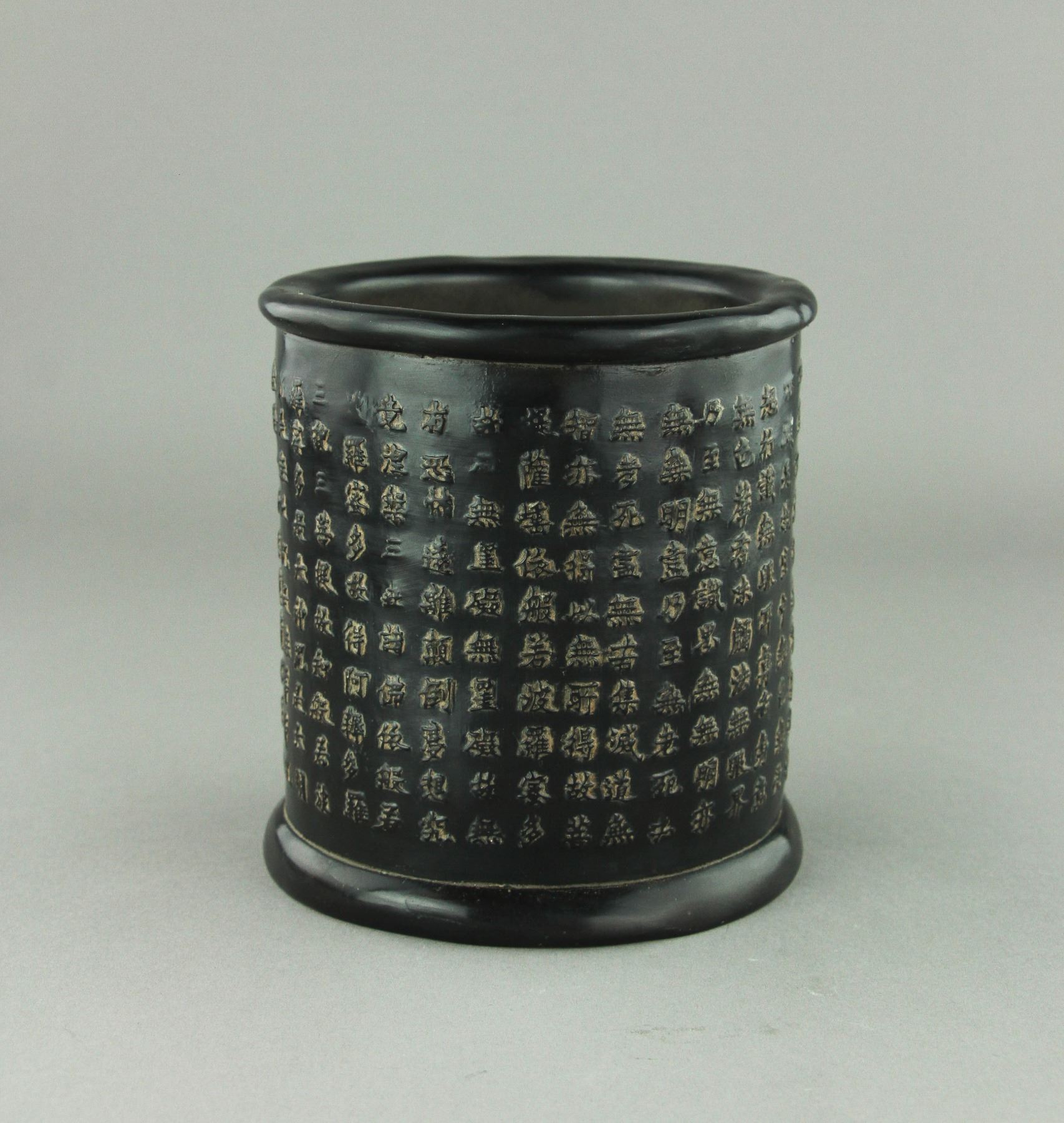 Chinese amber-like brushpot; of cylindrical form; carved in low relief with Heart Sutra script calligraphy; six-character Kangxi imperial seal carved on body; H: 13.5 cm, D: 12.5 cm, 1042 grams