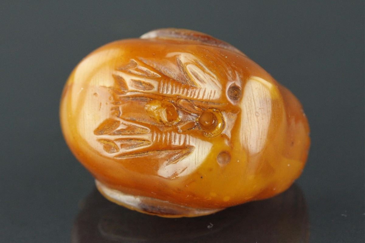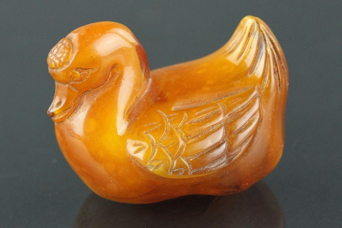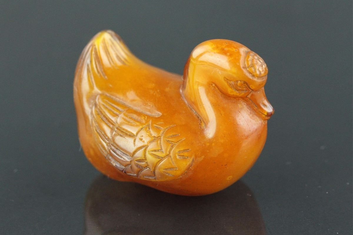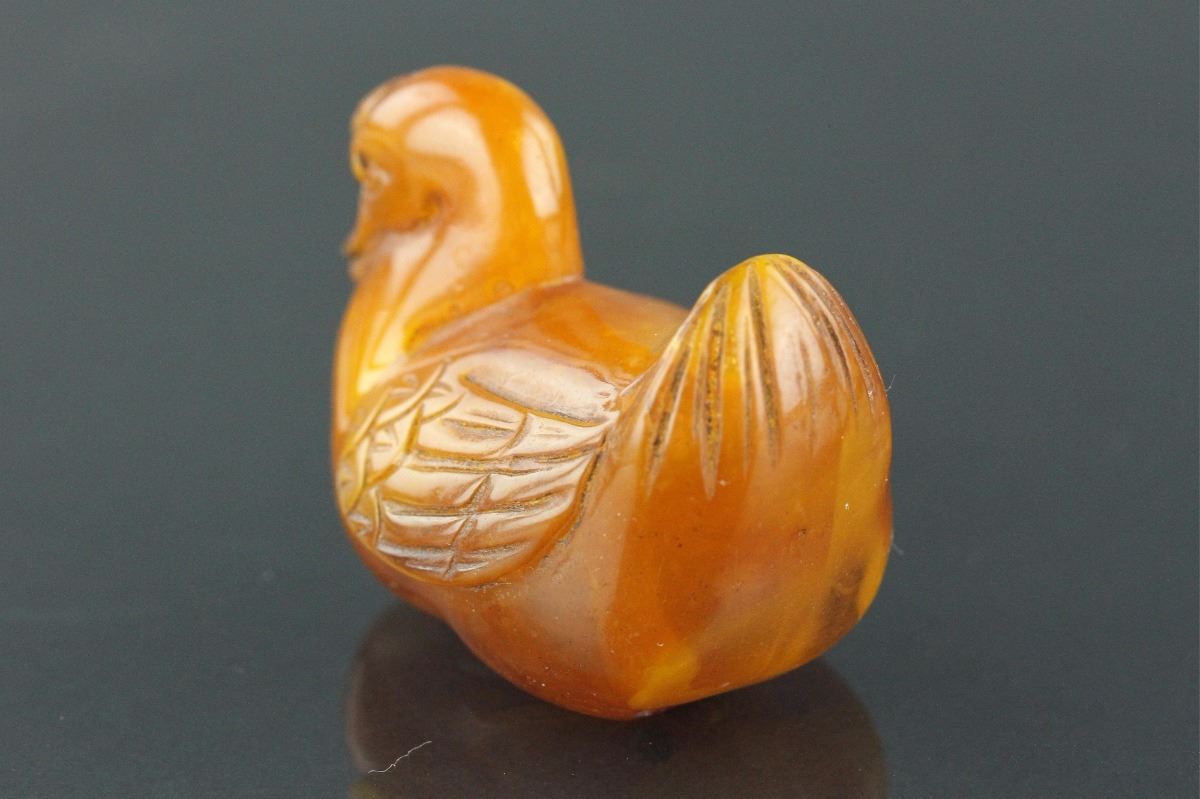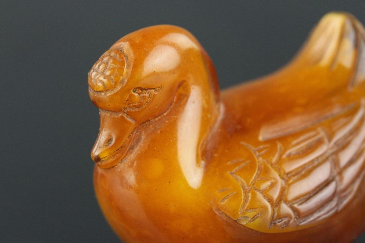 Chinese amber-like carved pendant; featuring form of mandarin duck; bottom pierced for suspension; H: 3 cm, W: 4.5 cm, 20 grams