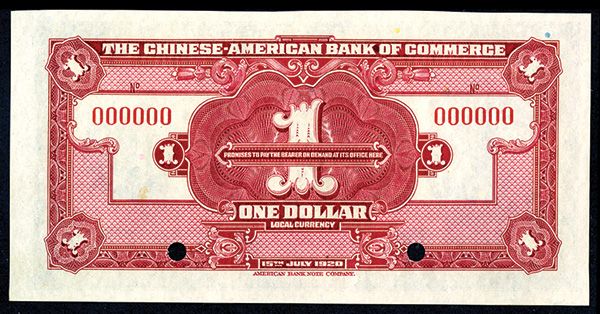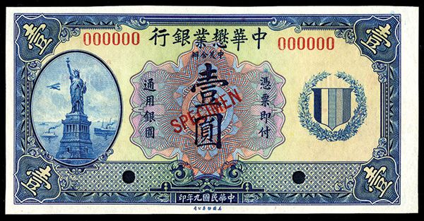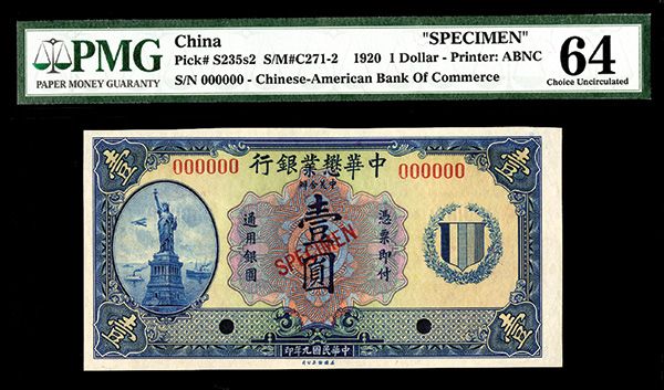 China, 1920. $1. P-S235s2. (S/M #C271-2). Specimen banknote. Blue on m/c underprint with Statue of liberty vignette on left, back is red. Red specimen overprint, "00000" serial numbers and POC's. PMG graded Choice Uncirculated 64, Rare banknote. ABNC.
