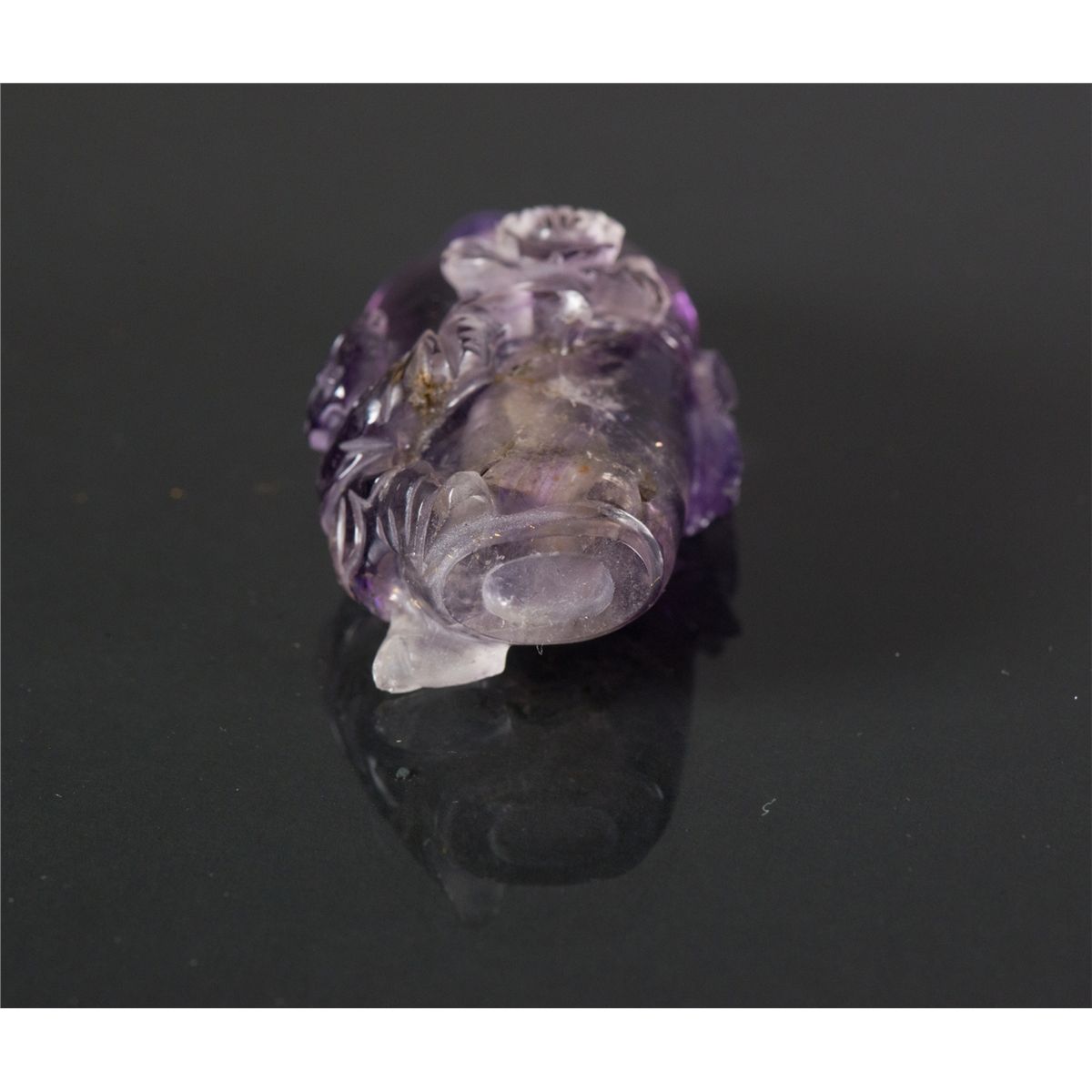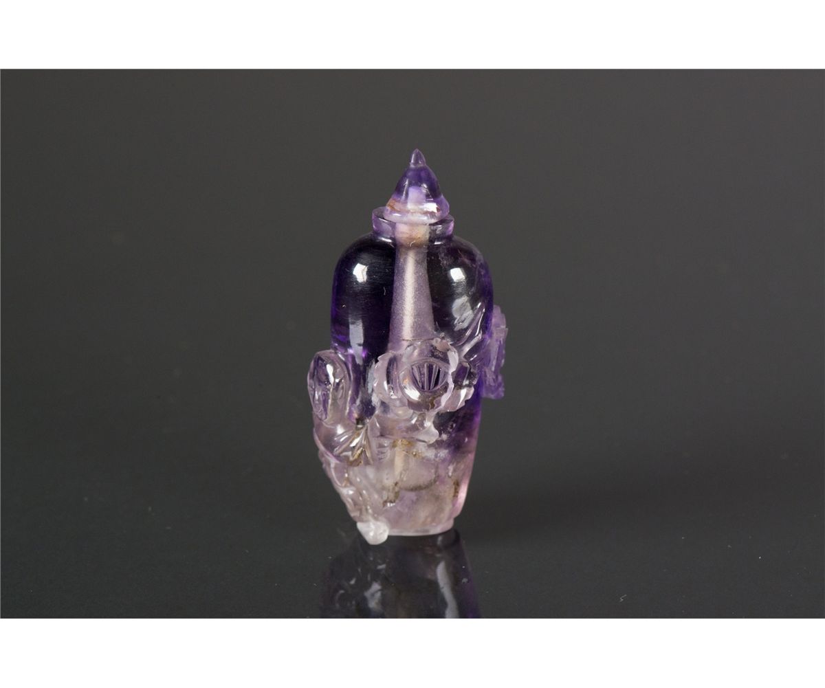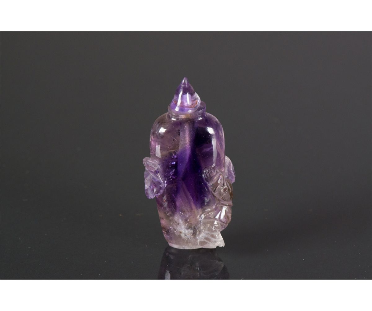 Chinese amethyst carved snuff bottle; featuring high-relief image of boy holding plum blossom; H: 7 cm, W: 3 cm, 41 grams