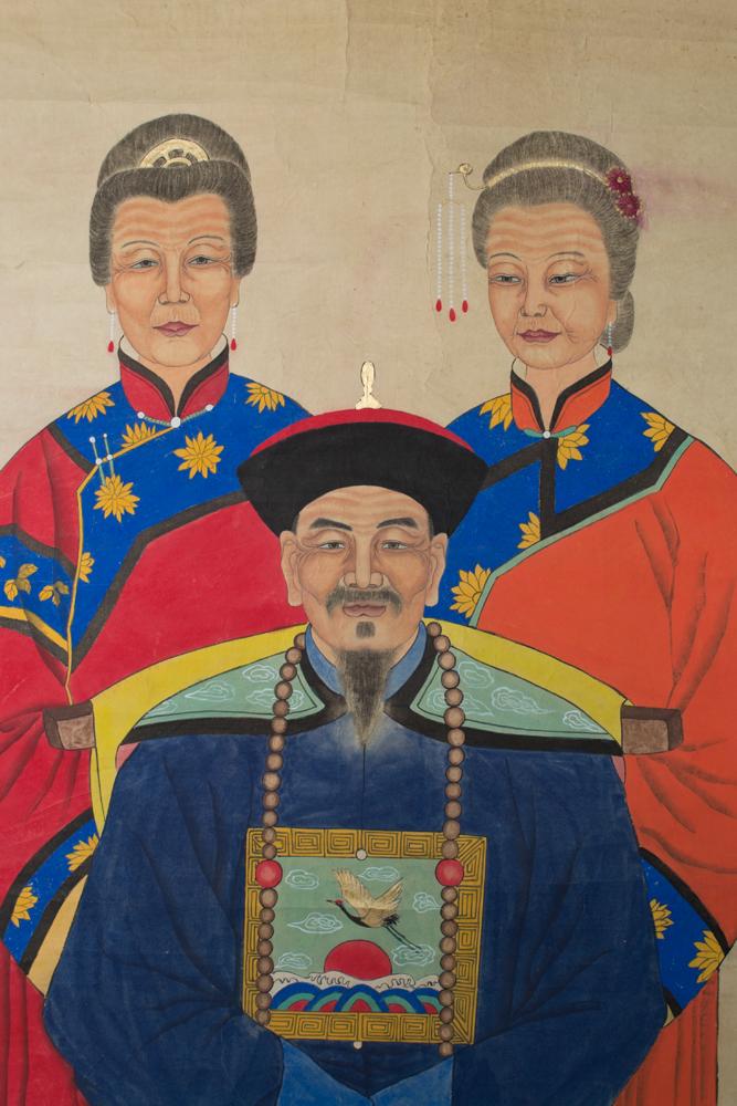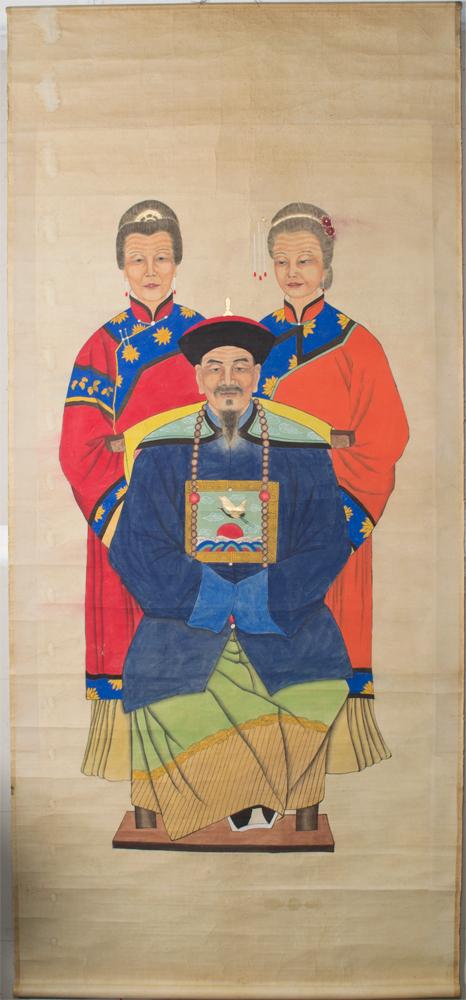 Depicting three figures one seated on a throne apparently unsigned. 85"L X 46"W circa 20th century.