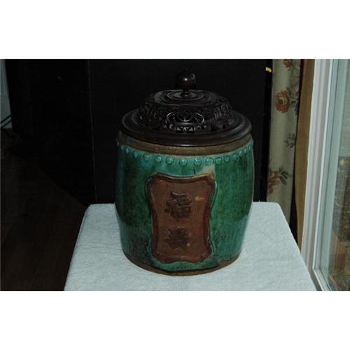 Chinese Antique Pottery Pot with Wood Cover.minor hairline otherwise good condition.15"Hx 12"D.Nice carved rose wood cover.