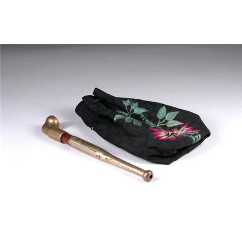 A miniature smoking pipe made from Bamboo, brass and Baitong (White brass) with a bag for storing tobacco. Pipe in ver good condition. <p>Late 19th Century. From Beijing, North China.<p> Dimension: Diameter 0.5 x Width 4 1/2 inch (Diameter 0.5 x Width 11 cm)