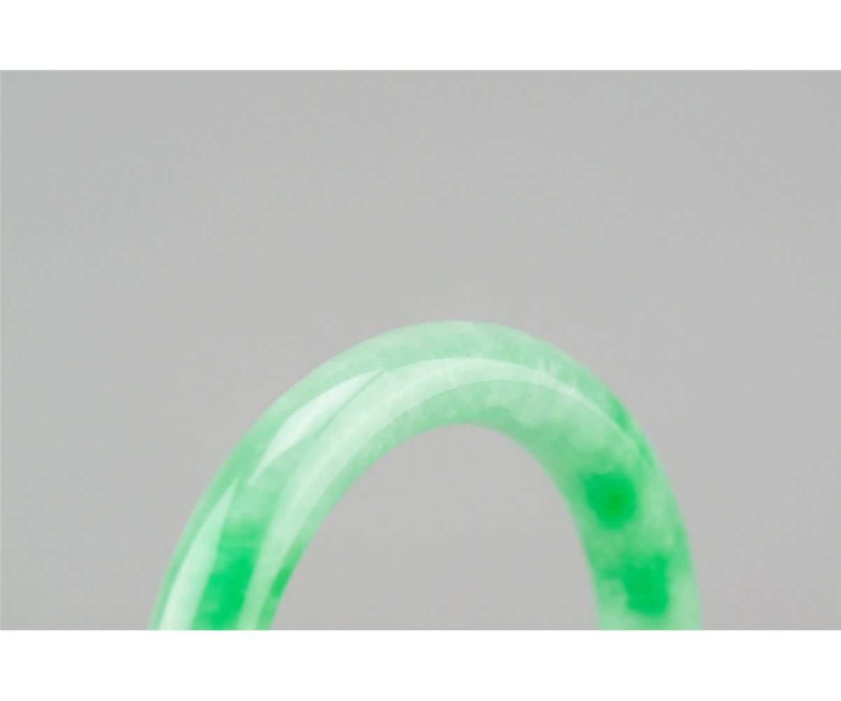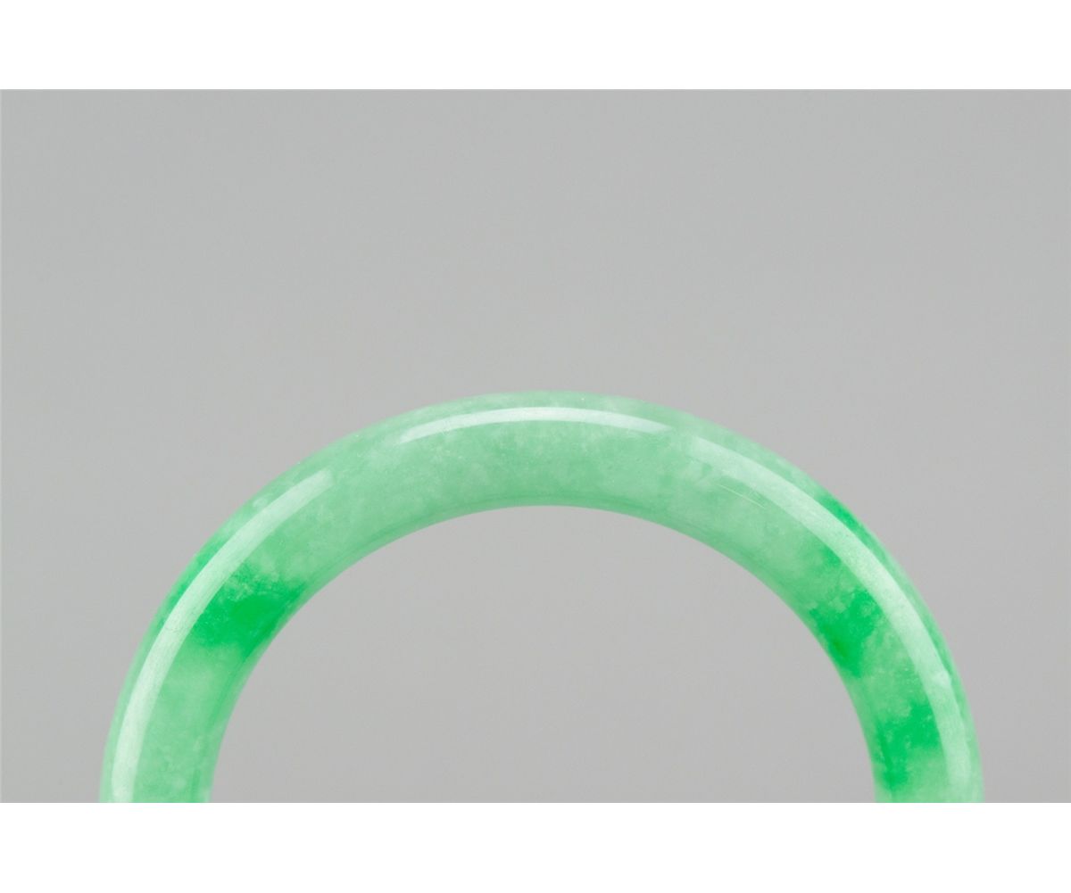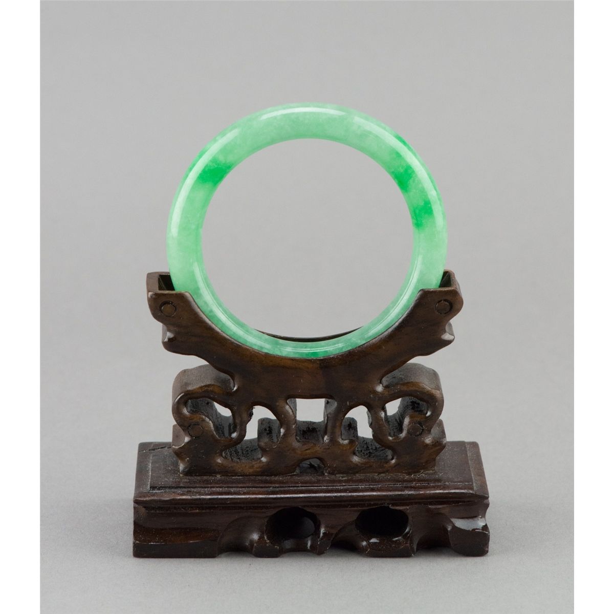 Chinese carved jadeite bangle, of apple green tone with emerald green suffusions, and rounded edge; D: 6.9 cm, inner D: 5.1 cm, 43 grams, Density: 3.29, wood stand not included