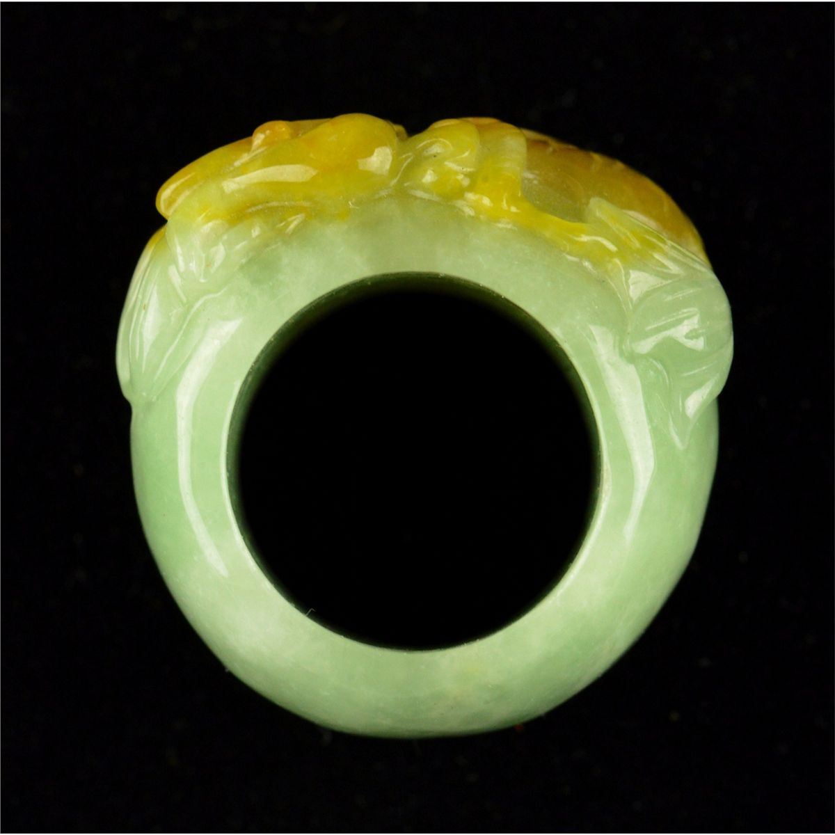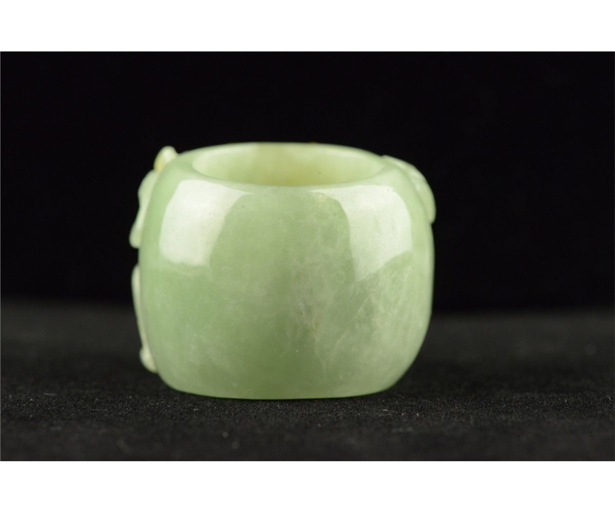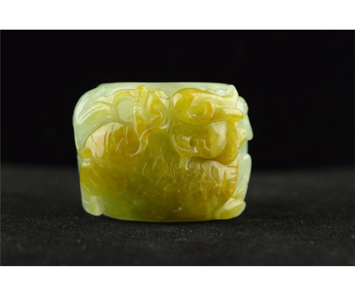 Chinese jadeite carved Archer's Ring; of apple green with russet suffusions; featuring a recumbent Chilong in crouching position; D: 2.2 Cm, 47 Grams; Provenance: T. Ng Collection Toronto
