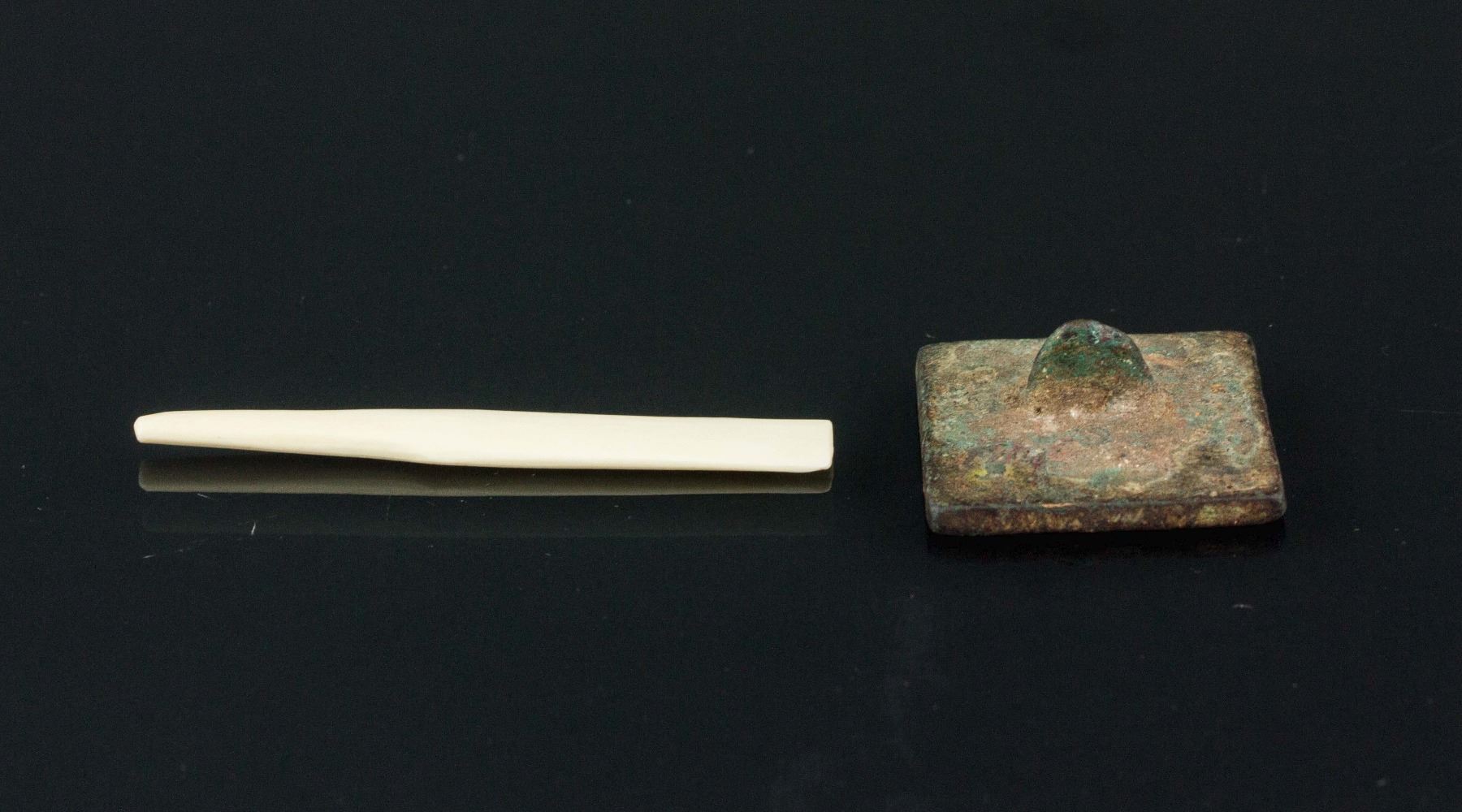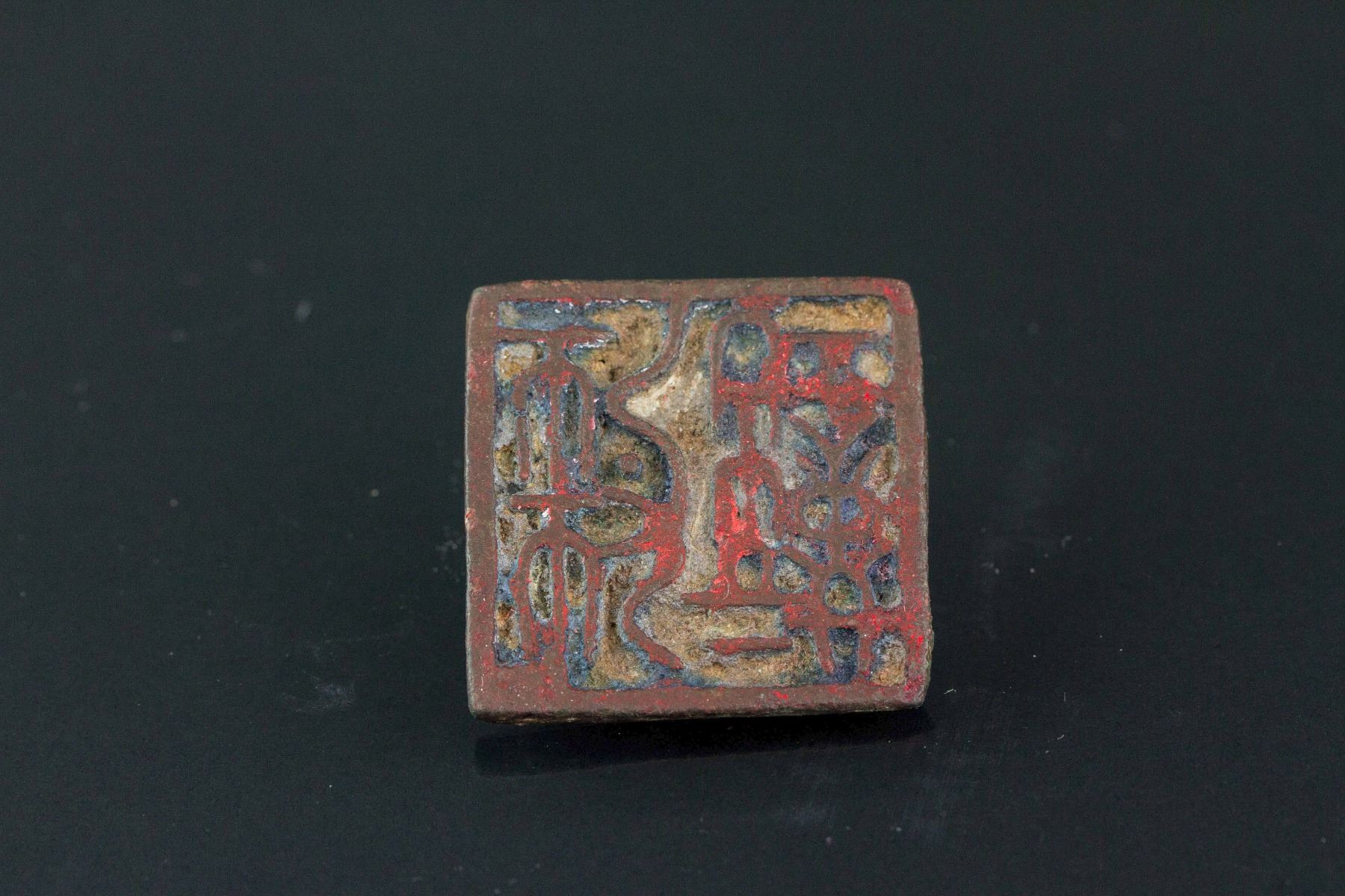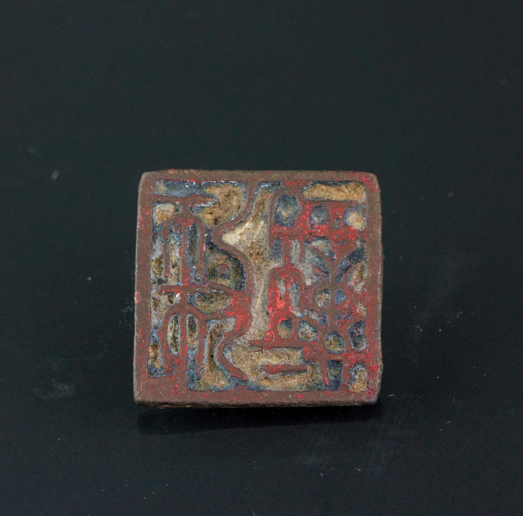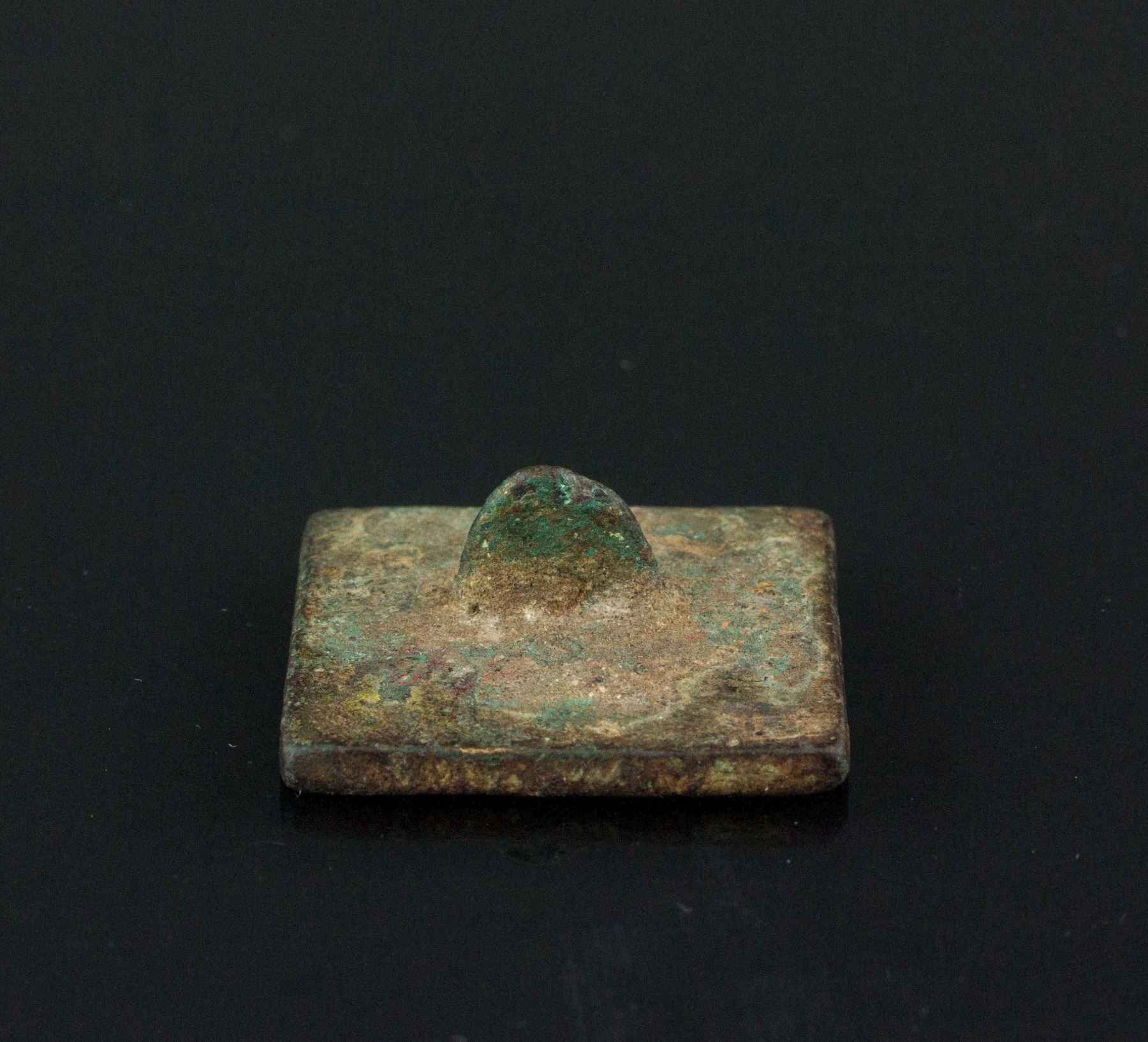 Chinese old archaic bronze seal; of square form body with a small handle; seal face carved two Chinese characters in seal script; with a stick to whisk inkpad; with the description paper; W: 3.5 cm, L: 3.5 cm, 28 grams