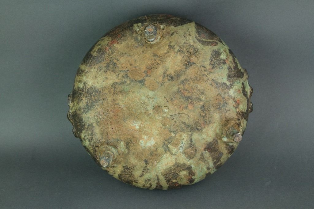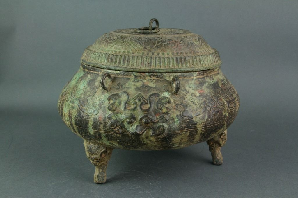 Chinese archaistic bronze censer; of ground shape with ring handles and three beast head leg; low relief Taotie pattern on body; low relief dot and beast pattern on cover; with ring knob on cover; H: 22.5 cm, W: 26 cm, 3926 grams