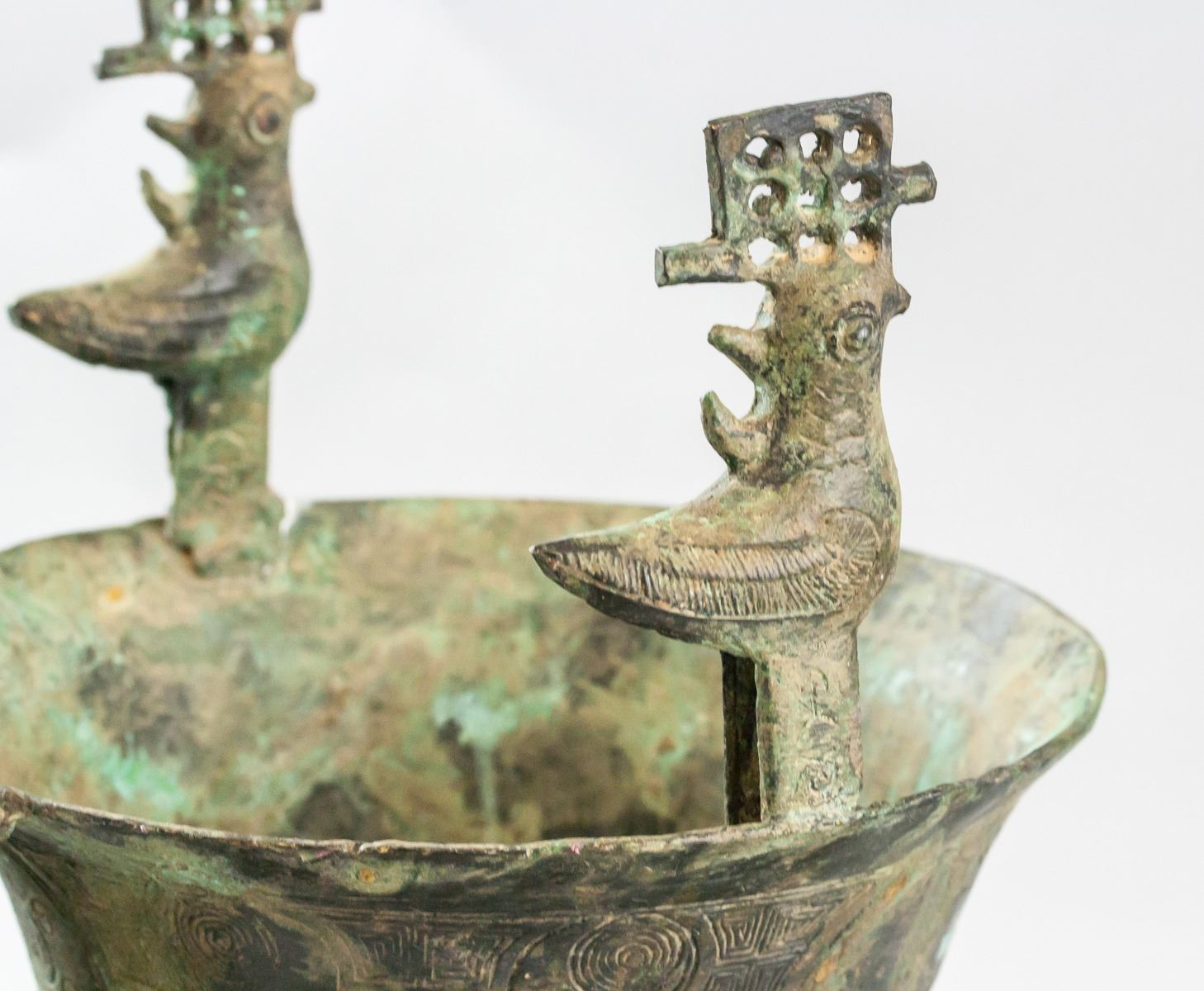Chinese archaistic bronze He vessel. Fearturing tripd and handle. Flanked with bird form ears. Decorated with beast pattern. 35 x 23 cm, 2940 grams