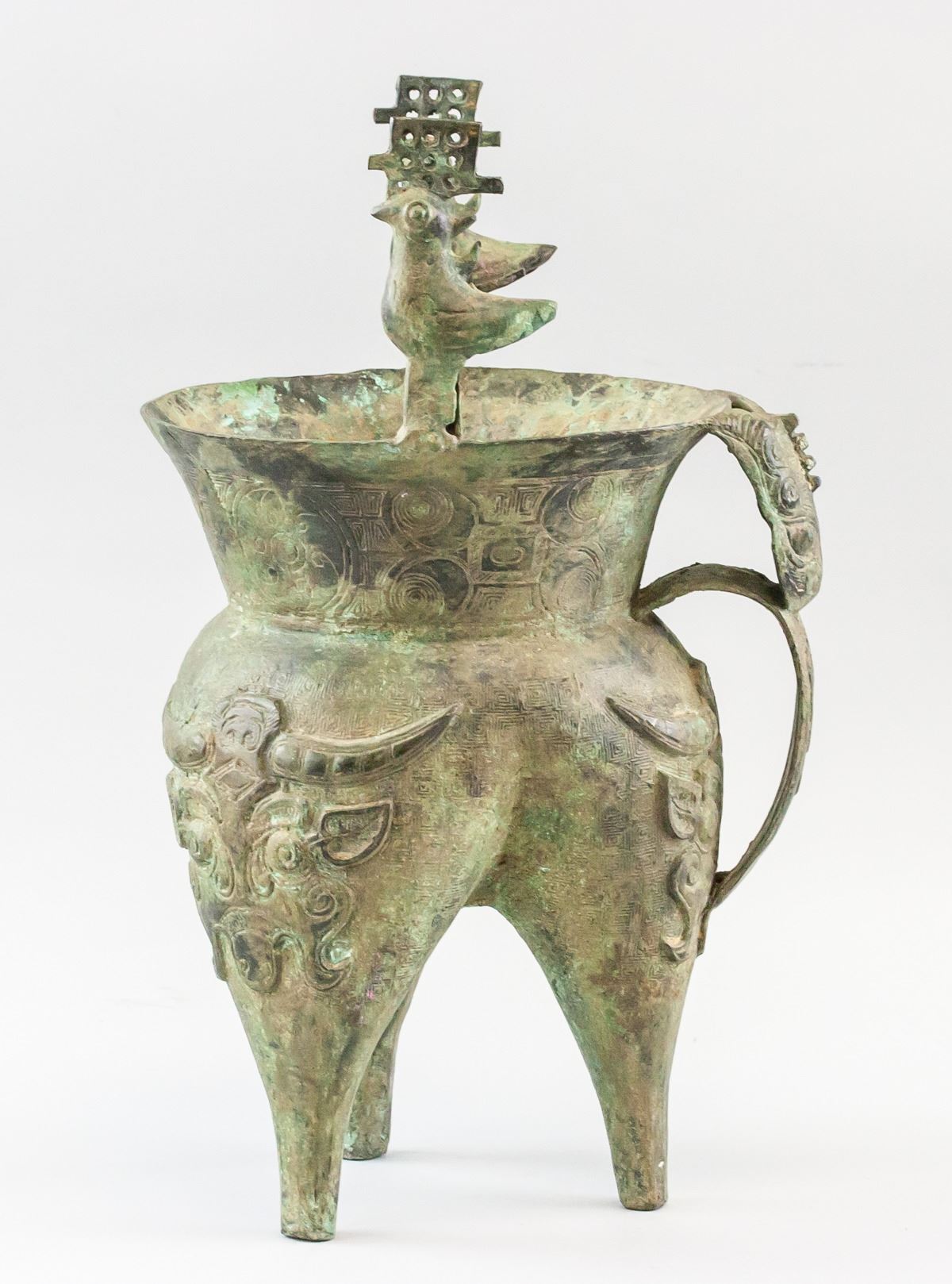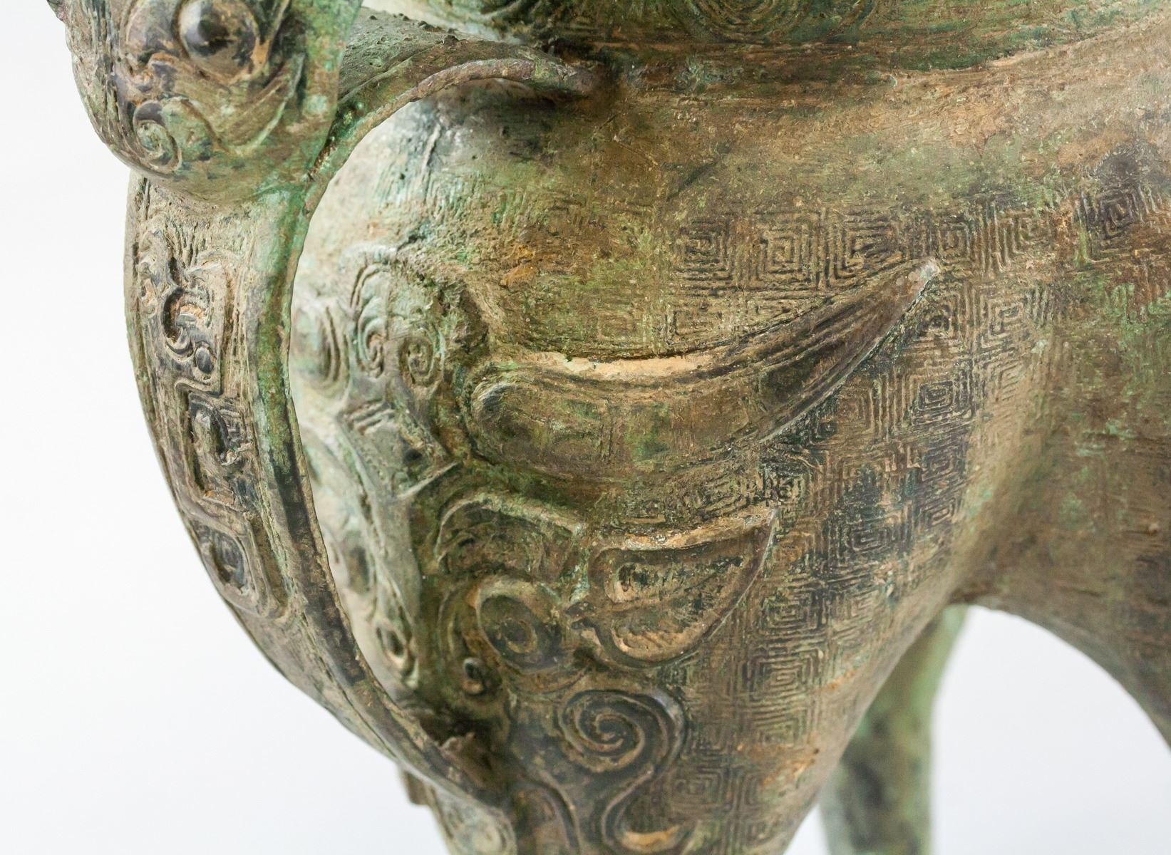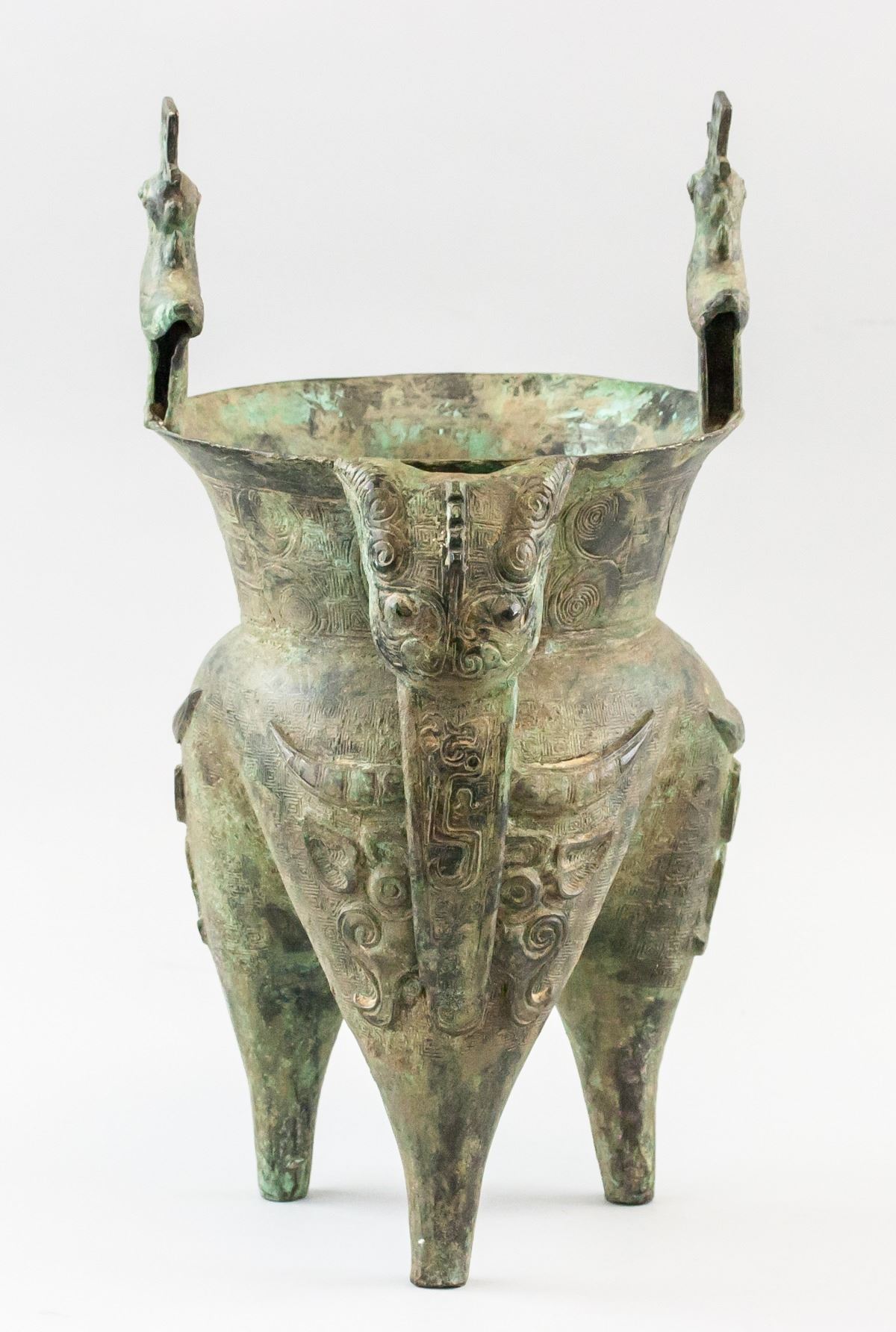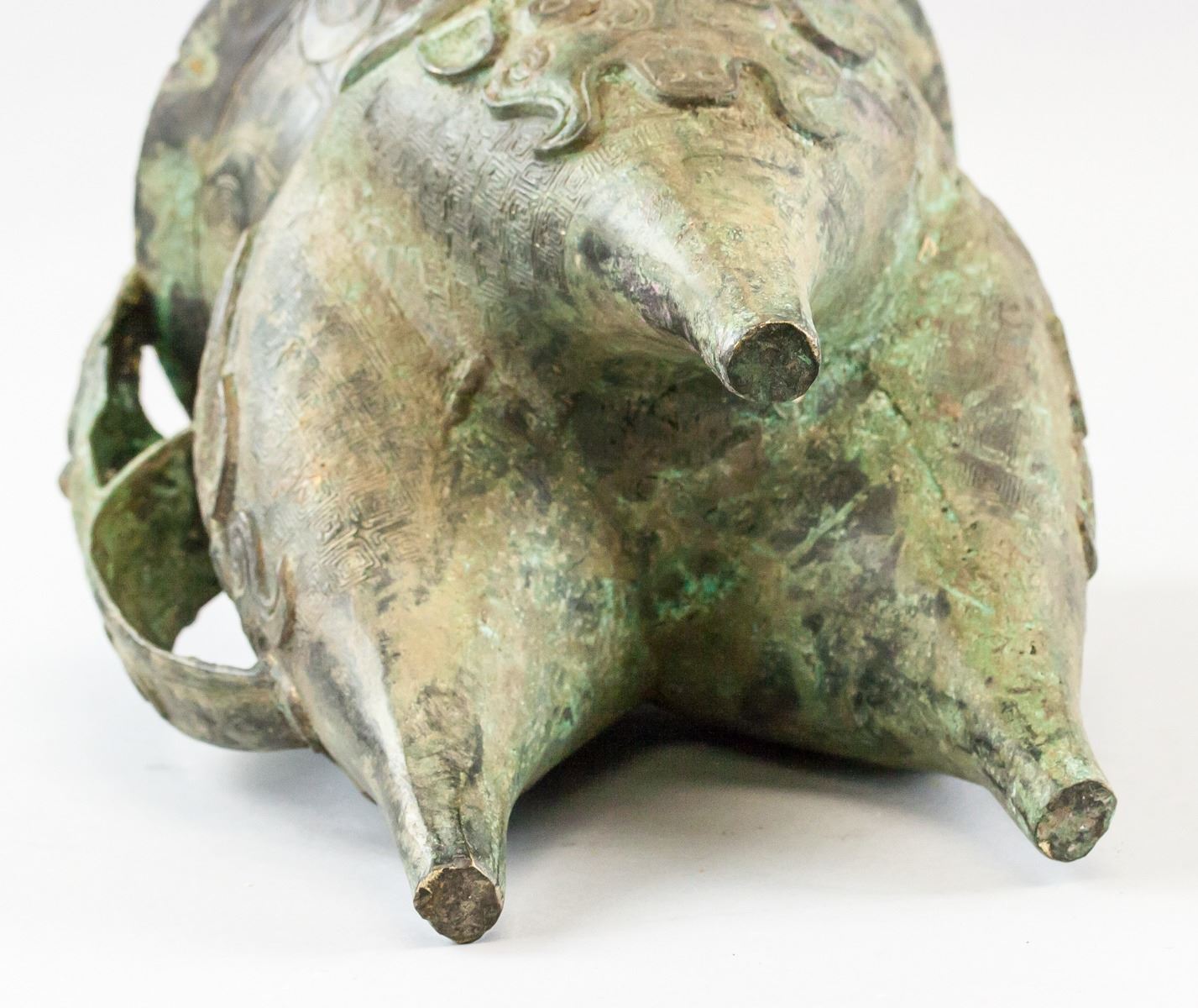 Chinese archaistic bronze He vessel. Featuring tripod and handle. Flanked with bird form ears. Decorated with beast pattern. 35 x 23 cm, 2940 grams