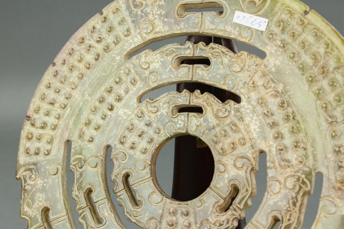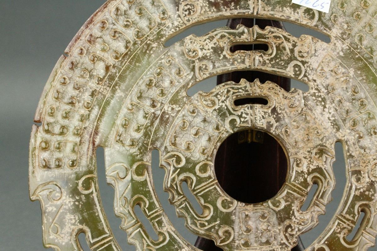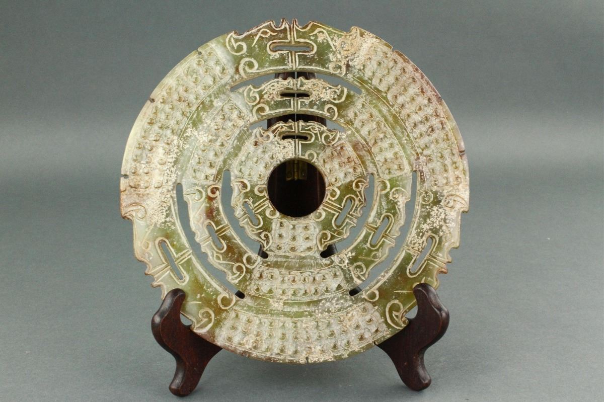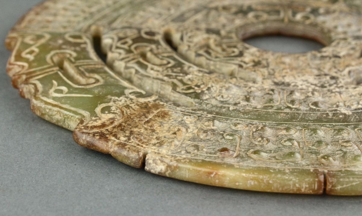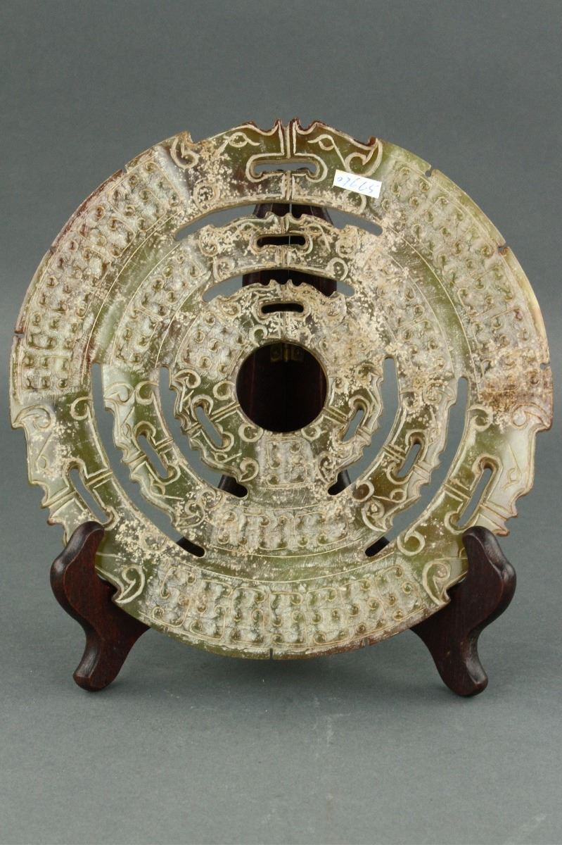 Chinese archaistic green jade carved Bi disk; of circular form; featuring carvings of dragon and grain pattern in relief; D: 19 cm, 386 grams