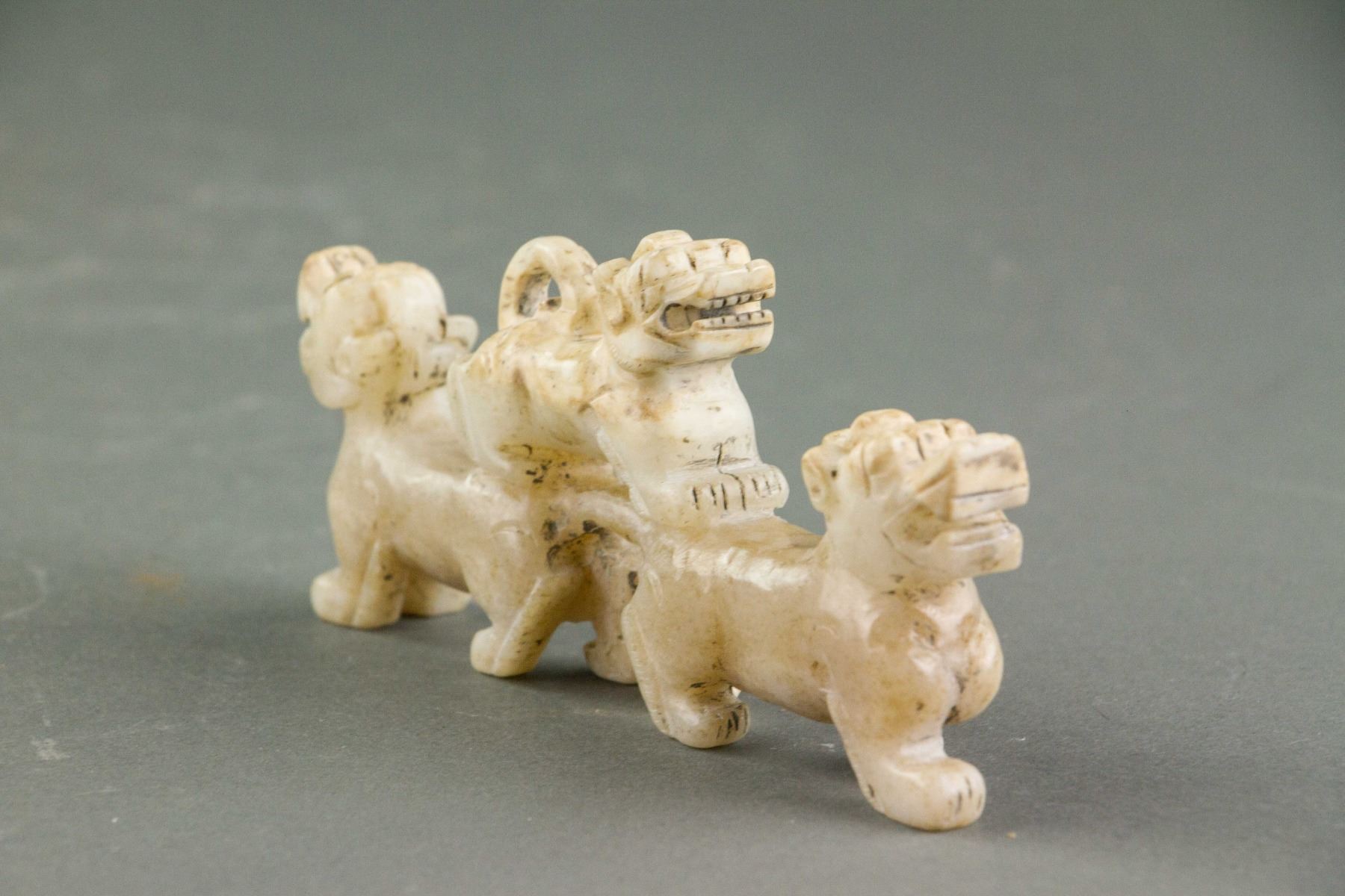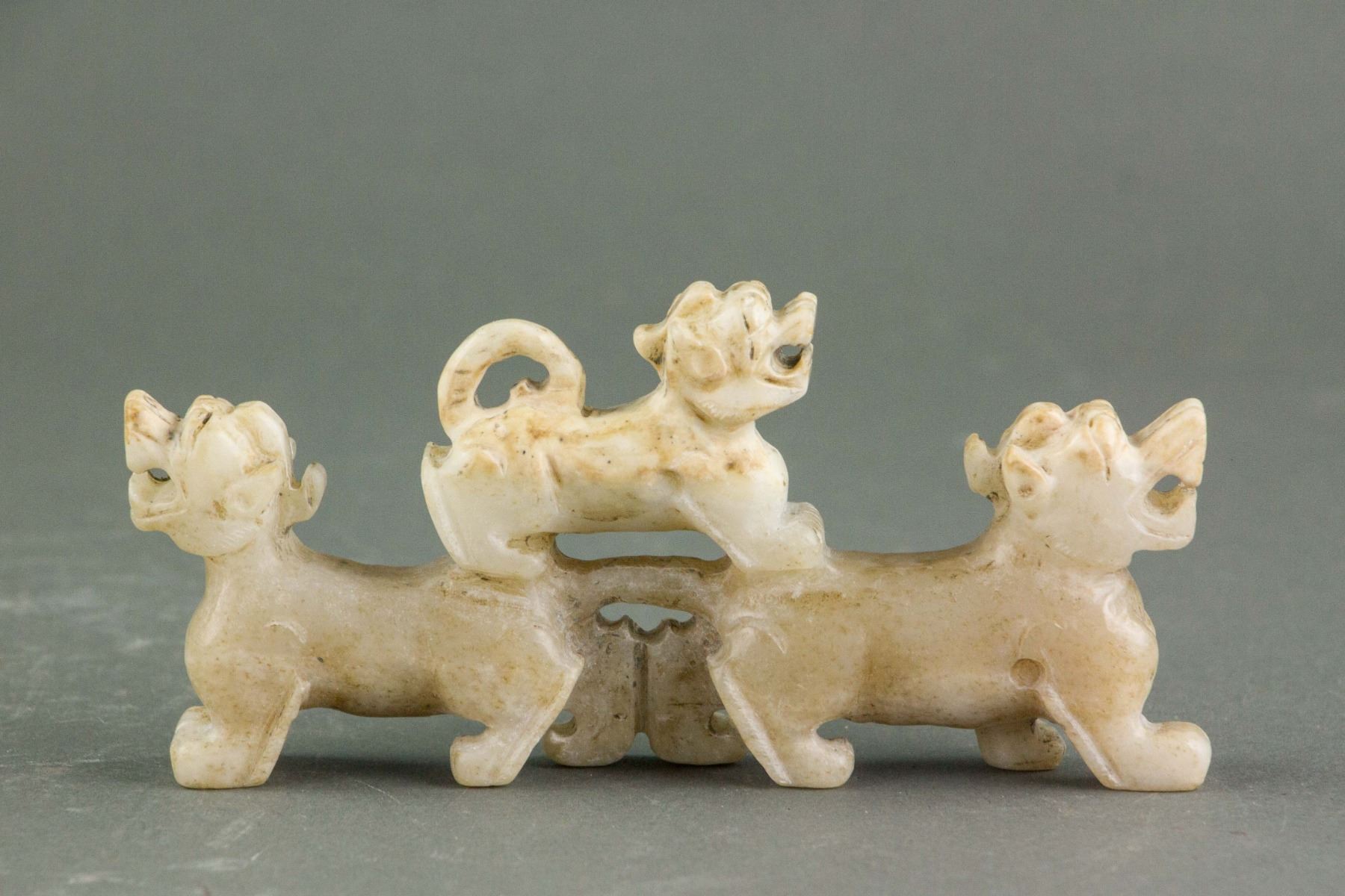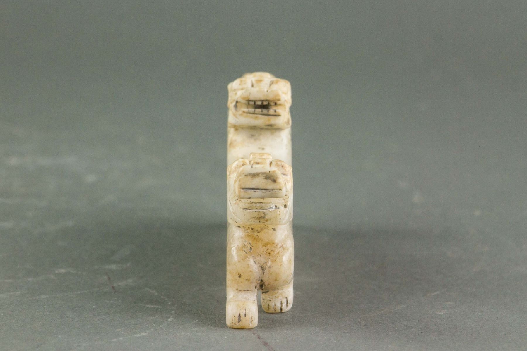 Chinese Hetian white jade carved archaistic toggle; carved with two big tigers and one small tiger; of yellowish white tone; 6 cm x 2 cm x 13 cm, 204 grams, Density: 2.93