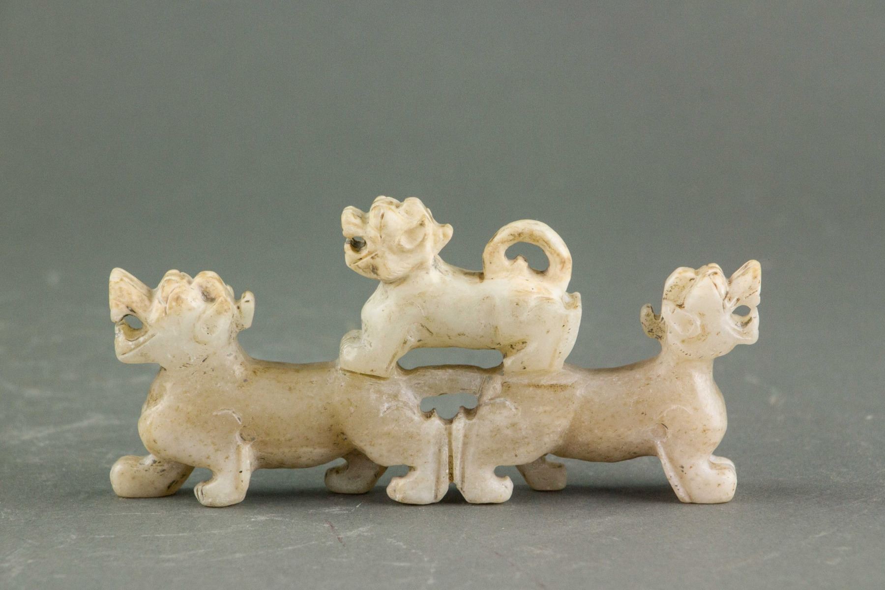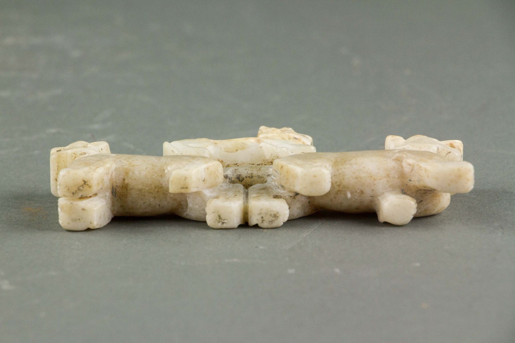 Chinese Hetian white jade carved archaistic toggle; carved with two big tigers and one small tiger; of yellowish white tone; 6 cm x 2 cm x 13 cm, 204 grams, Density: 2.93