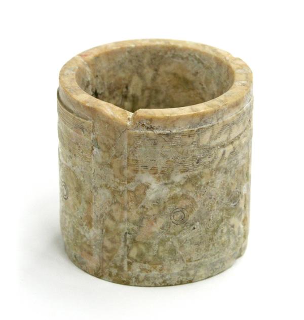 Chinese archaistic calcified jade ornament, the cylinder with four reserves featuring four 'masks' motifs based on a Liangzhu culture prototype (repairs), 2.8''h