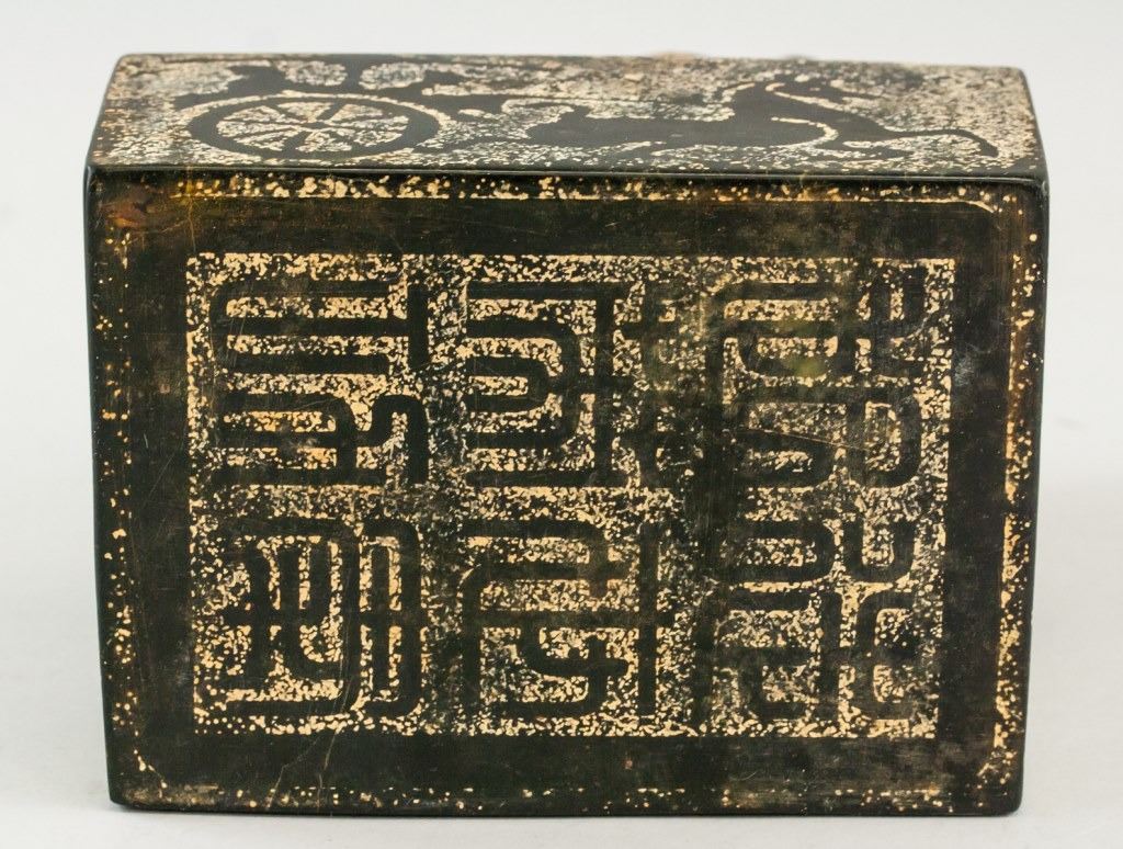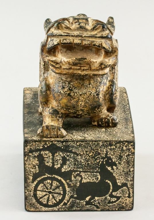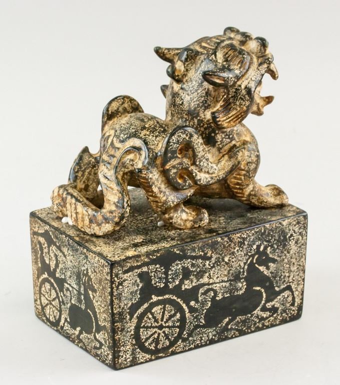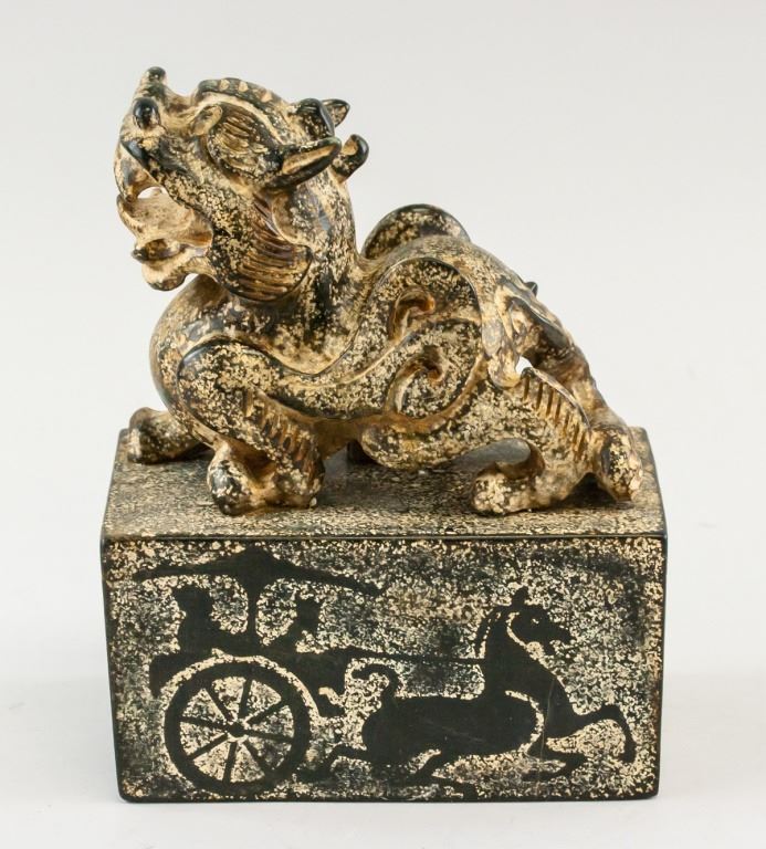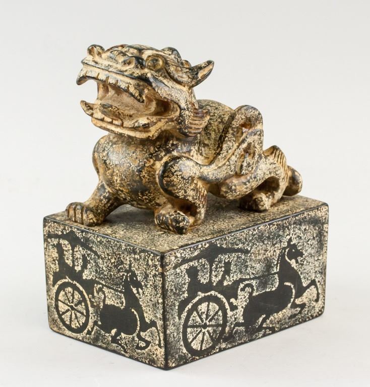 Chinese archaistic stone carved seal. Of rectangle section. Surmounted by a mythical beast. Carved with chariots on side. Six Chinese character in seal script on seal face. 19 x 11 x 15.5 cm, 4867 grams