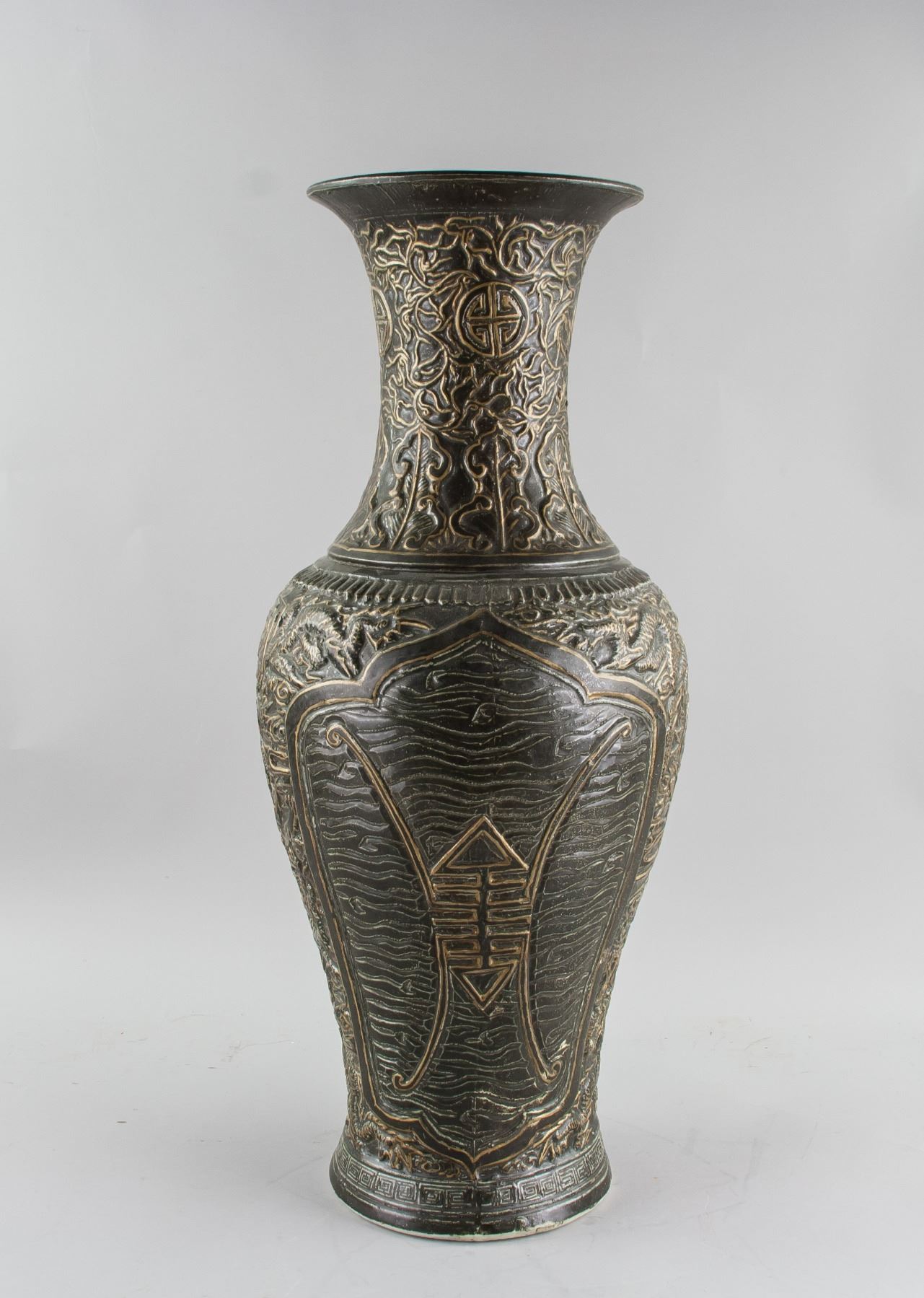 Archaistic Chinese porcelain vase; of baluster form body with narrowed neck and splayed mouth rim; carved with dragons and auspicious pattern; covered by bronze-like glaze; 43 cm x 23 cm, 3926 grams