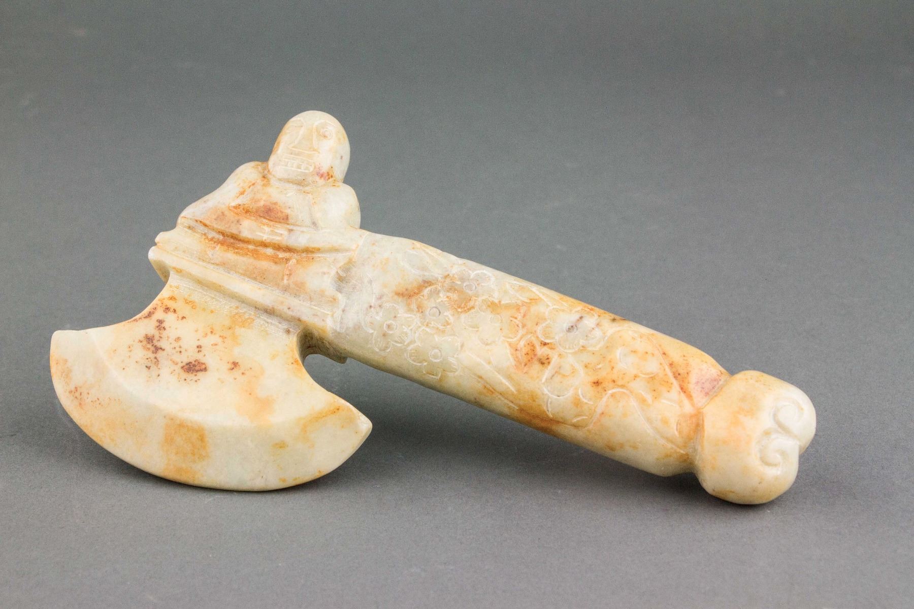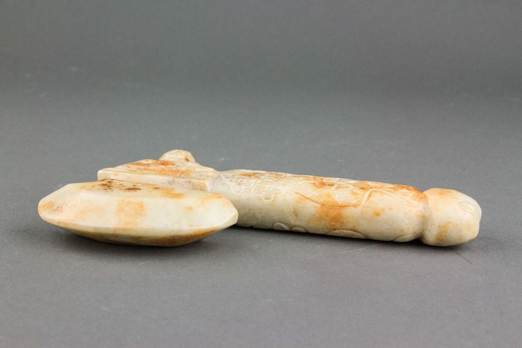 Chinese archaistic style jade carved axe; carved in axe form; handle carved with coin pattern; of yellowish white tone; 11 cm x 19 cm, 464 grams