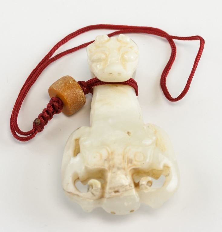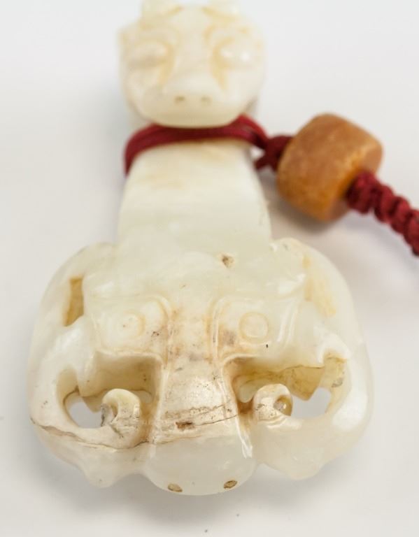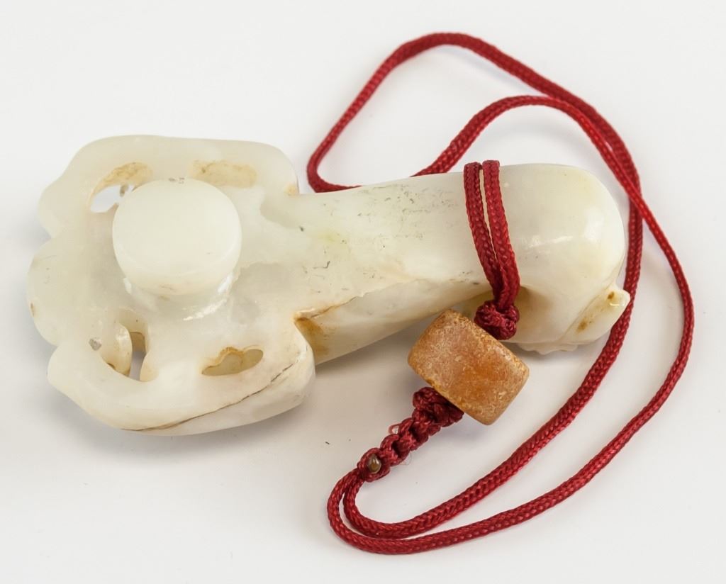 Chinese jade pendant. Of white tone. Carved in dragon form. With red string. L: 6 cm. W: 3.5 cm. 35 grams.