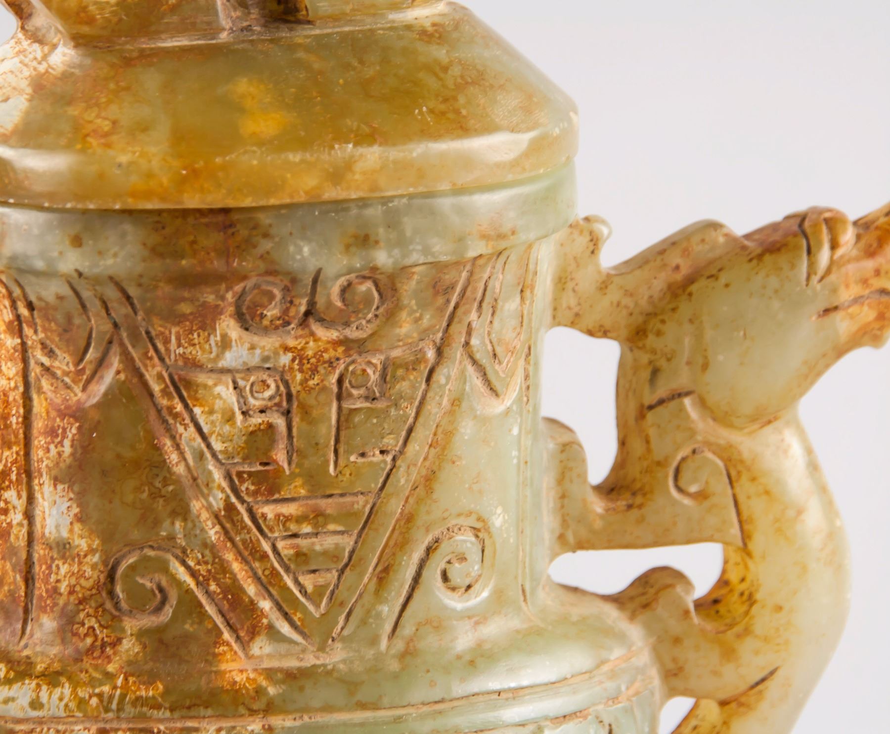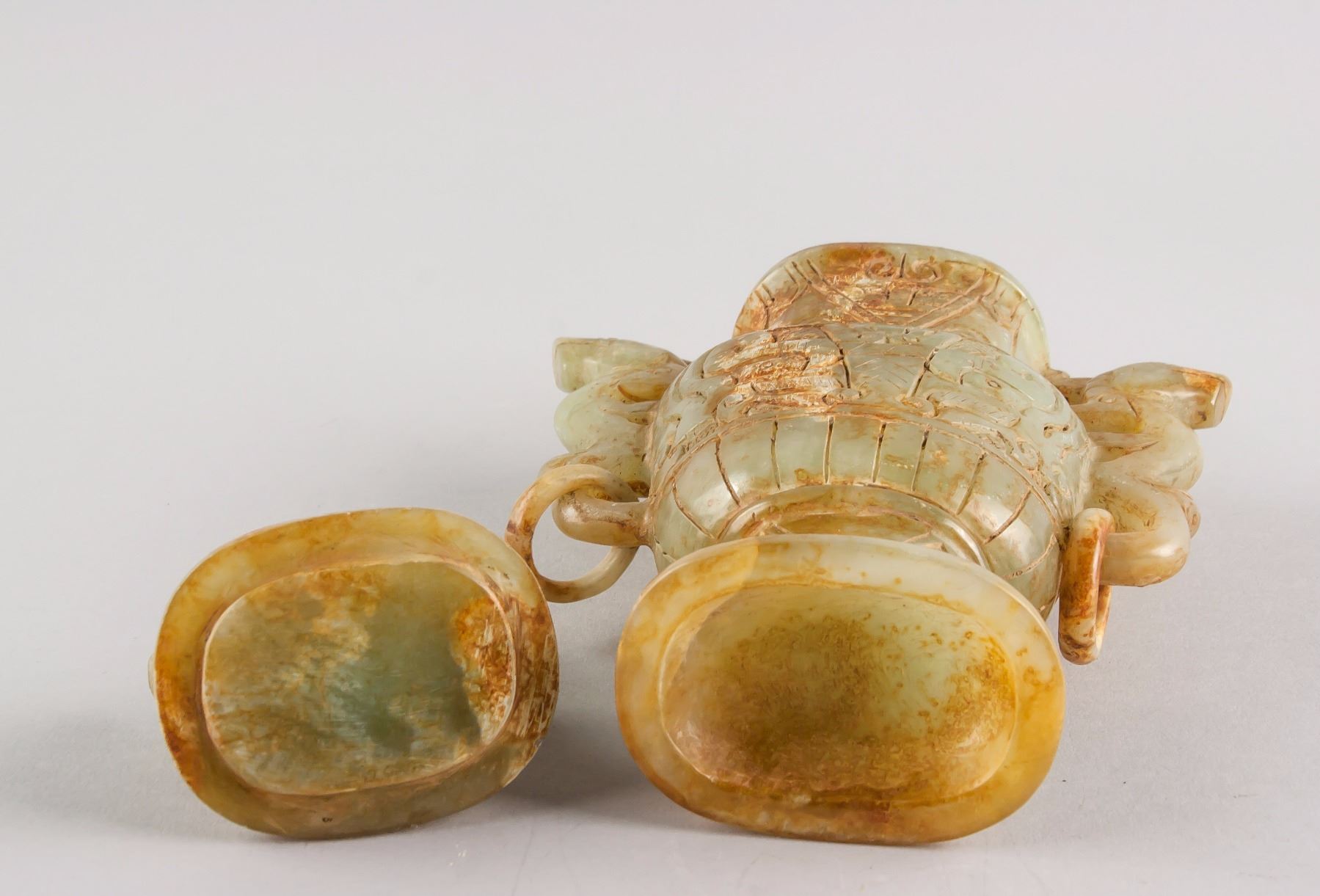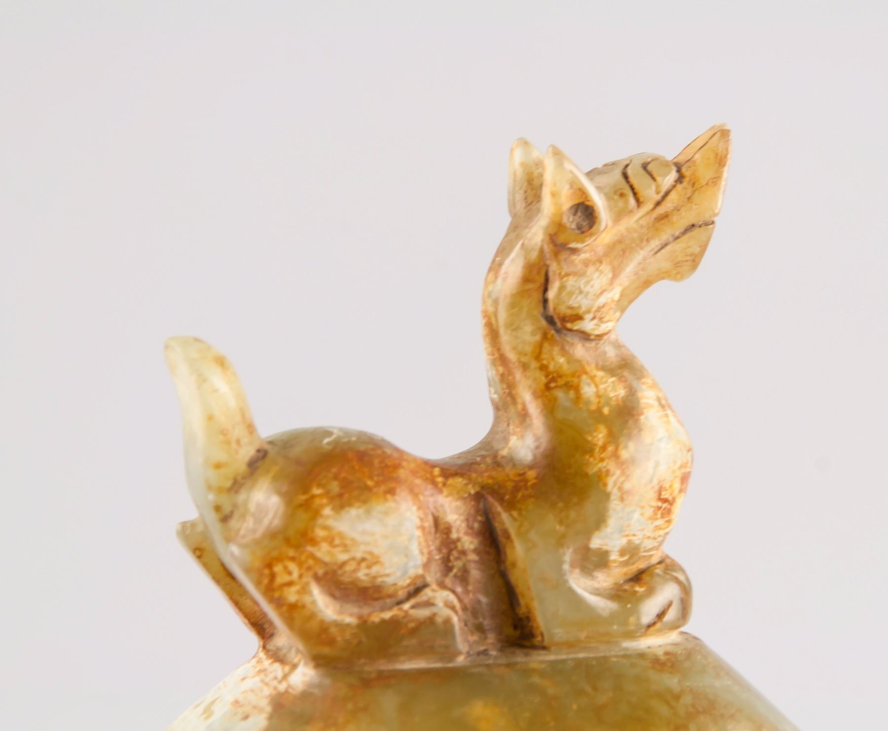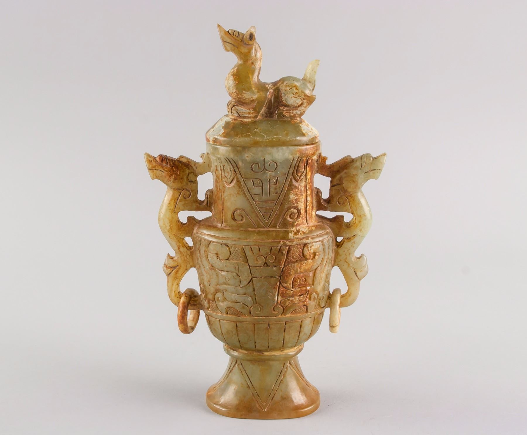 Chinese archaistic yellow jade carved vase; of flatten baluster form body; flanked with two dragon from handles with rings; cover surmounted by crouching tigers; carved with beast pattern on surface; 24 cm x 15 cm, 1175 grams