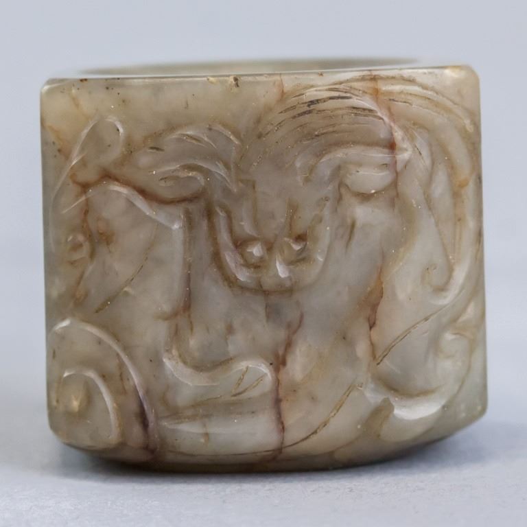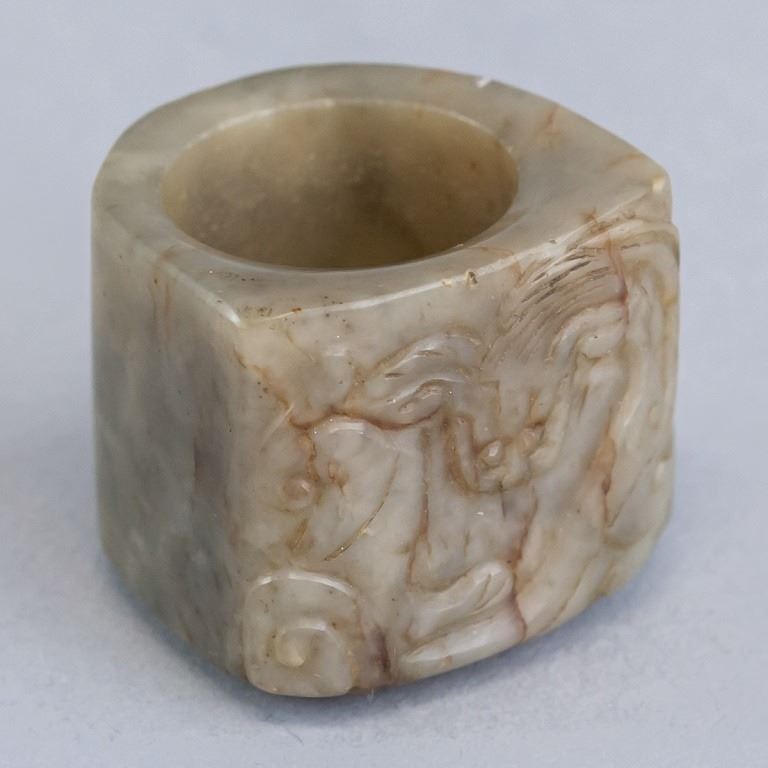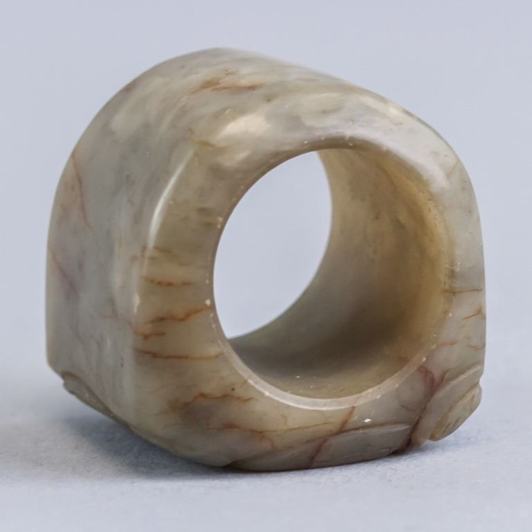 Chinese archer's ring. Of white tone with russet streaks. Carved in relief. 18th century or later. 3 x 4 cm. 43 grams.