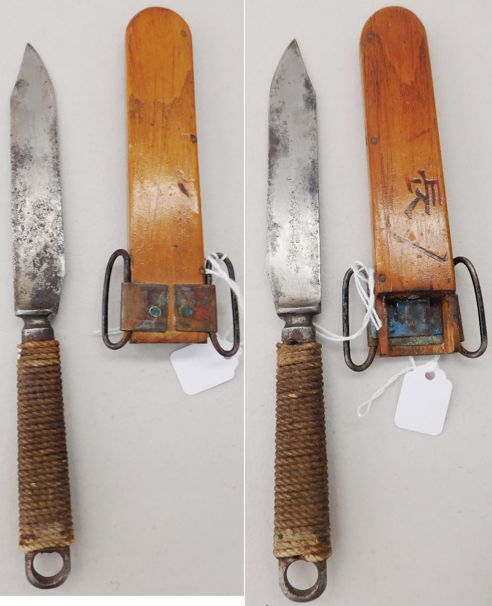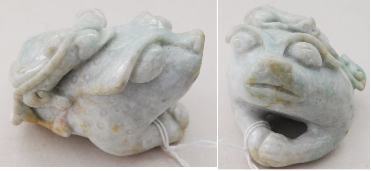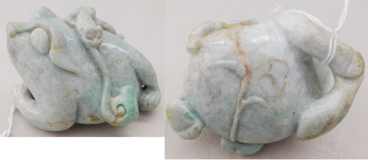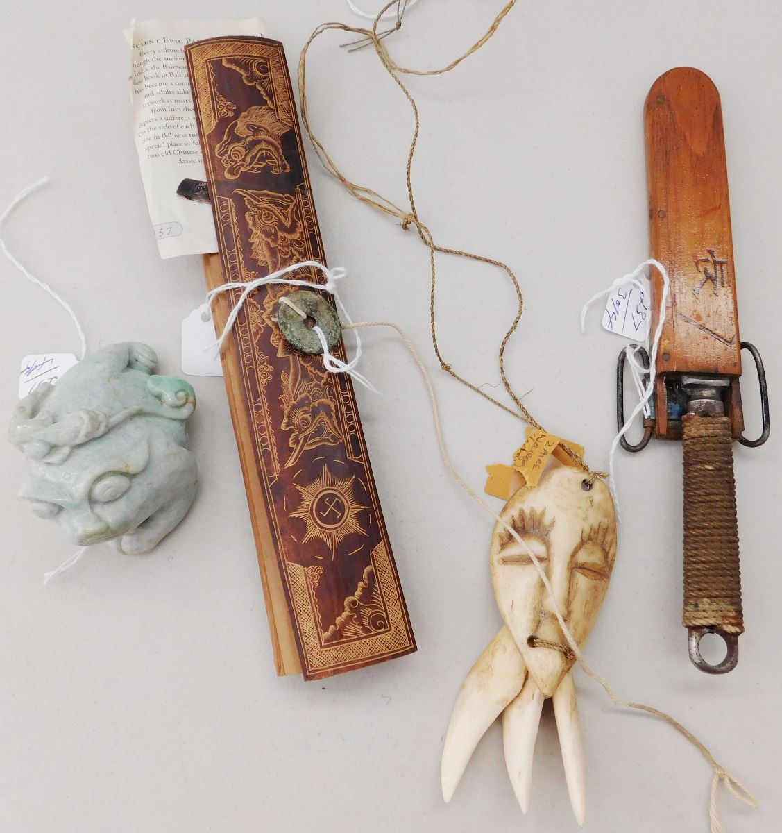 Chinese Artifact Collection, Pre-WWII items. Lot contains jade, bamboo, steel and bone. The scroll measures 10", the knife 9.5", the frog 3.5", and the mask is 3". From China. Jade frog possibly a Ming Dynasty item. Condition: Good, scroll needs re-stringing, see images. Shipping: $22.00