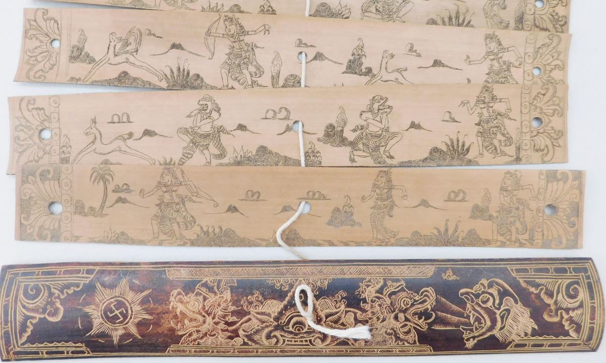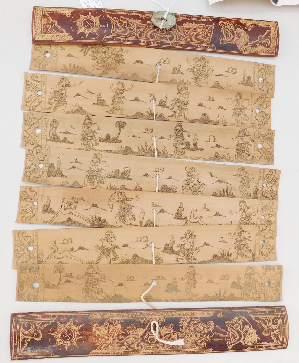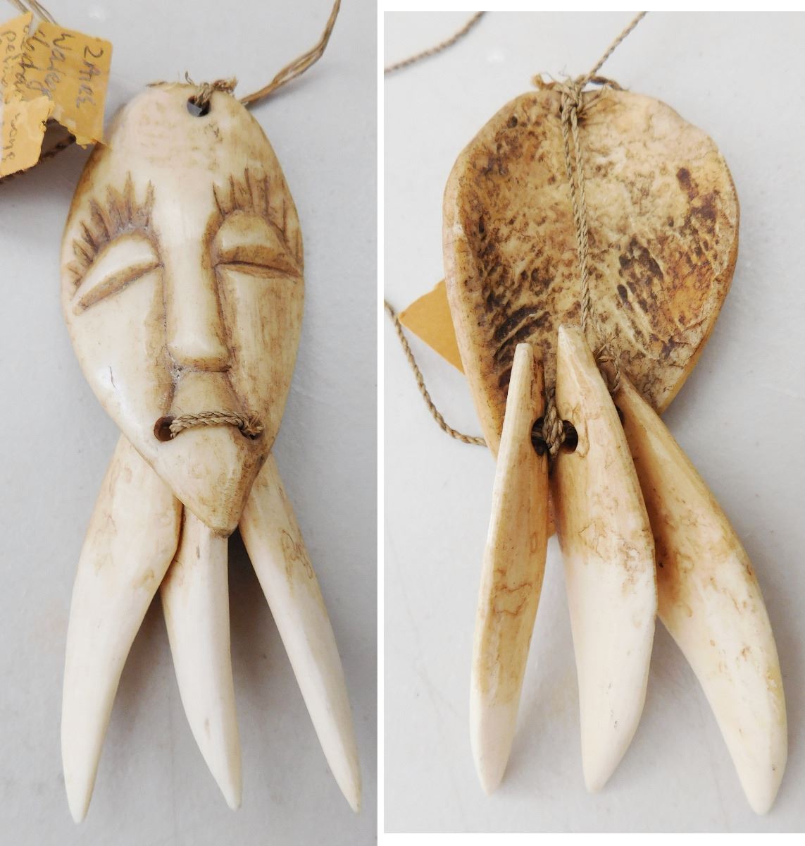 Chinese Artifact Collection, Pre-WWII items. Lot contains jade, bamboo, steel and bone. The scroll measures 10", the knife 9.5", the frog 3.5", and the mask is 3". From China. Jade frog possibly a Ming Dynasty item. Condition: Good, scroll needs re-stringing, see images. Shipping: $22.00