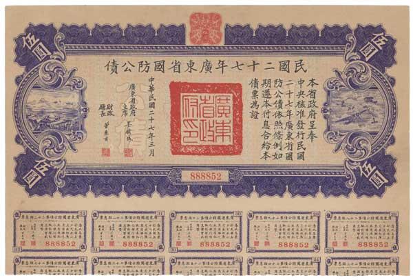 China. Bond. Purple with red markings. Left border vignette of military canons protecting the bay. Right border vignette of planes in a “dog fight”. Attached coupons. Uncancelled and very fine.